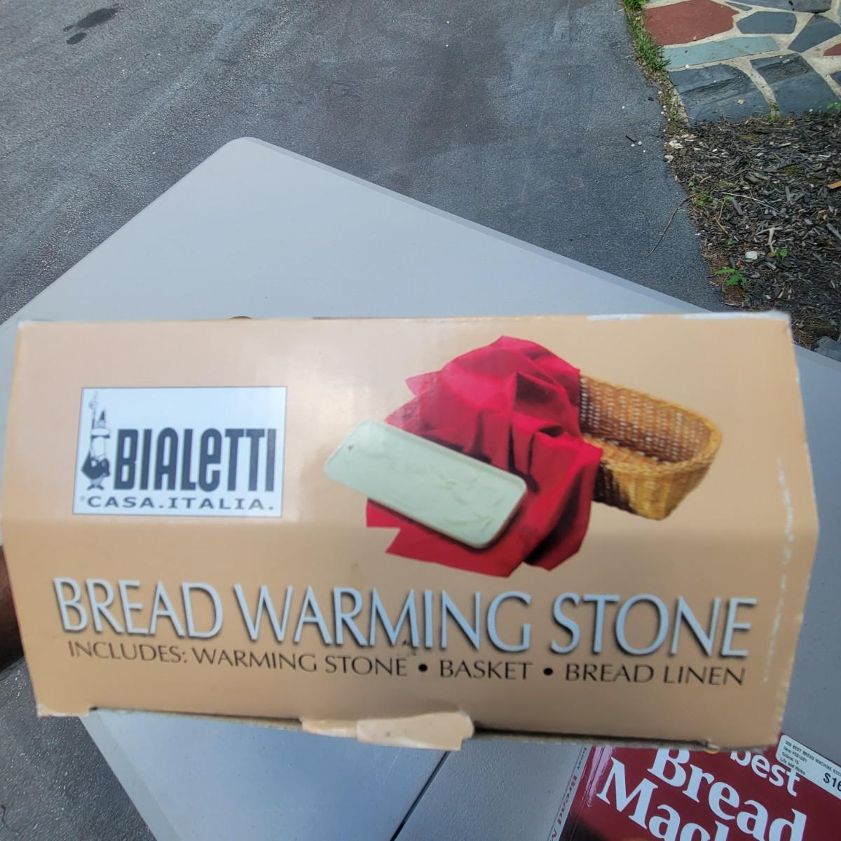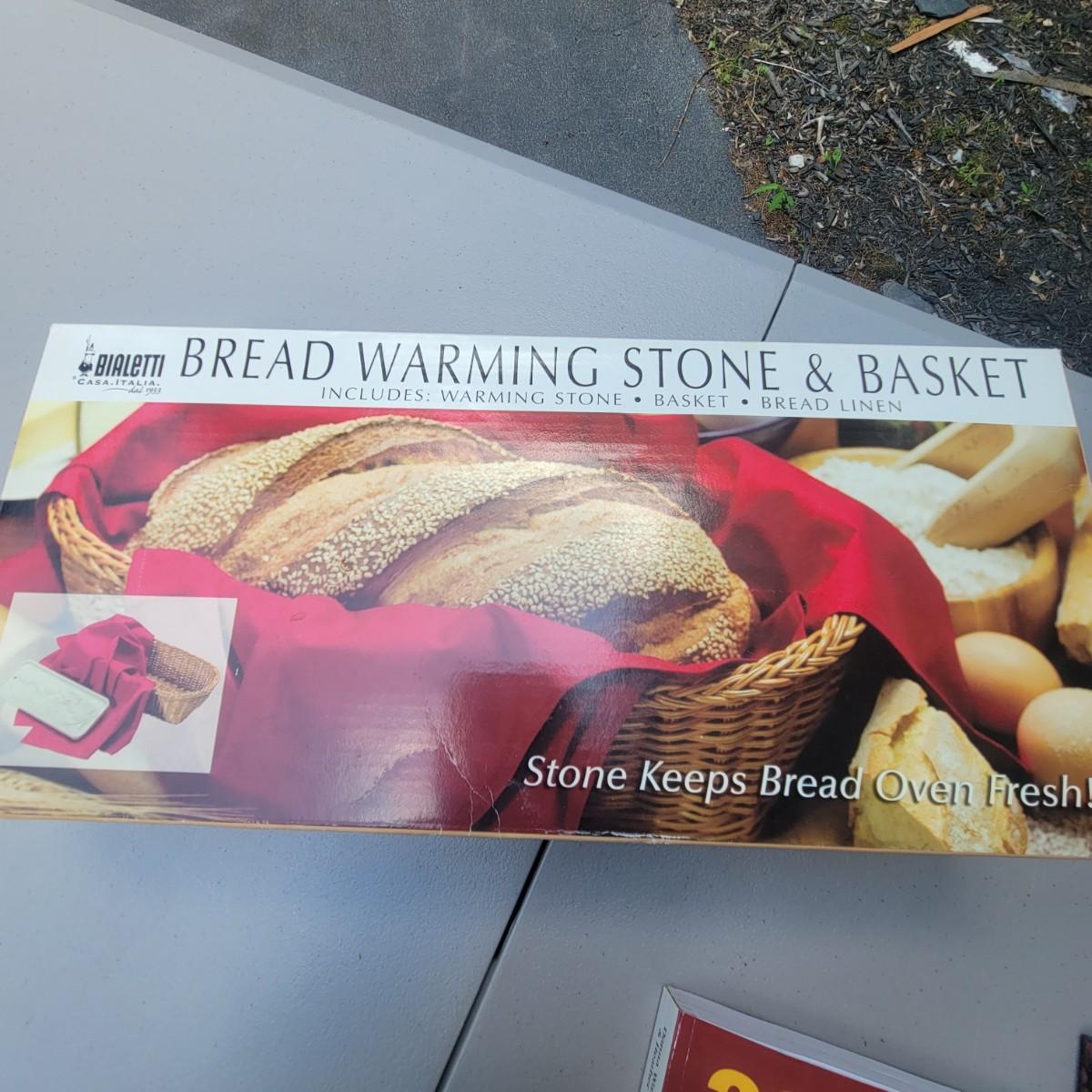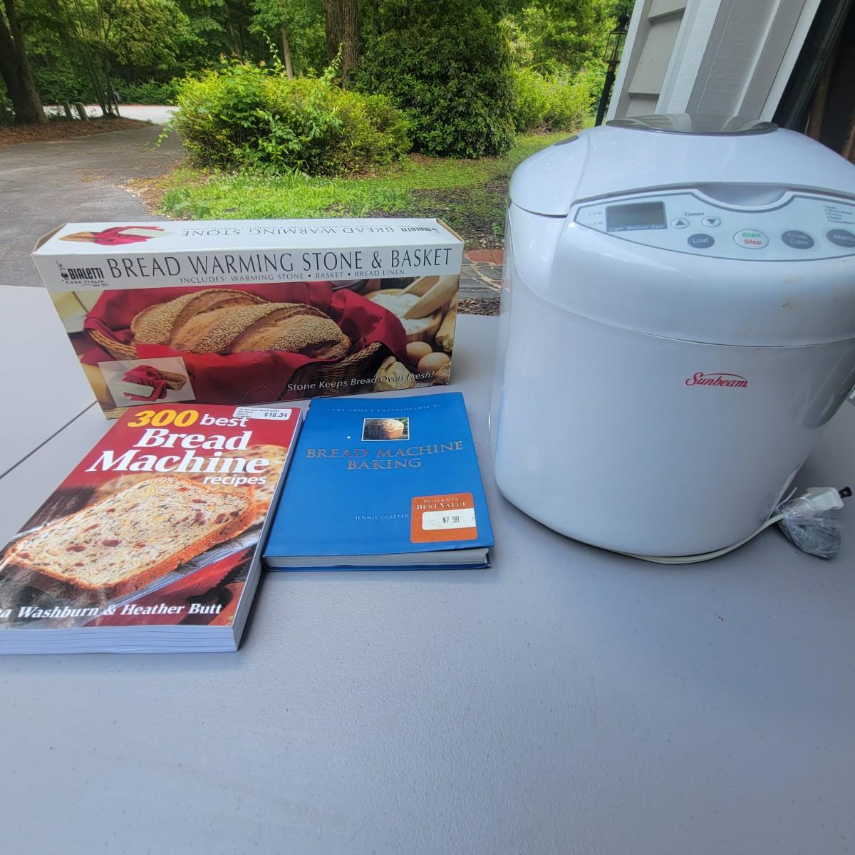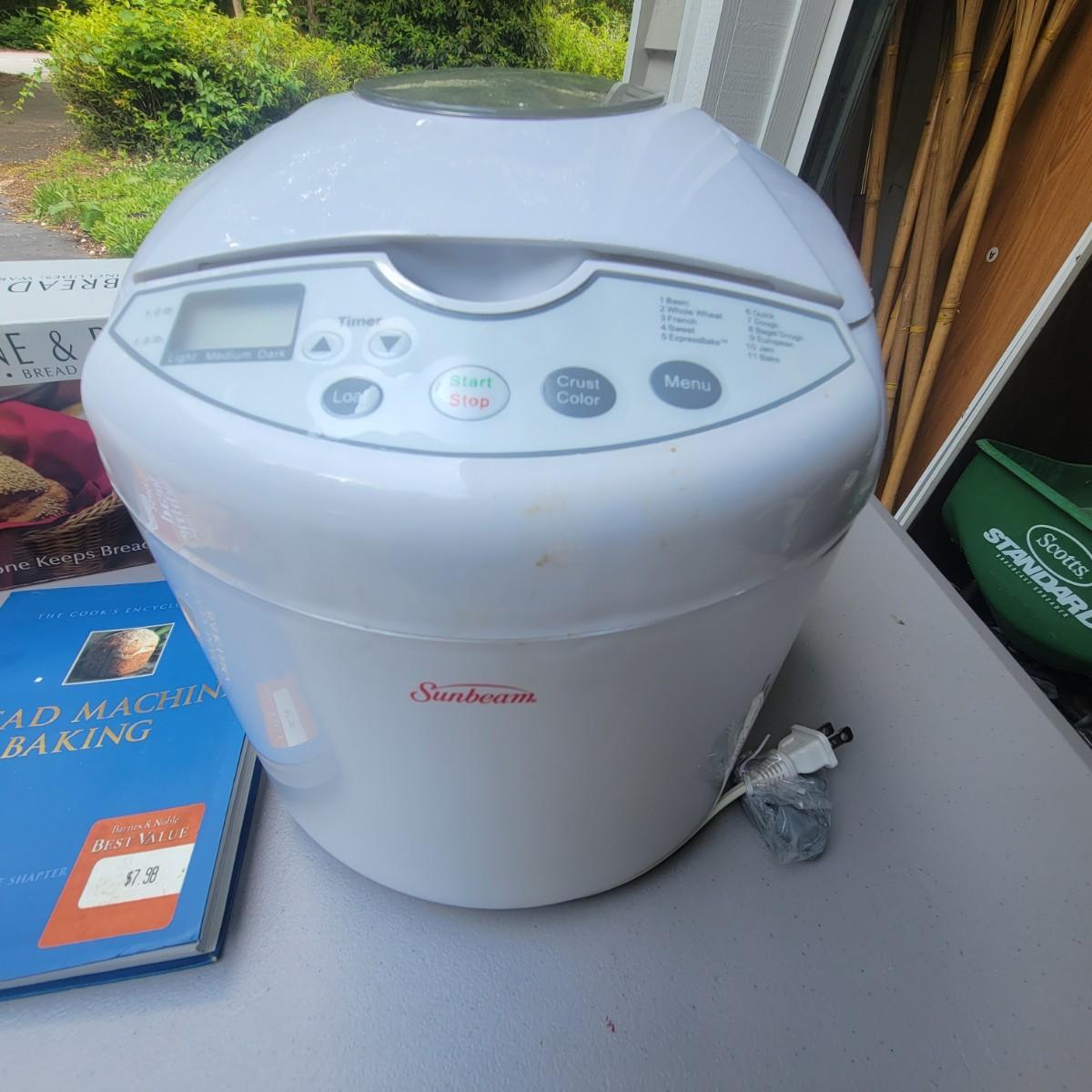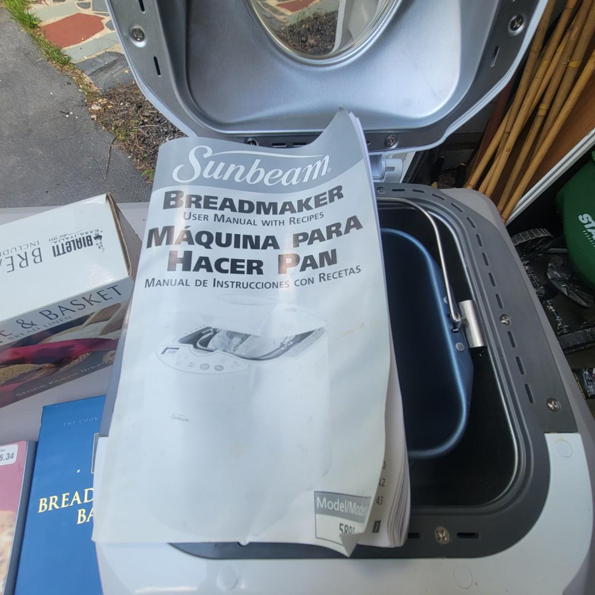 Sunbeam bread maker in good condition. Tested and power came in. Measures approximately 10" x 13" x 11". Also includes bread warming stone and basket, plus 2 bread machine recipe books. Local pickup only