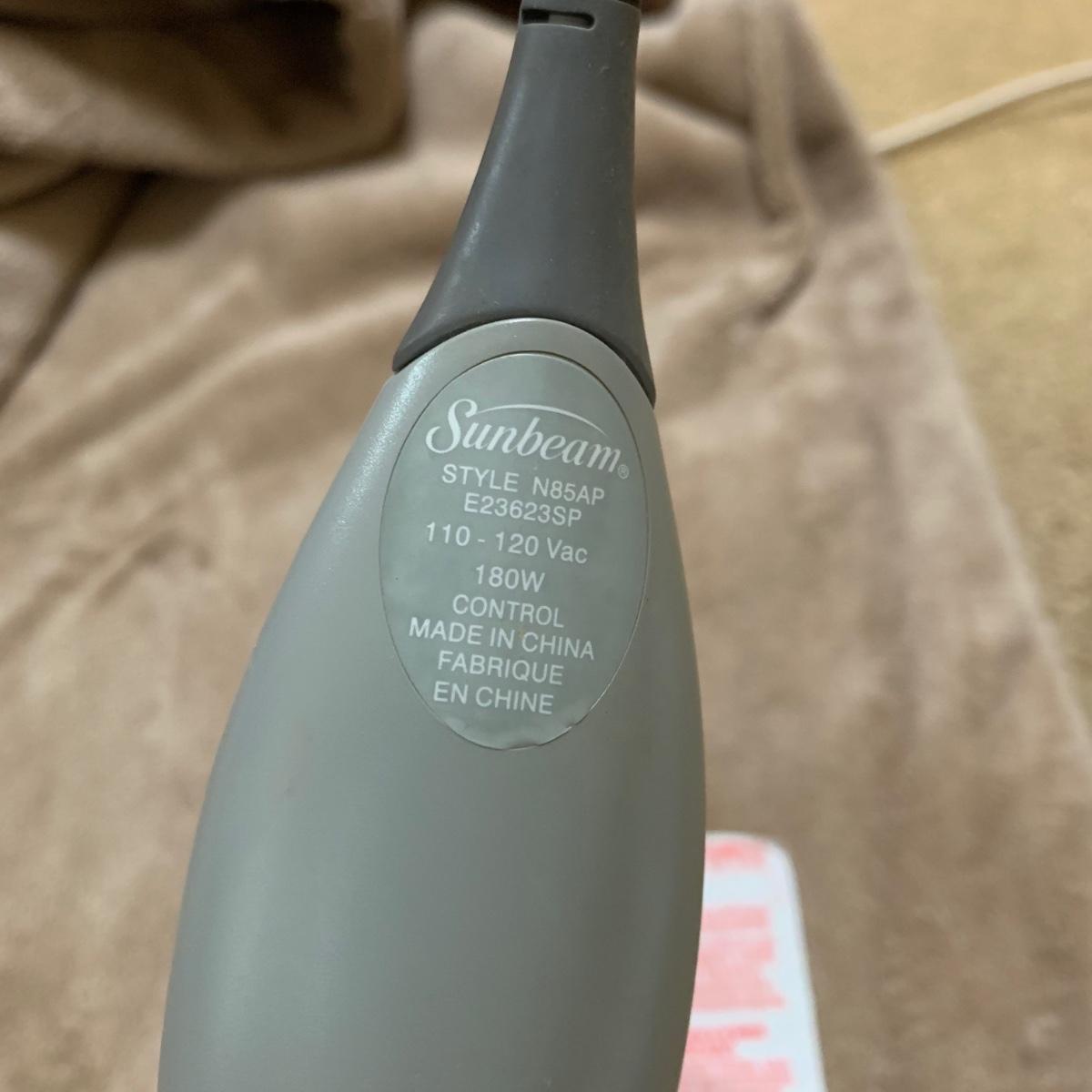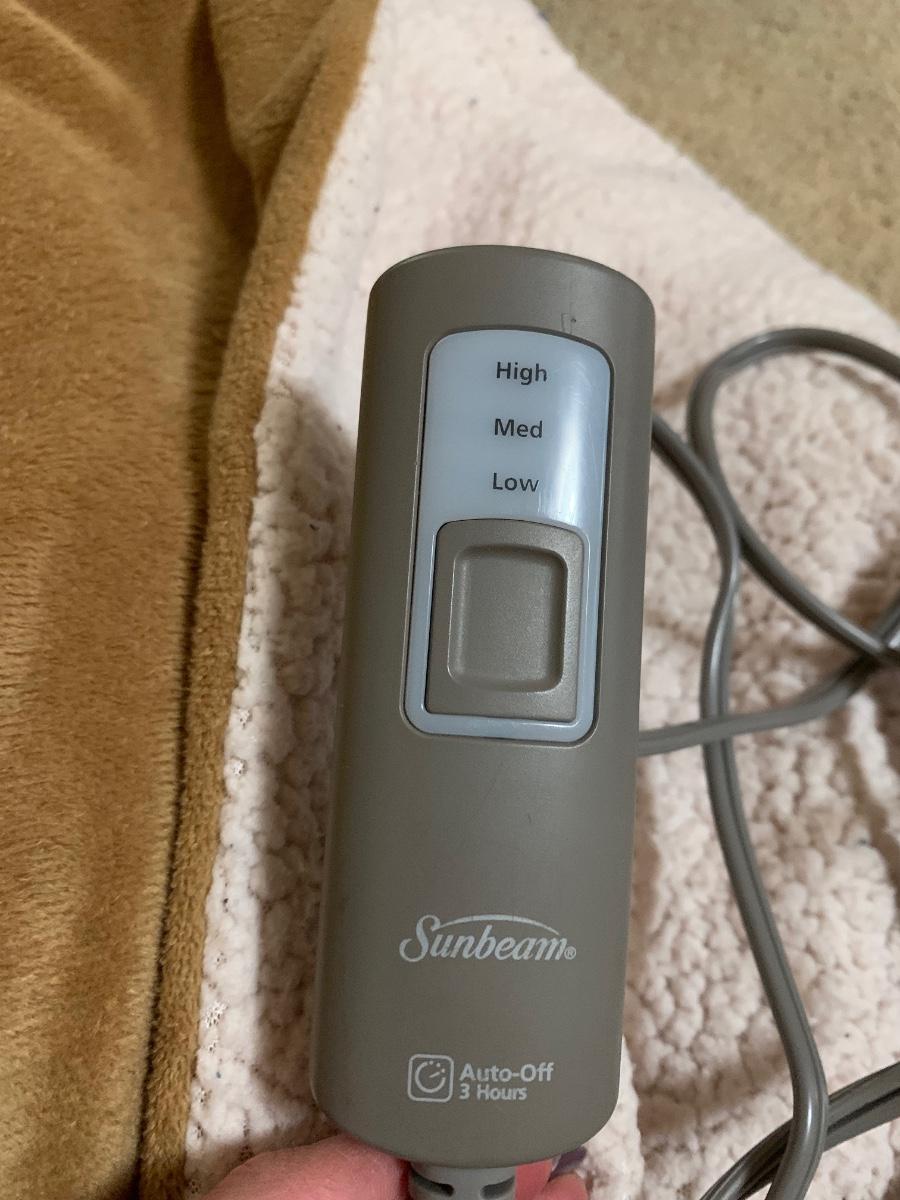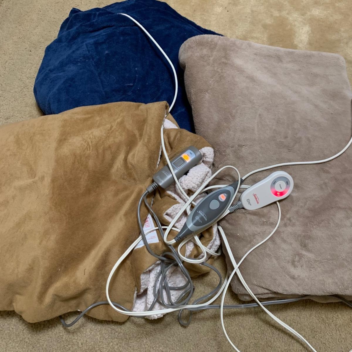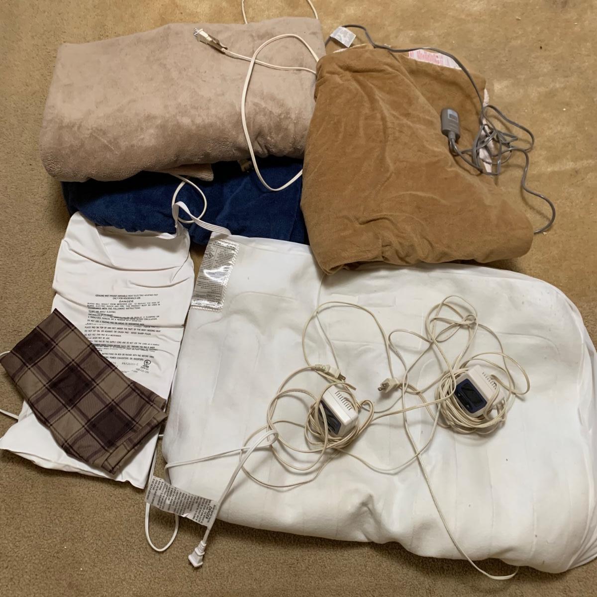 Three Sunbeam electric warming throws, a Sunbeam Genuine Wet Proof Variable Heat Electric Heating Pad with removable fabric cover, and a queen size warming mattress pad by Cozy Max. The mattress pad has an extra control unit. All items turned on when tested. The three throws show some wear, the blue one more than the others (loose threads).