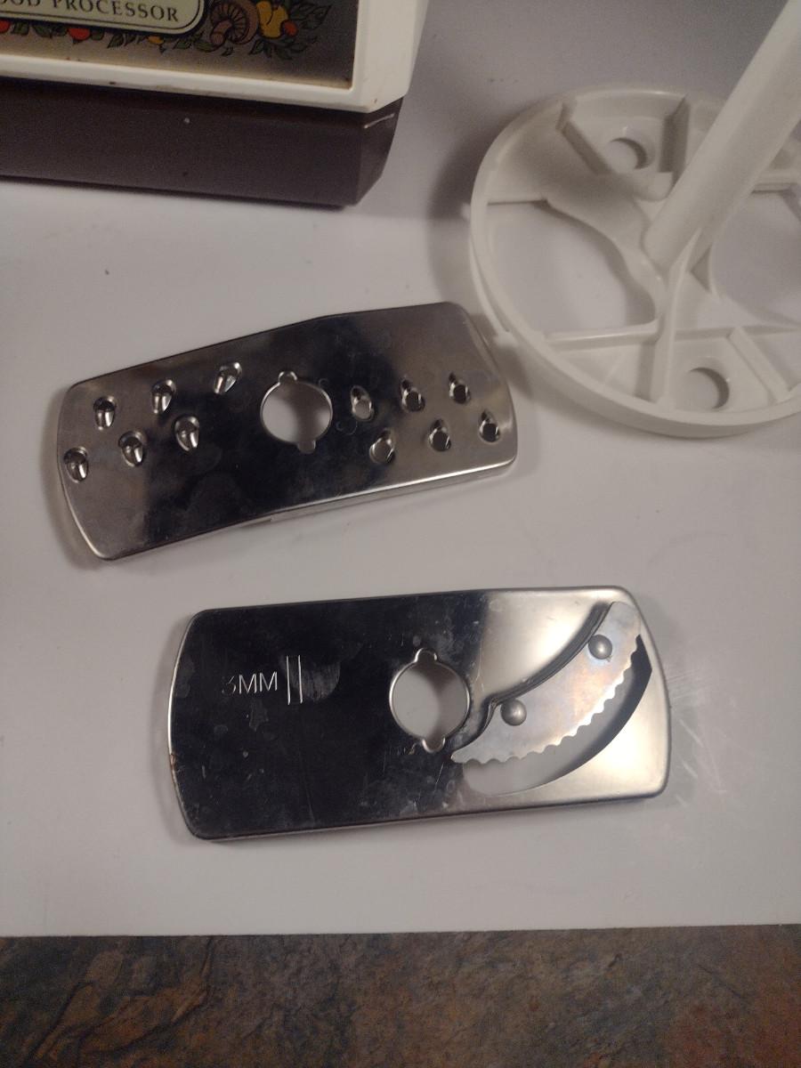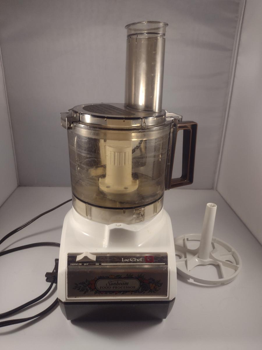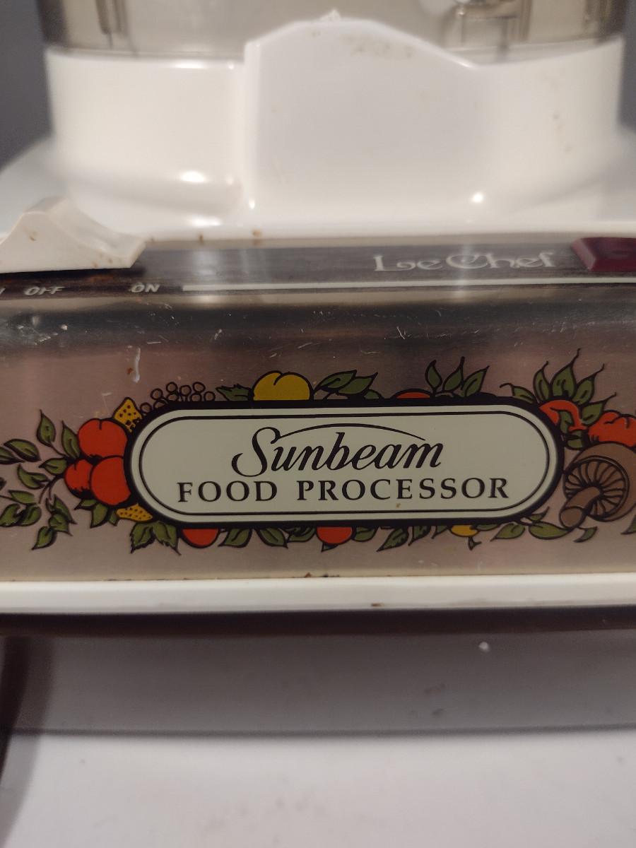 Sunbeam Food Processor. Includes regular, slicer, and grater blades. Item turns on.