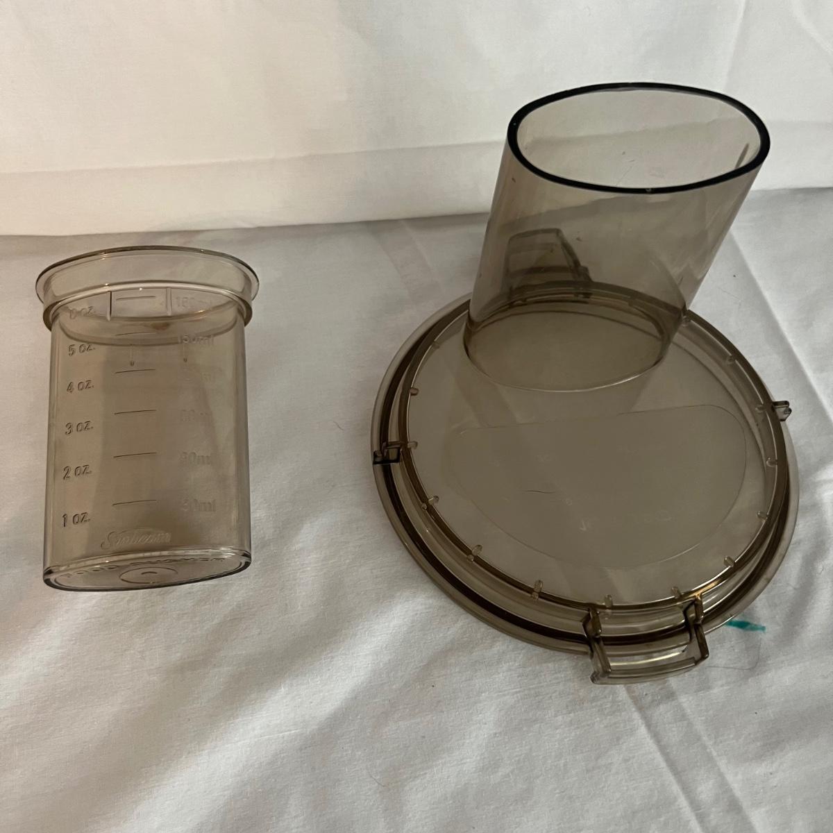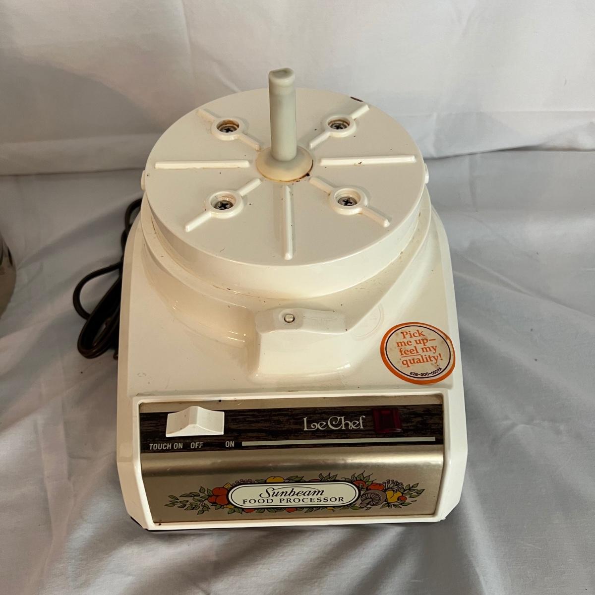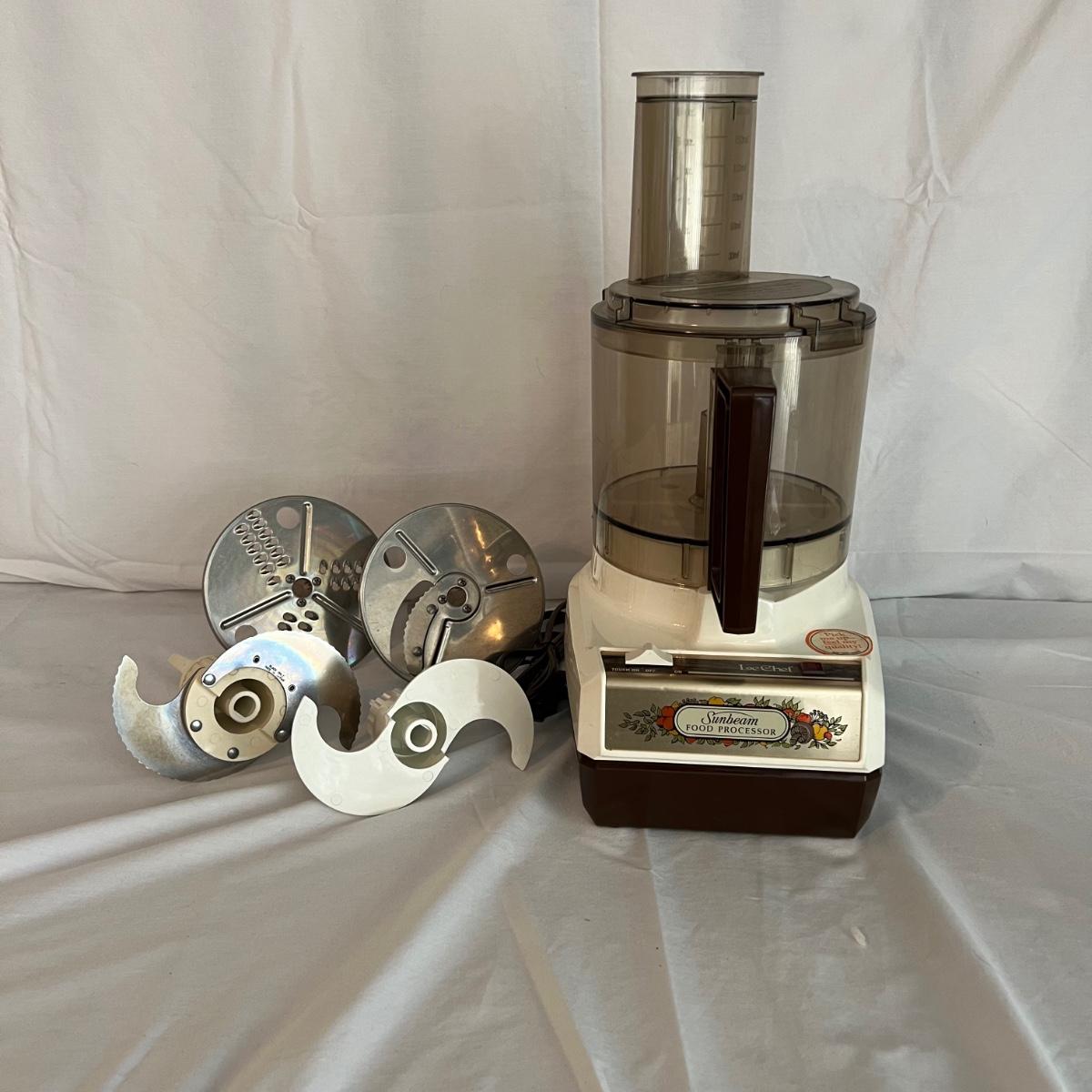 A Sunbeam food processor with attachments. Dough blade, grater, chopping blade and slicer. Appliance powered on when plugged in. Stands 17"H when assembled.