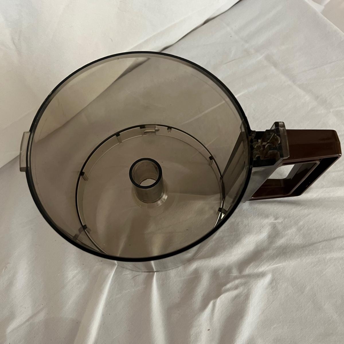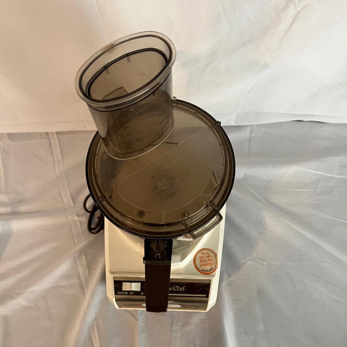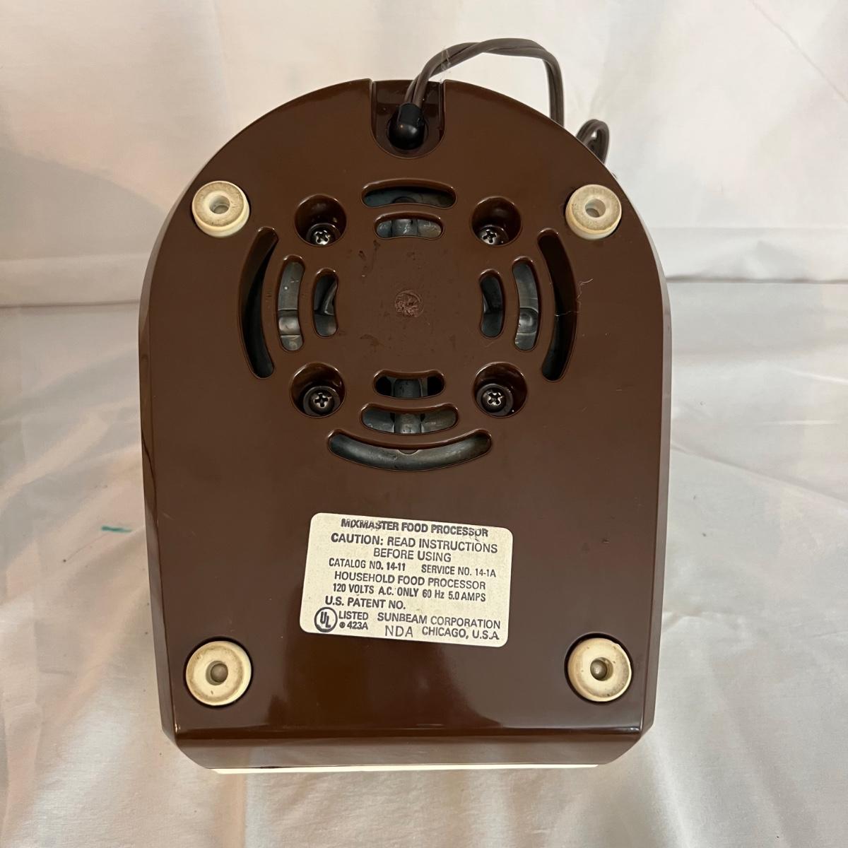 A Sunbeam food processor with attachments. Dough blade, grater, chopping blade and slicer. Appliance powered on when plugged in. Stands 17"H when assembled.