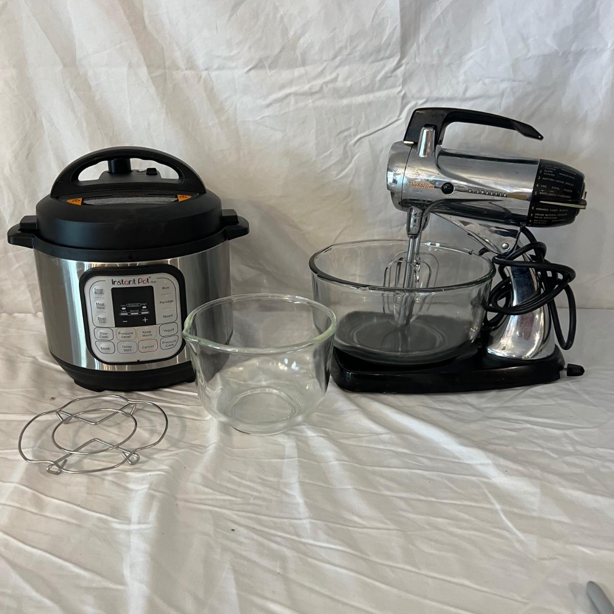 A Sunbeam mixmaster stand mixer with two bowls. Also a 3 Qt. Instapot with a stainless steal insert and rack.