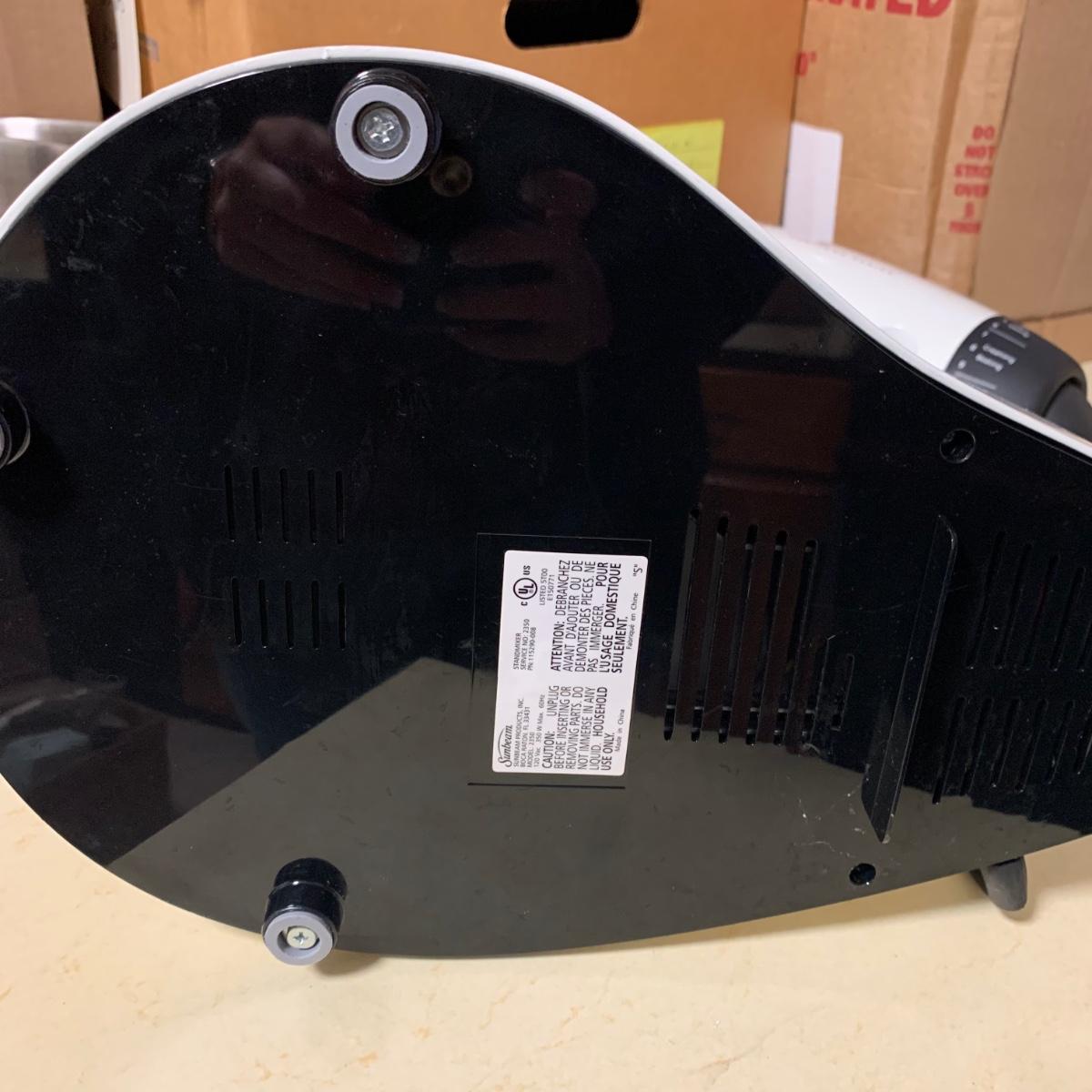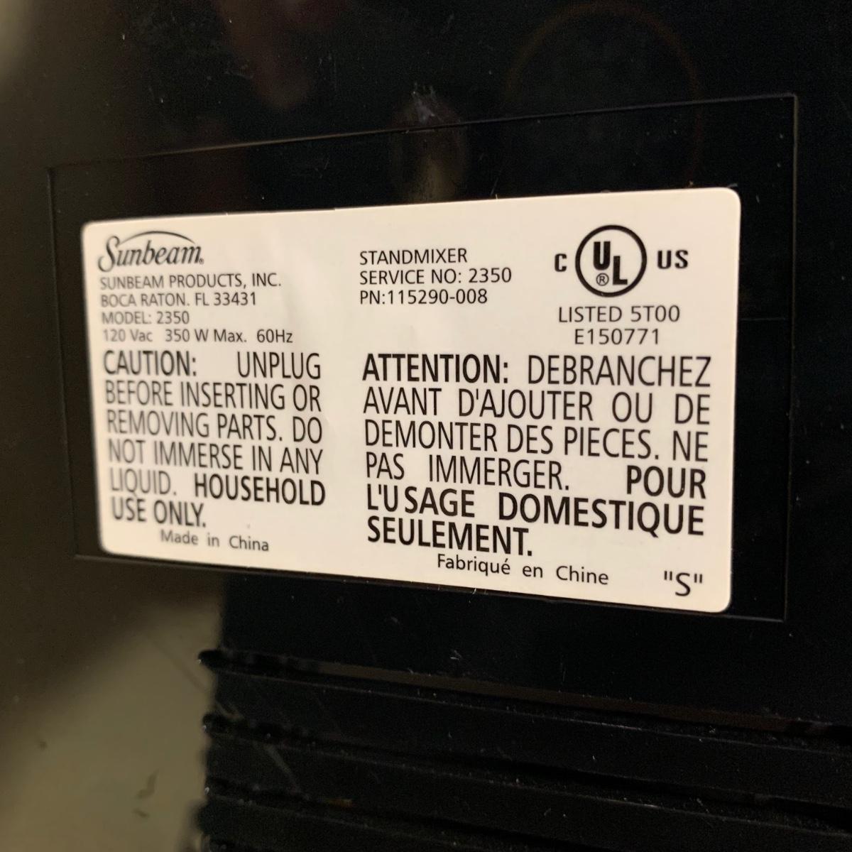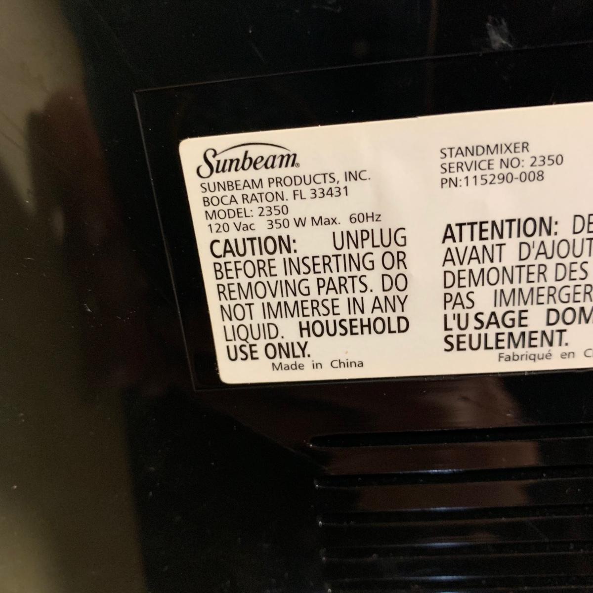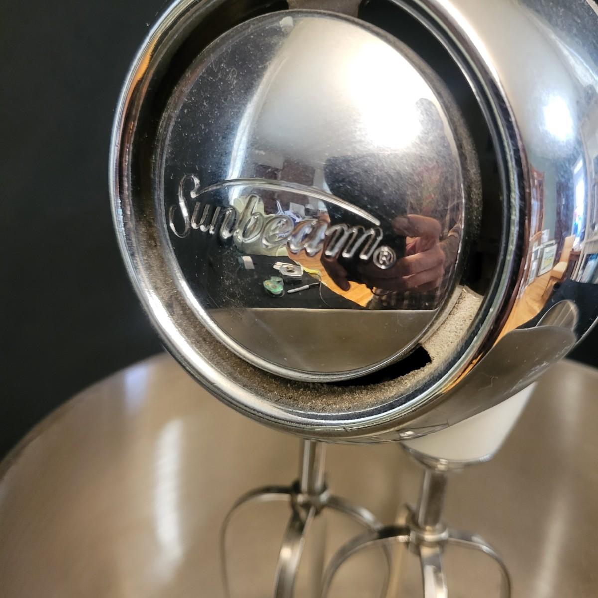 A Sunbeam Heritage Series stand mixer in good condition with no notable damage. Item was tested and works. Included is a pair of dough hooks, two mixing bowls of different sizes. Stand Mixer measures approximately 13" x 9" x 14.5". Model 2350. Shipping available.