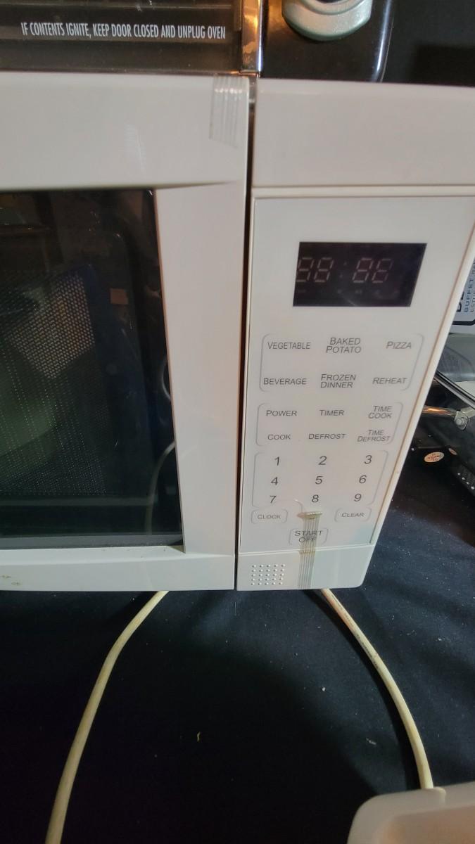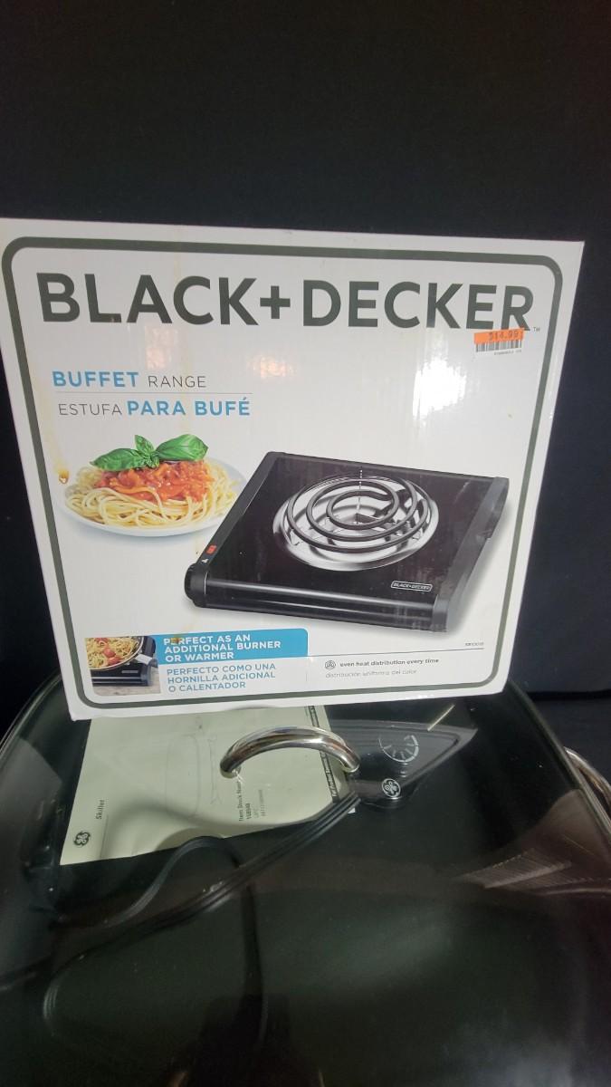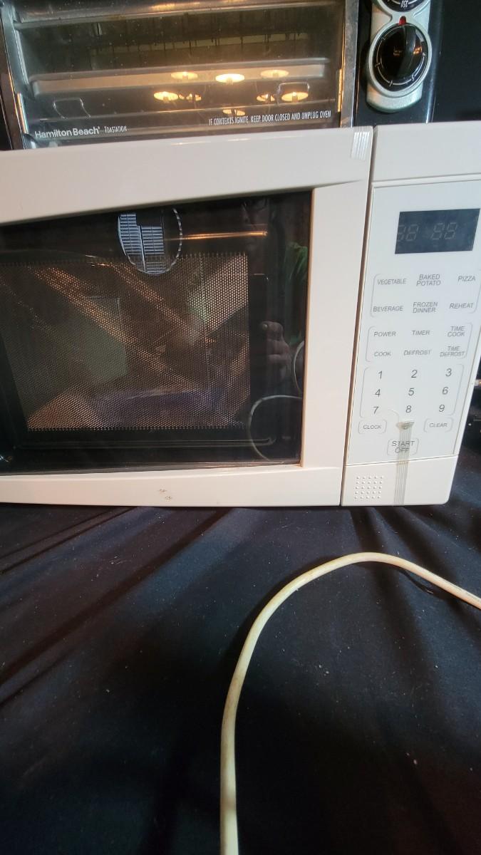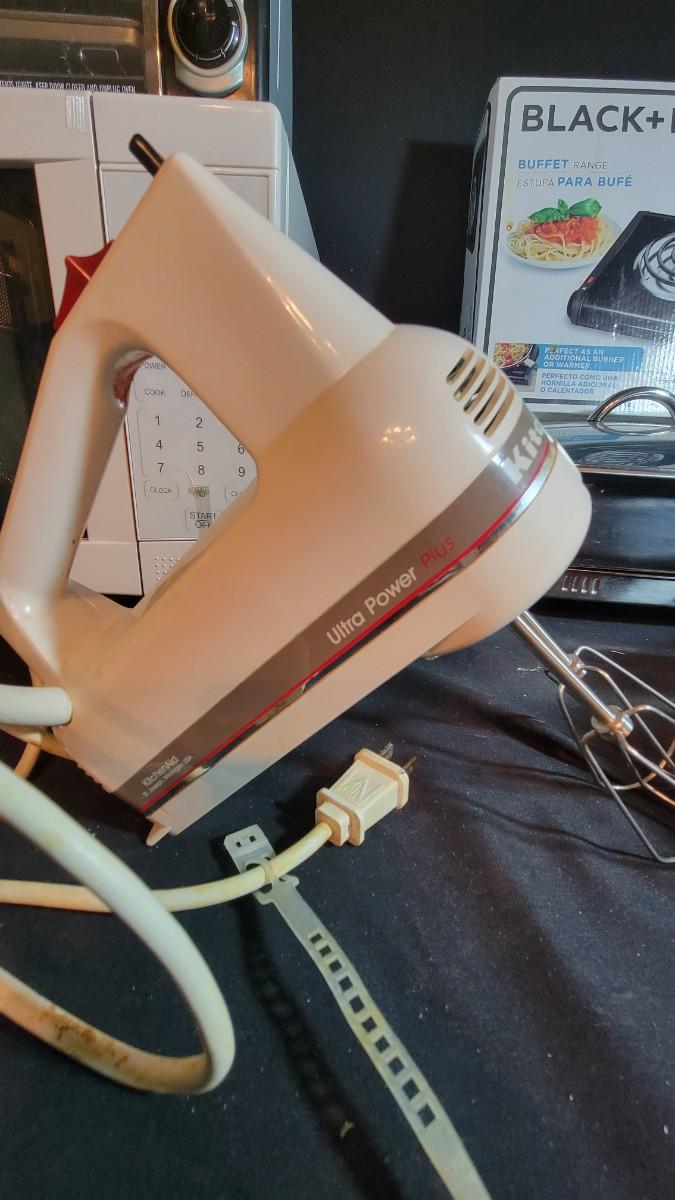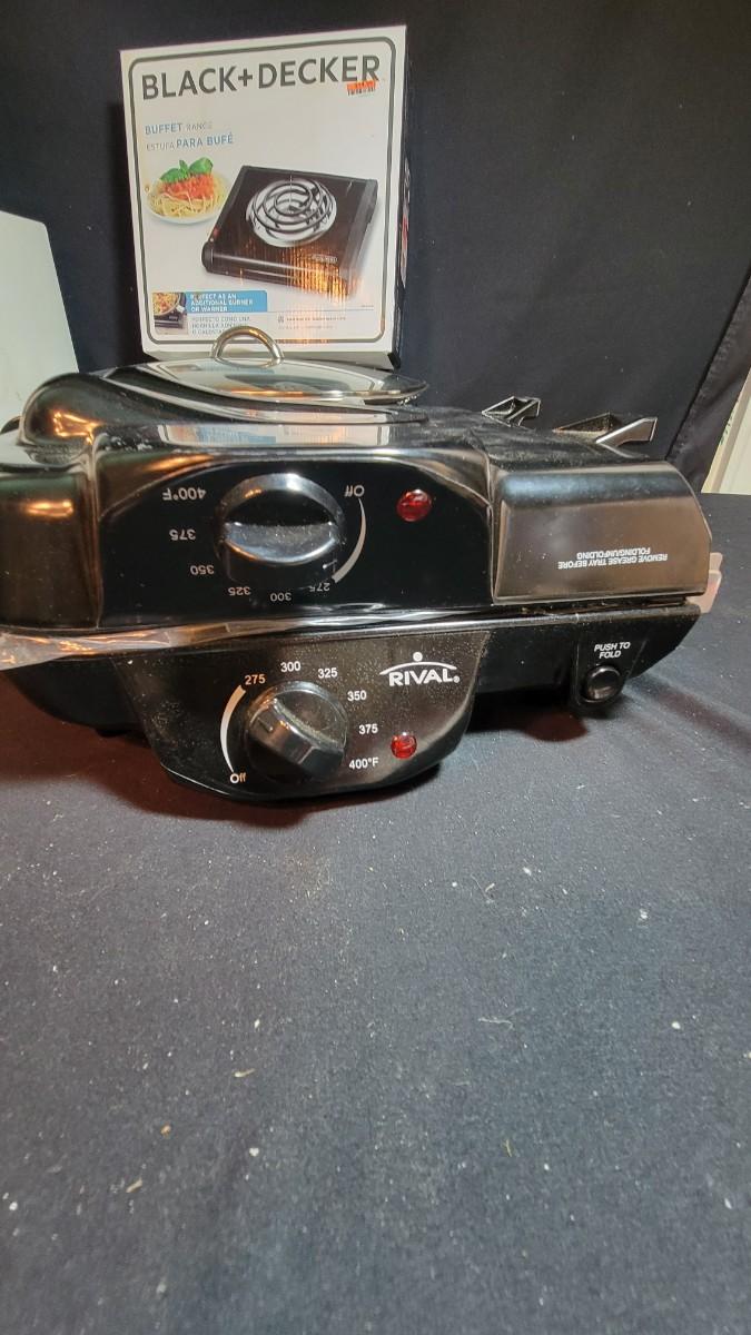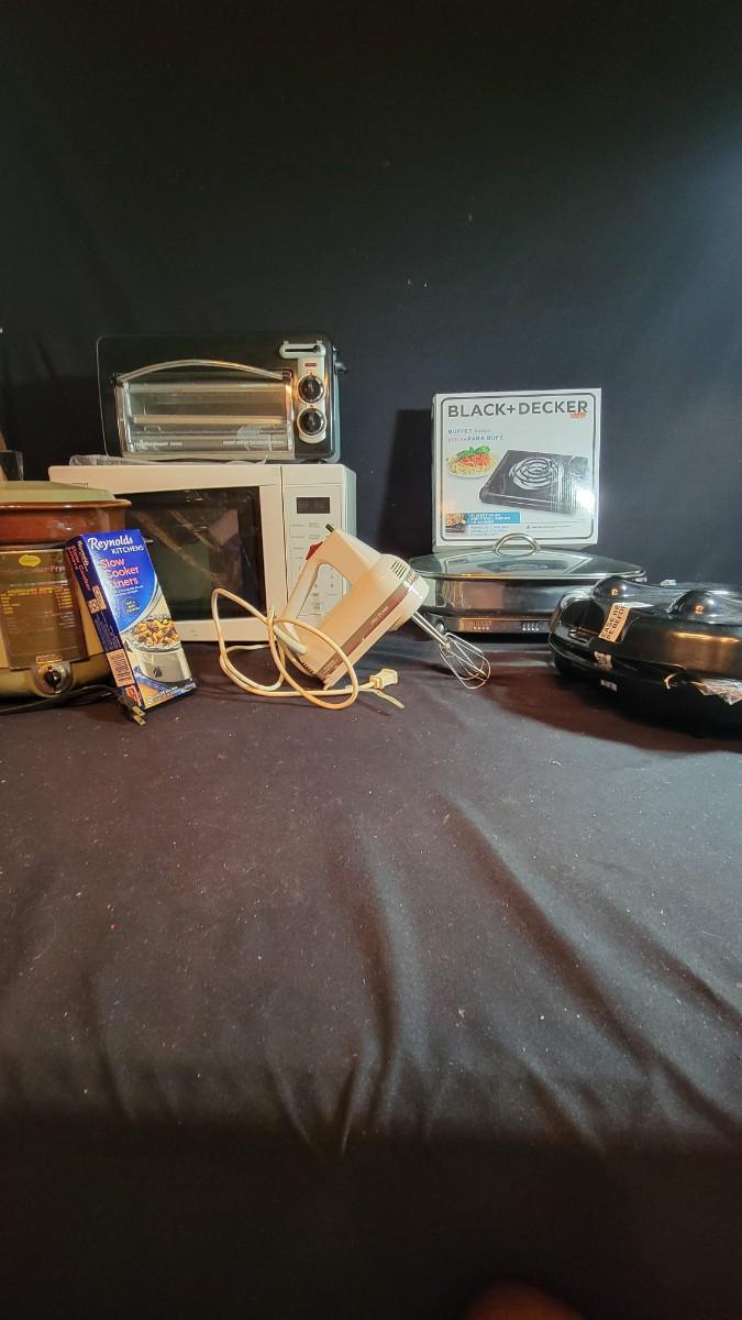 Assortment of small kitchen appliances that are new or were tested and work. Sunbeam crocker-cooker-fryer with ceramic pot in retro green and brown. KitchenAid hand mixer, Hamilton Beach toaster oven and toaster combo, New B&D buffet range, Hotpoint microwave measures approximately 18" x 12" x 11.5" and appears to be new but has some scuff marks, see image. Rival fold n store griddle and a GE electric skillet that are both new.