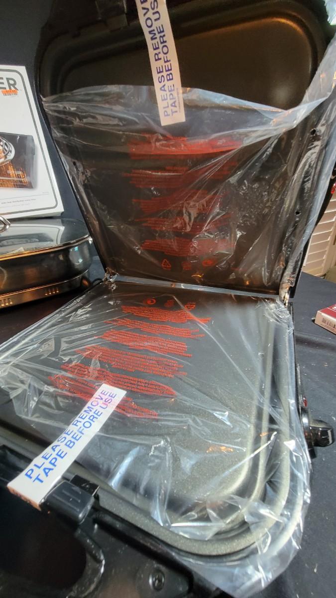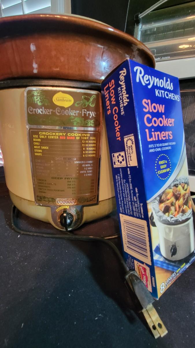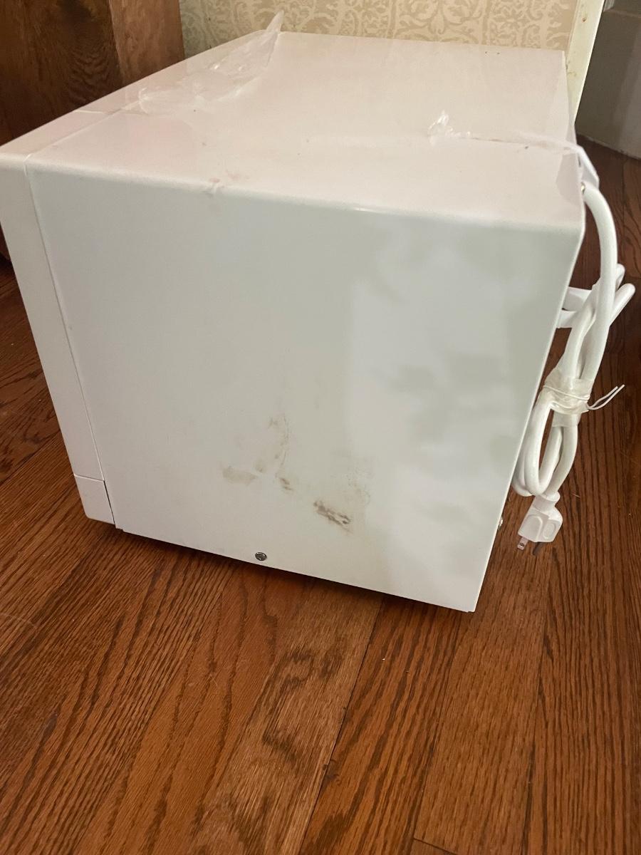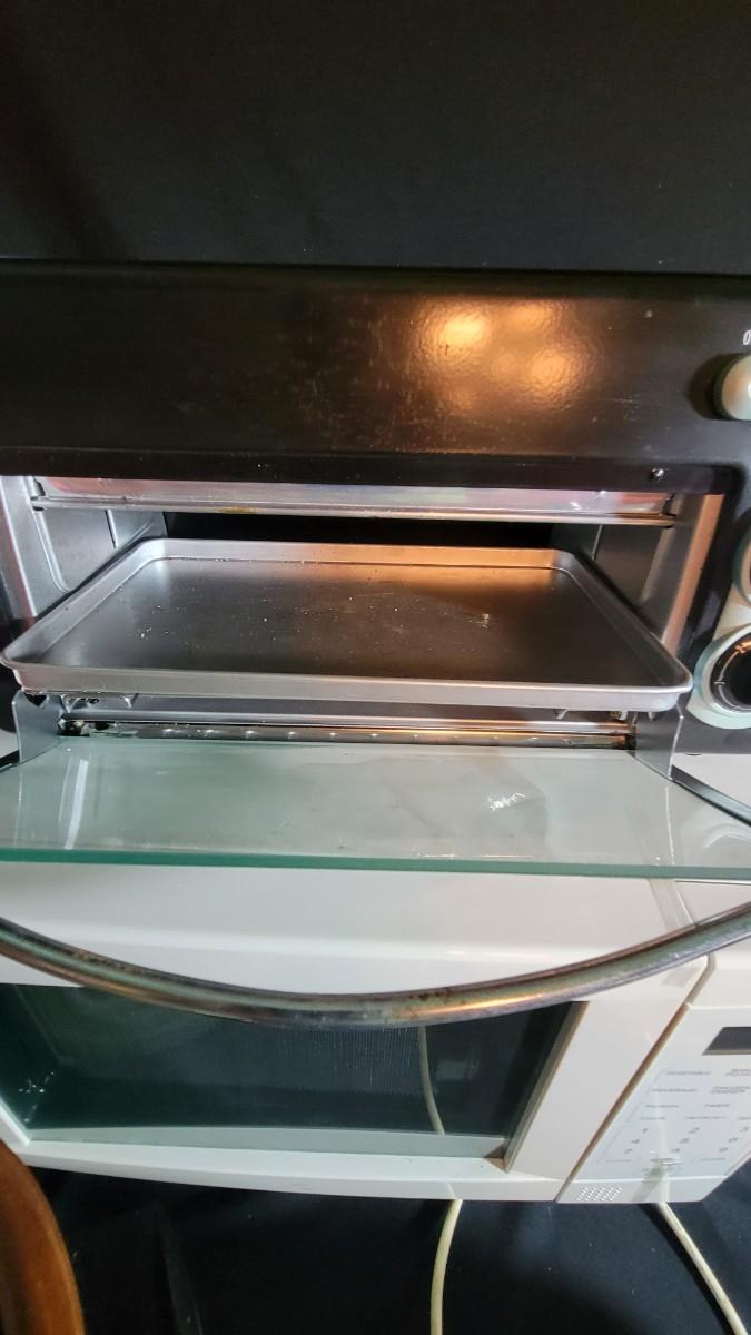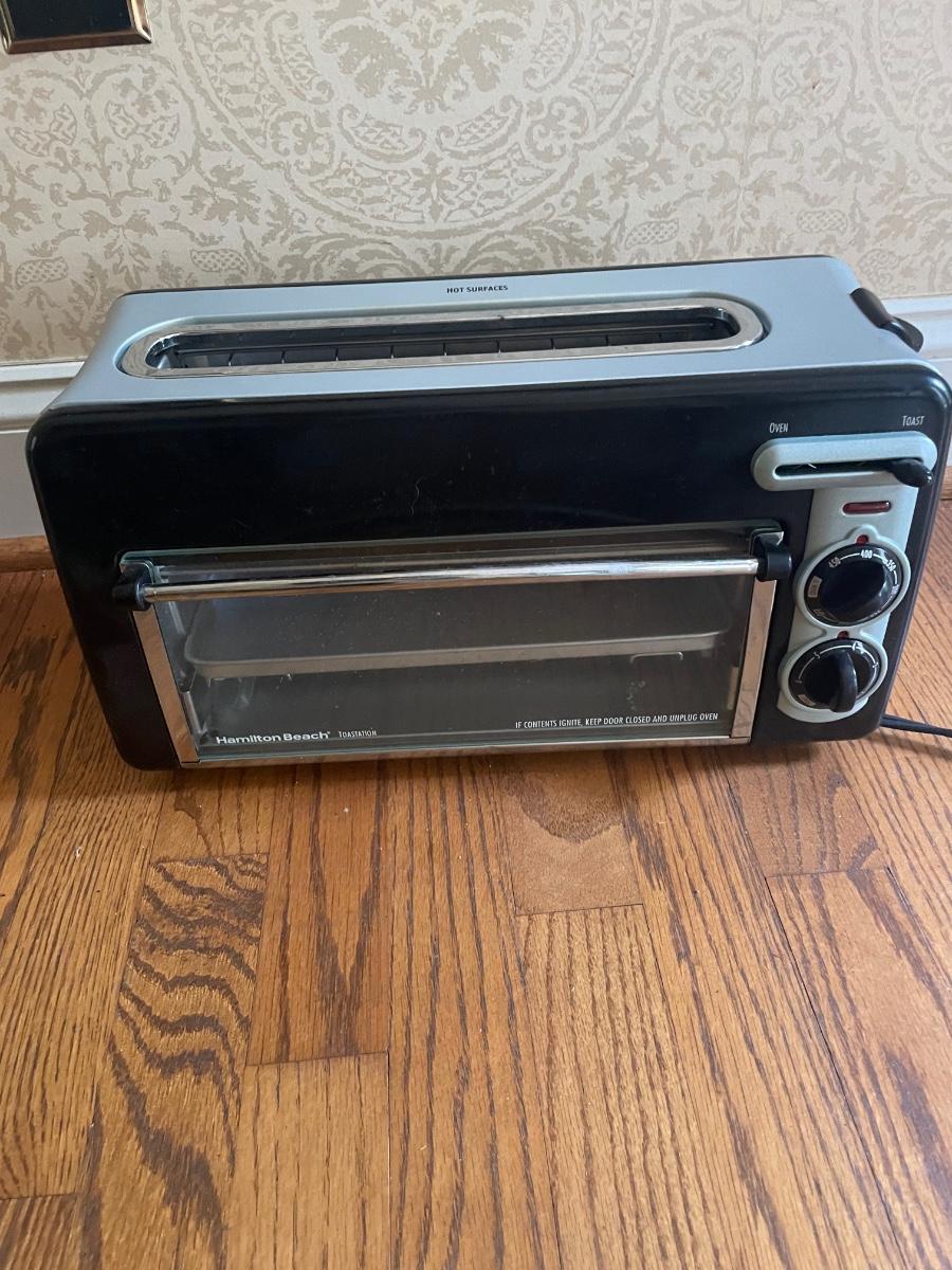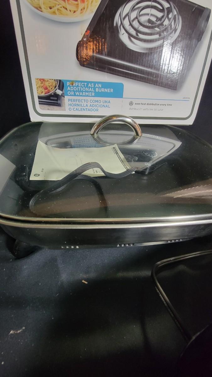 Assortment of small kitchen appliances that are new or were tested and work. Sunbeam crocker-cooker-fryer with ceramic pot in retro green and brown. KitchenAid hand mixer, Hamilton Beach toaster oven and toaster combo, New B&D buffet range, Hotpoint microwave measures approximately 18" x 12" x 11.5" and appears to be new but has some scuff marks, see image. Rival fold n store griddle and a GE electric skillet that are both new.