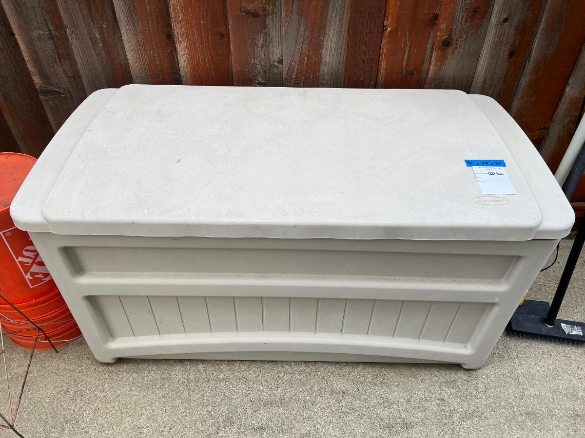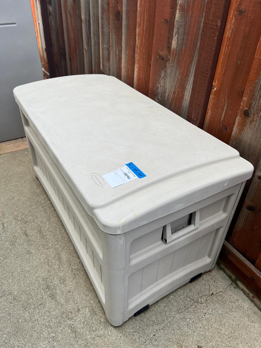 46 X 24 X24" 50 Gallon Medium Deck Box - Light taupe resin box. This auction is for the box not the contents. 46X29X29 Our products are designed and made right here in the USA using 100% domestically sourced resin Beautiful plastic outdoor box has a 50-gallon capacity for patio, deck, yard, porch, garage, and shed storage!DURABLE: Water-resistant poly resin construction resists fading and rust to keep your box looking new for years to come