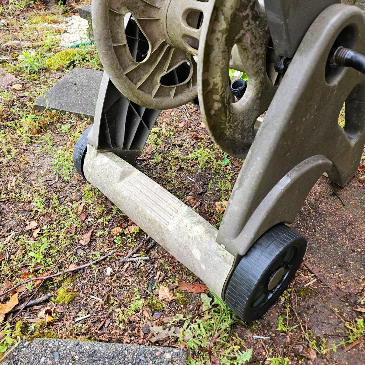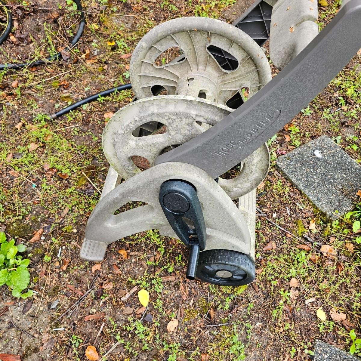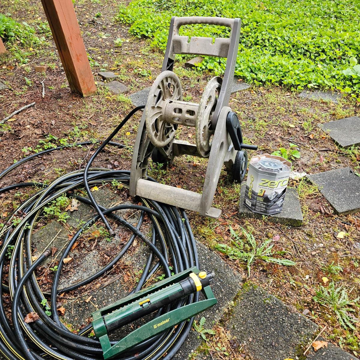 One plastic wind up hose cart by Suncast. Piece has plastic wheels and handle, attachment hose on side. Also includes one Melnor wave type sprinkler, one Zero-G 50 ft collapsible hose and another standard 50 ft length of garden hose. See photos for details. Local pickup only.
