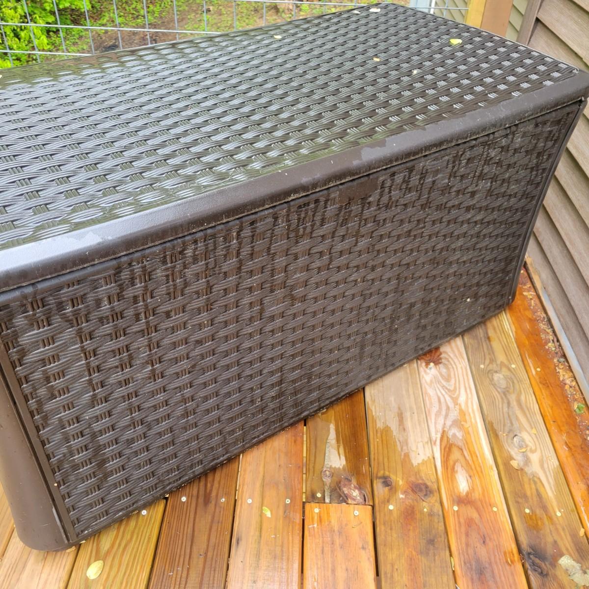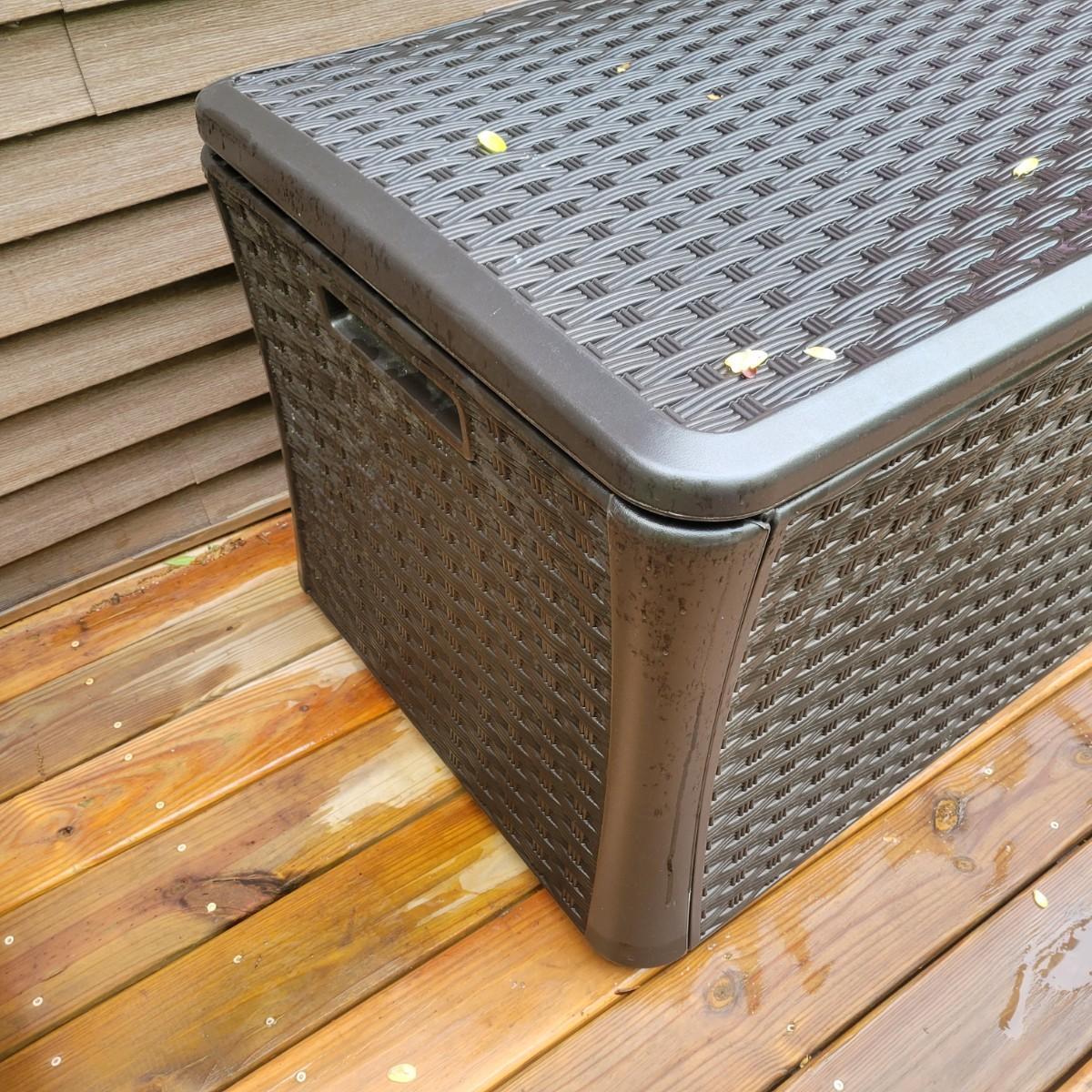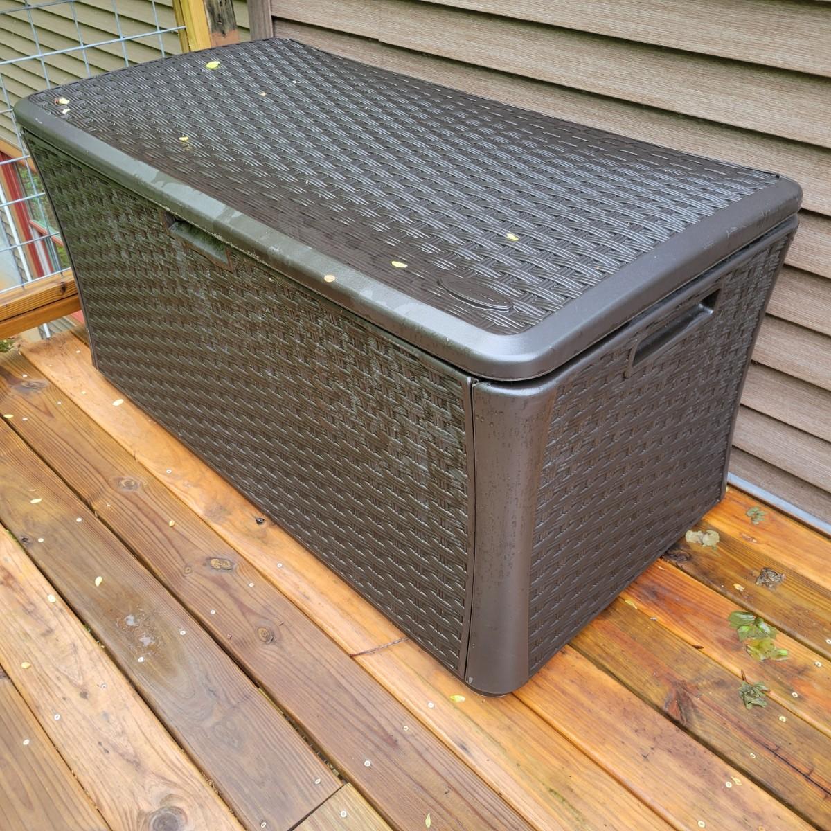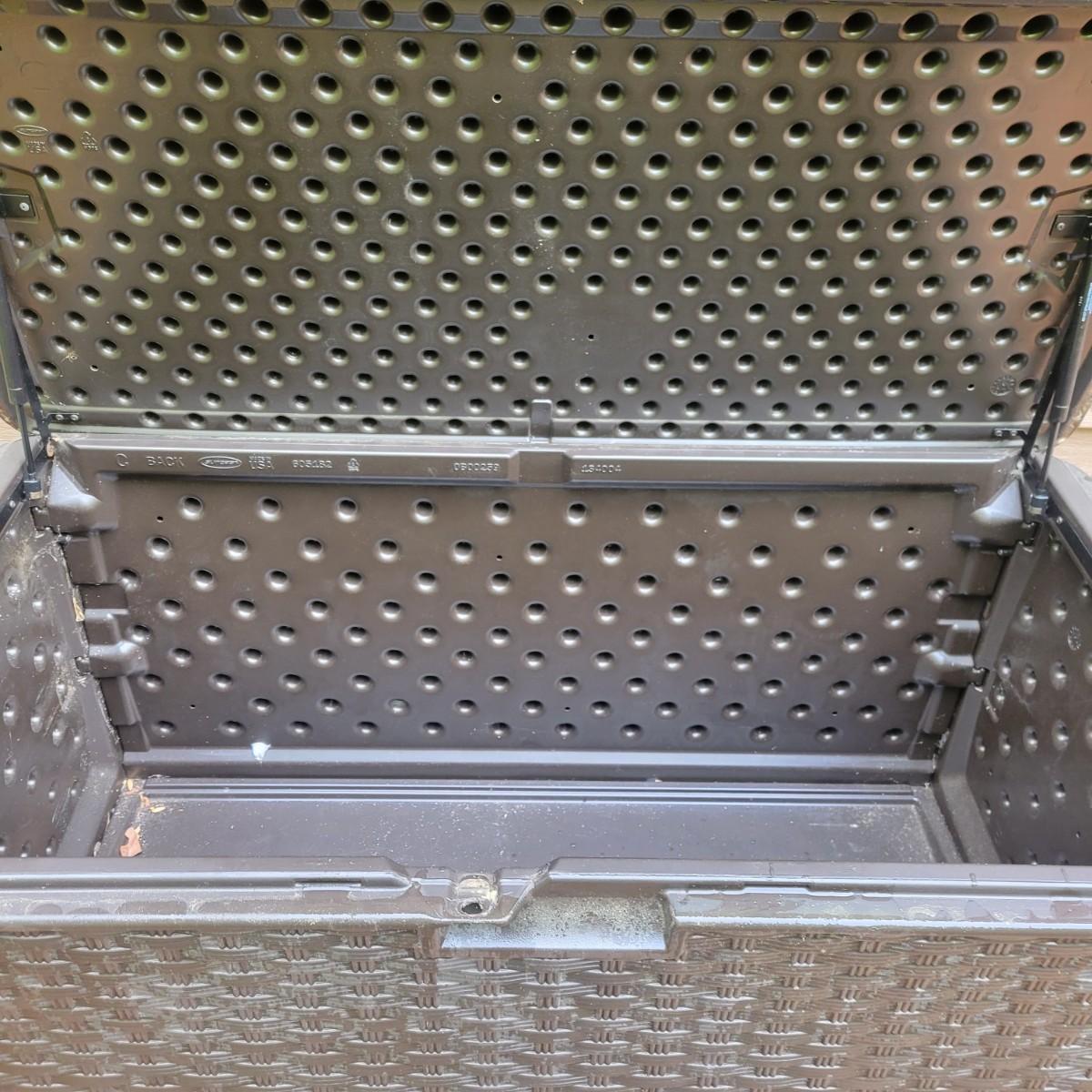 An outdoor storage bin manufactured by Suncast. It is made of plastic and has a brown, wicker style exterior and has an easy open hinged lid. Measures approximately 54" x 28" x 27.5"H. Local pickup only