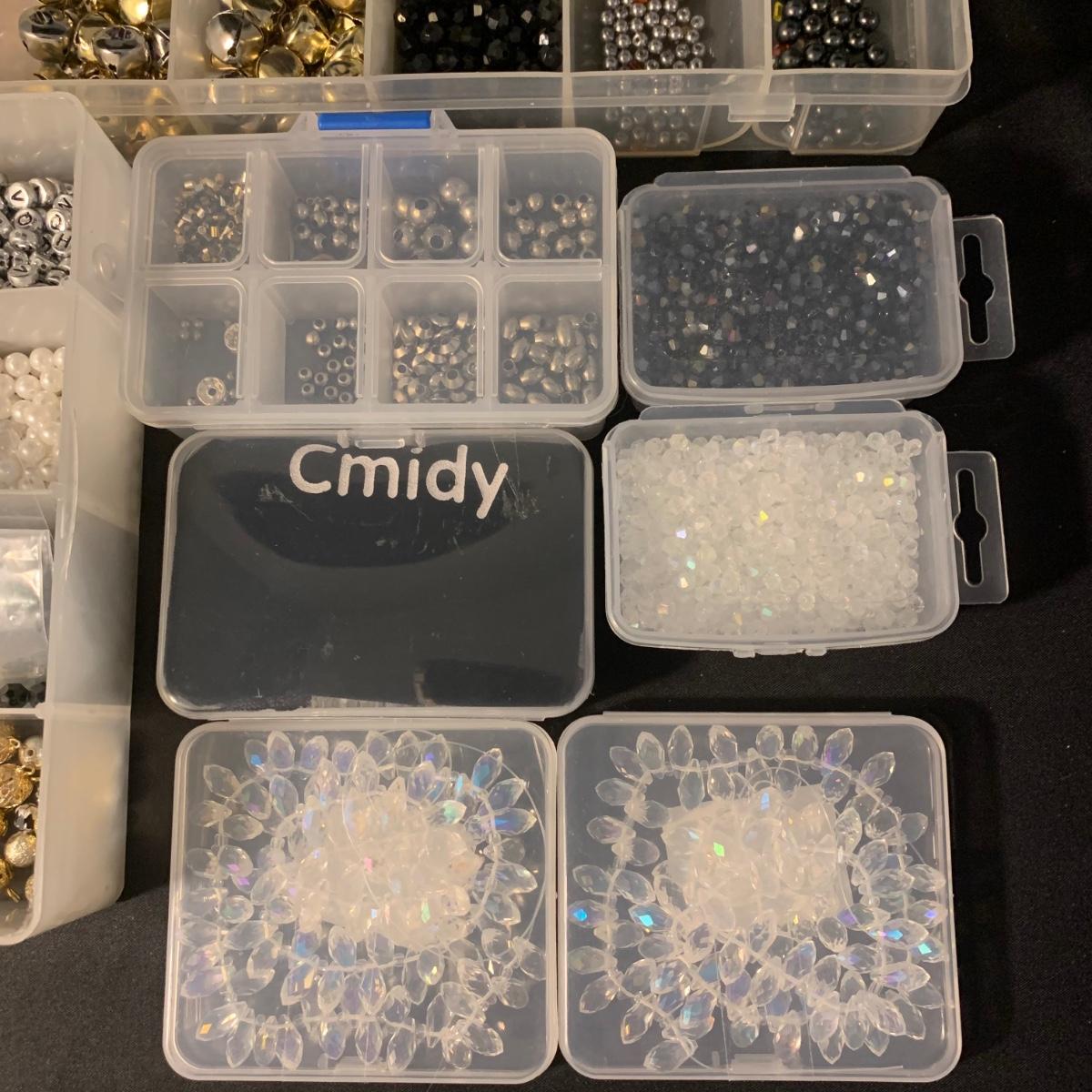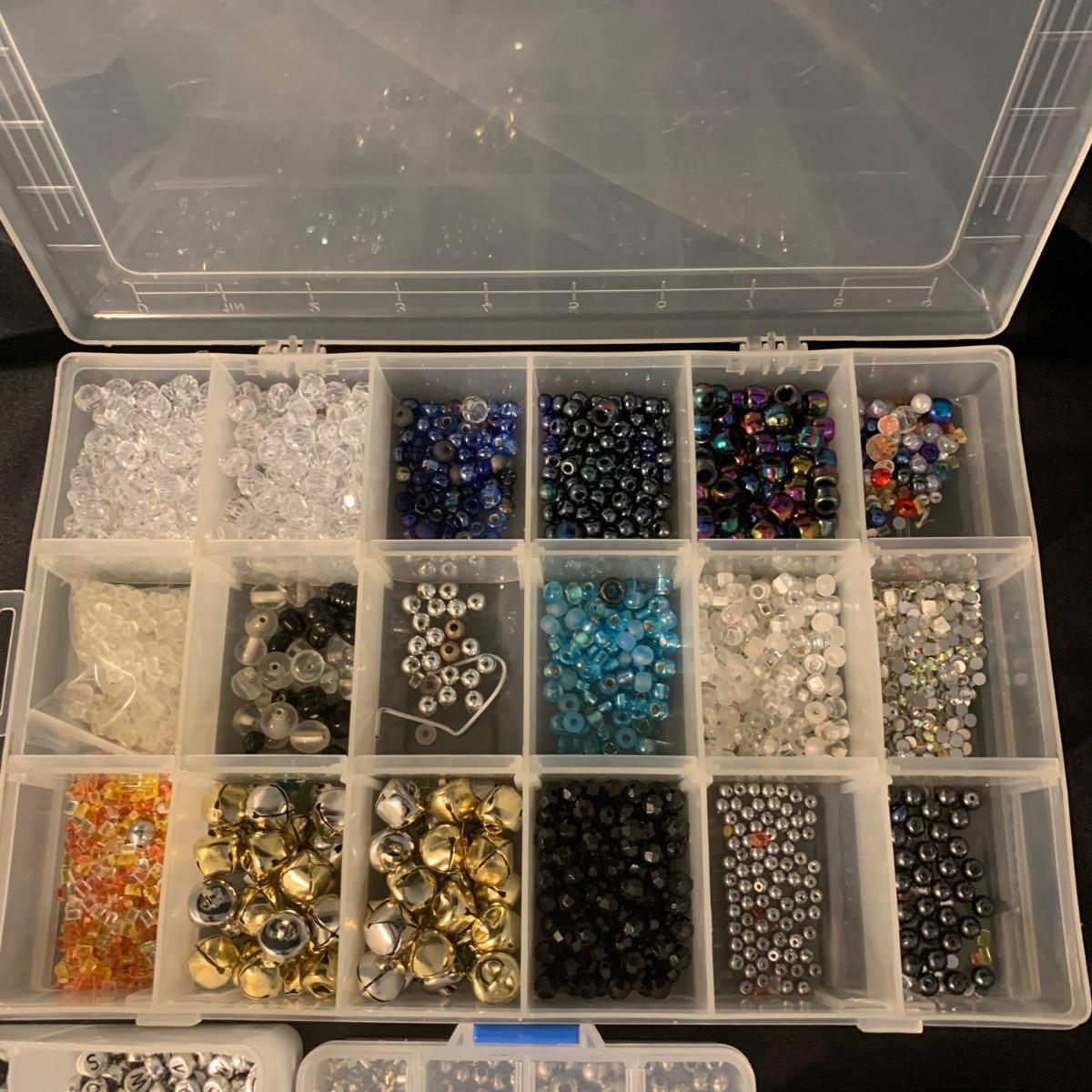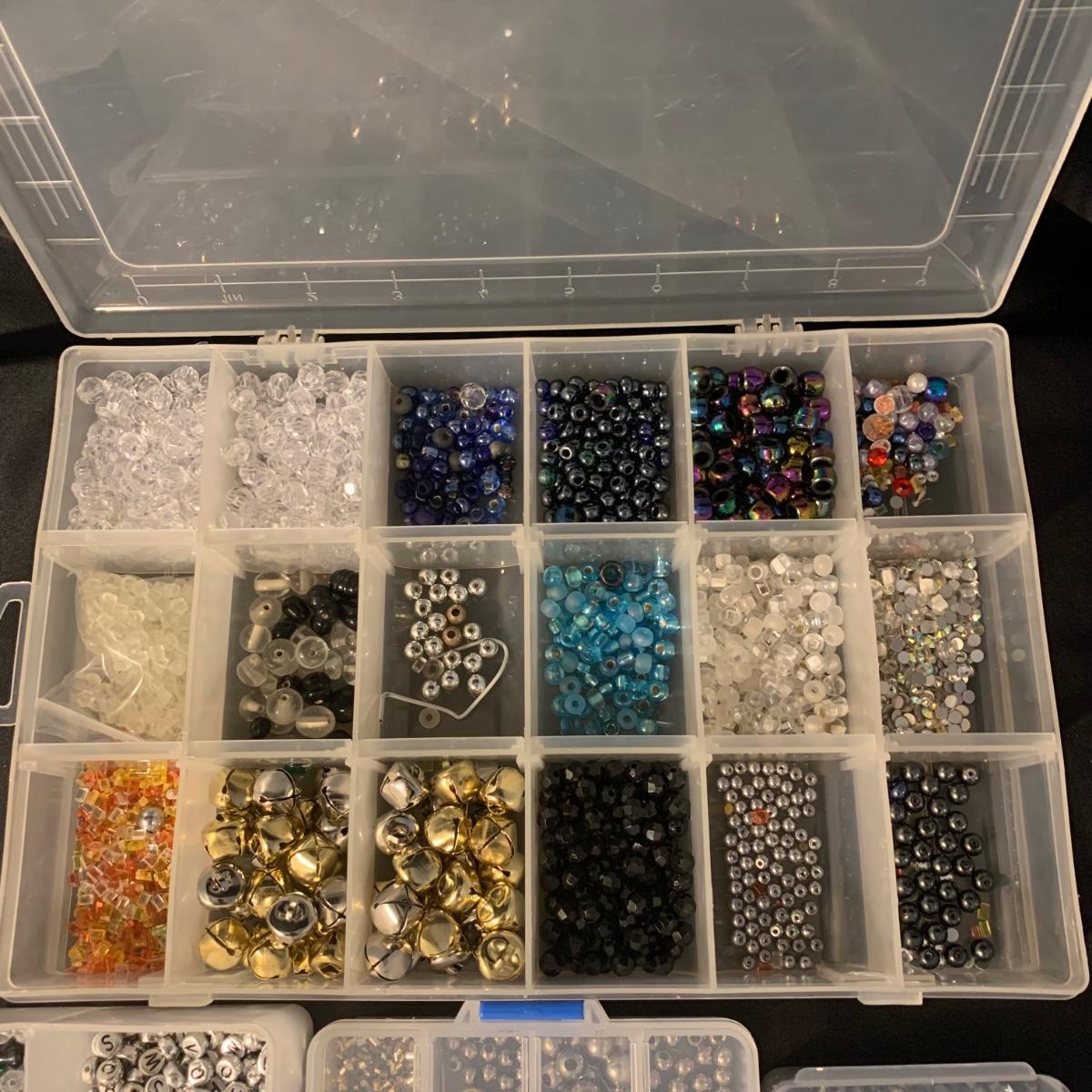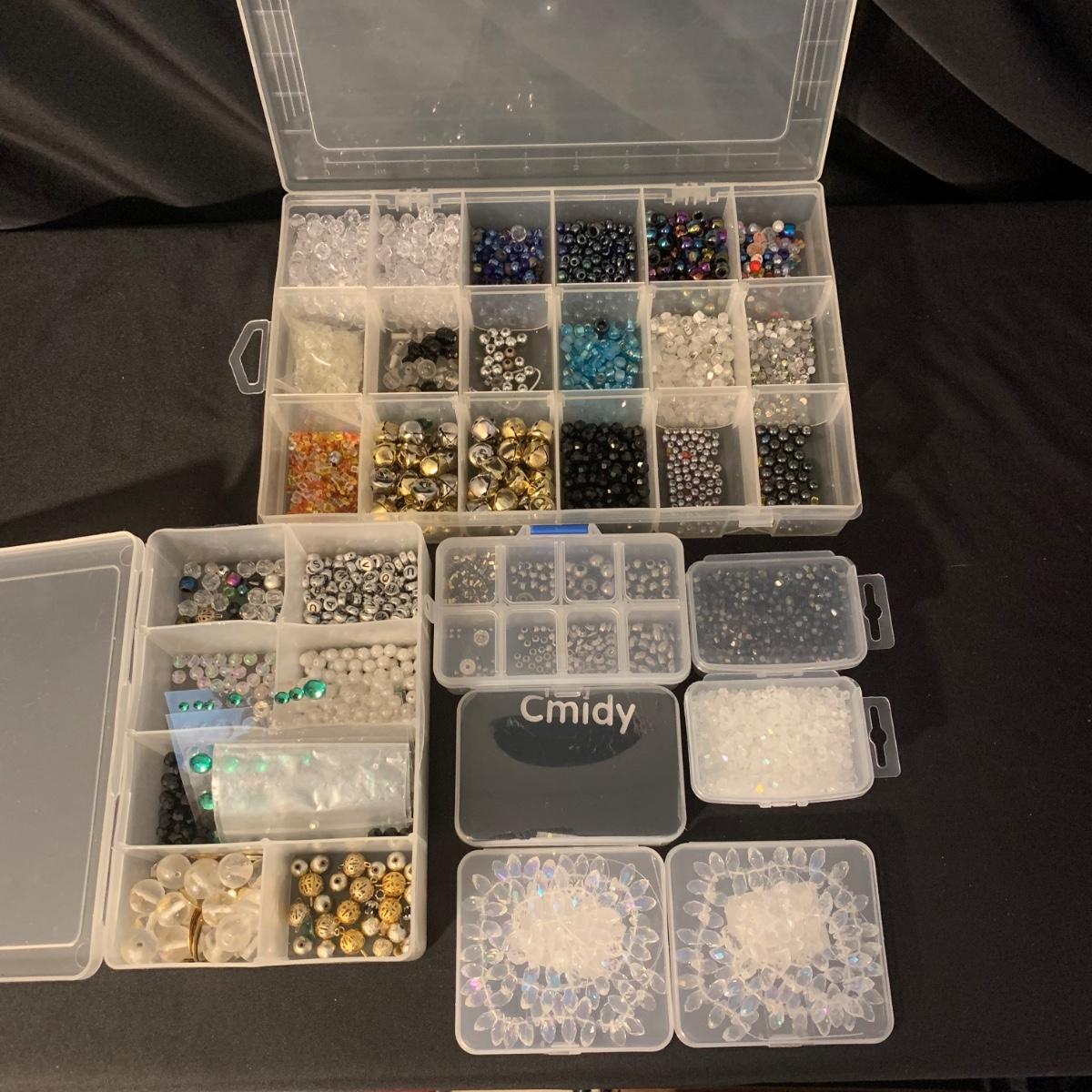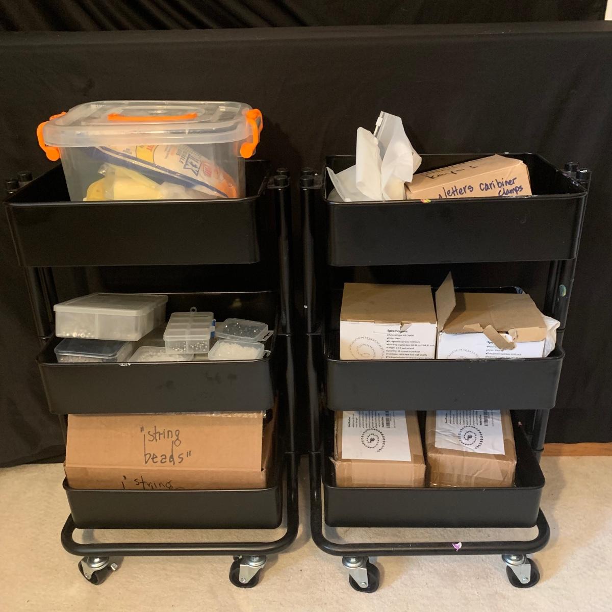 Interested in making your own suncatchers? This lot includes a variety of crystals, string beads, and wires. You’ll even find a hot glue gun kit. Complete with gloves, hot glue gun, and extra glue sticks. The craft caddy’s with swivel casters are included as well. All items appear to be in good condition. The caddy’s have a bit of paint on them from various crafts. But they roll nicely and store supplies properly. Caddy’s have three shelves each and measure, 15”L x 11.5”W x 25”H. Each shelf measures, 13”L x 9”W x 3.5”H.