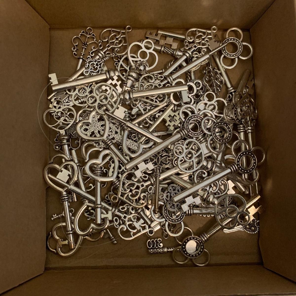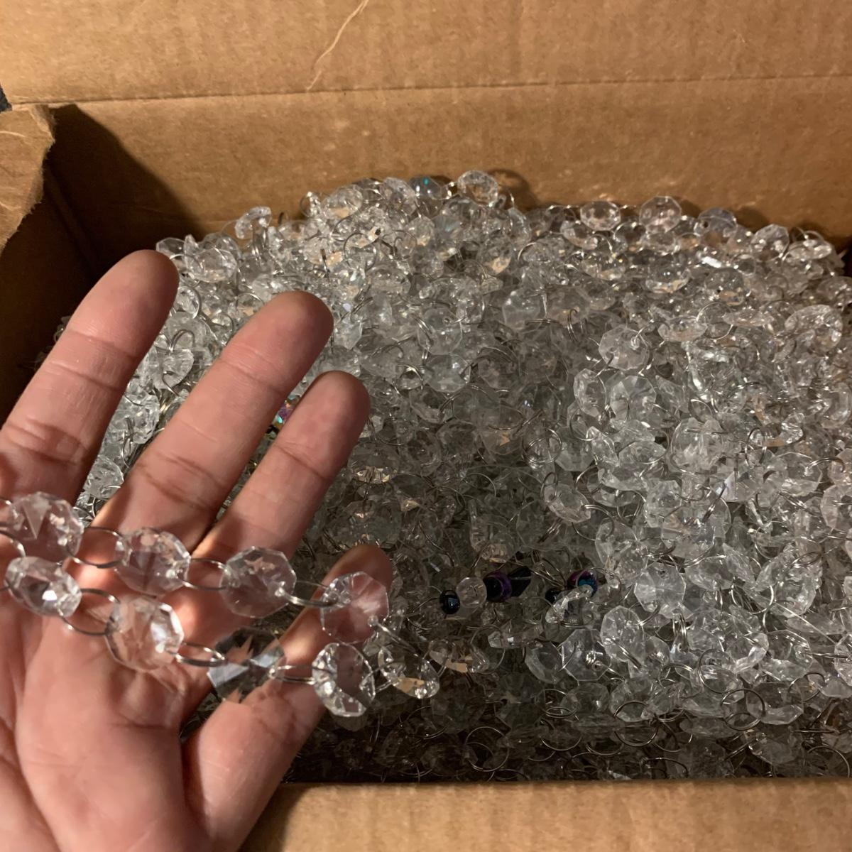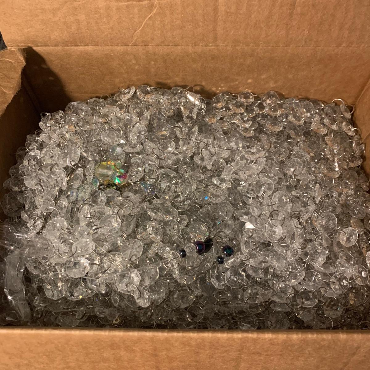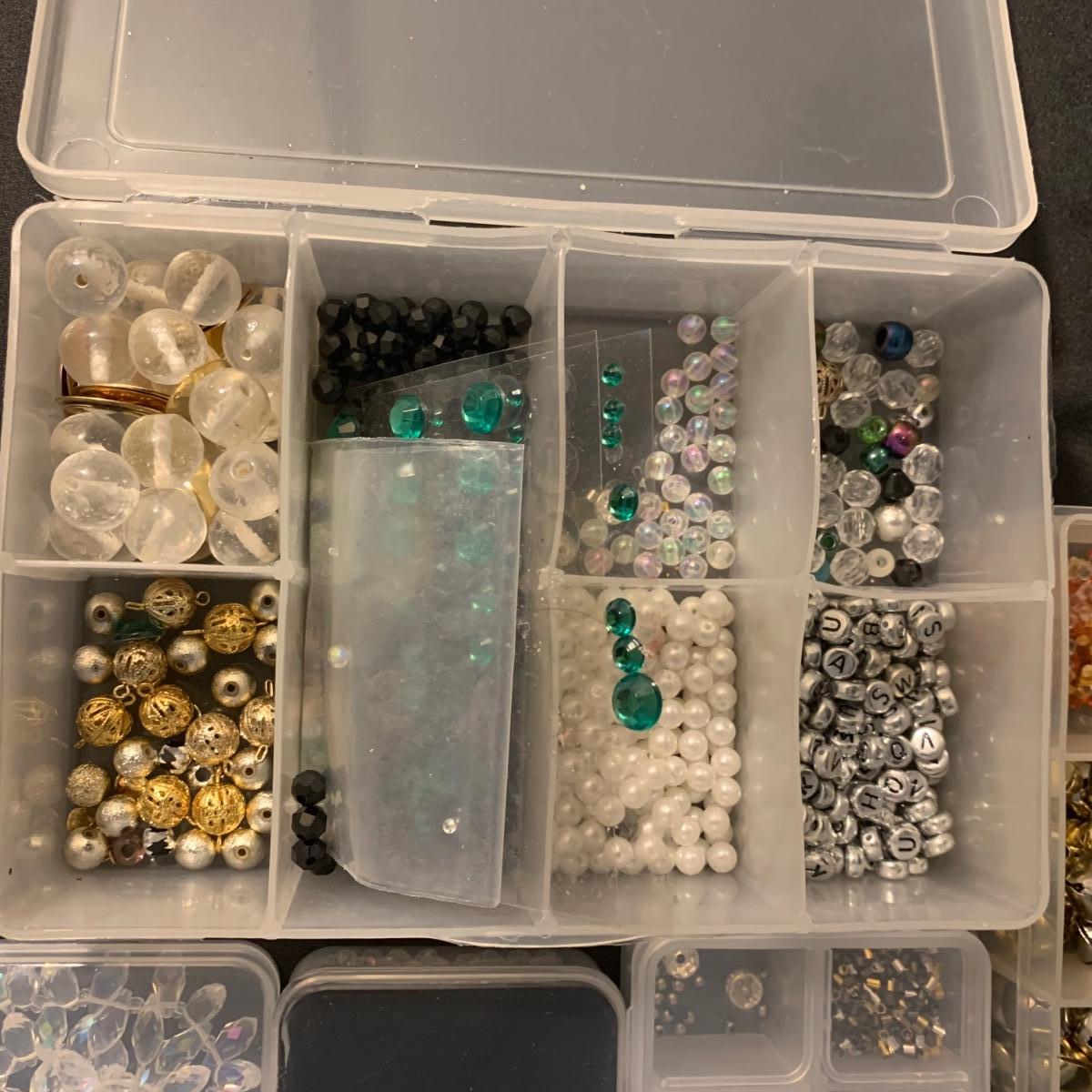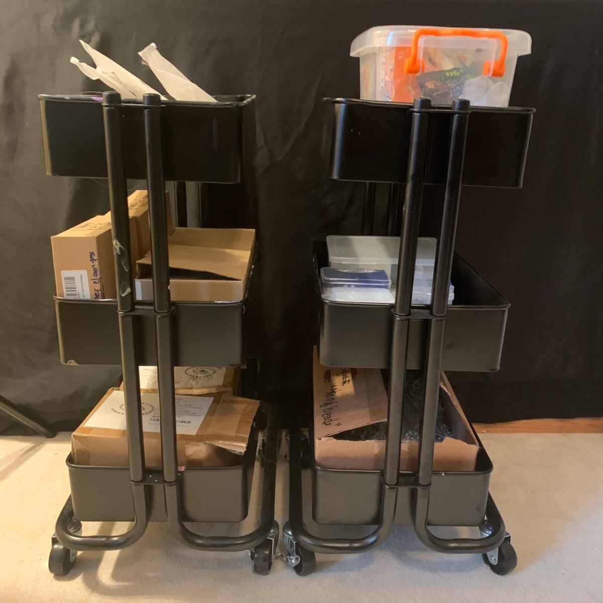 Interested in making your own suncatchers? This lot includes a variety of crystals, string beads, and wires. You’ll even find a hot glue gun kit. Complete with gloves, hot glue gun, and extra glue sticks. The craft caddy’s with swivel casters are included as well. All items appear to be in good condition. The caddy’s have a bit of paint on them from various crafts. But they roll nicely and store supplies properly. Caddy’s have three shelves each and measure, 15”L x 11.5”W x 25”H. Each shelf measures, 13”L x 9”W x 3.5”H.