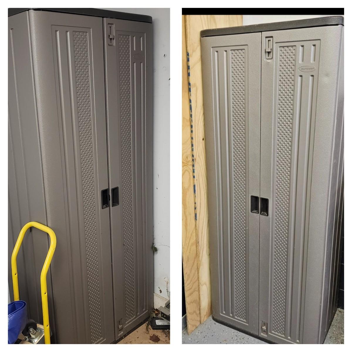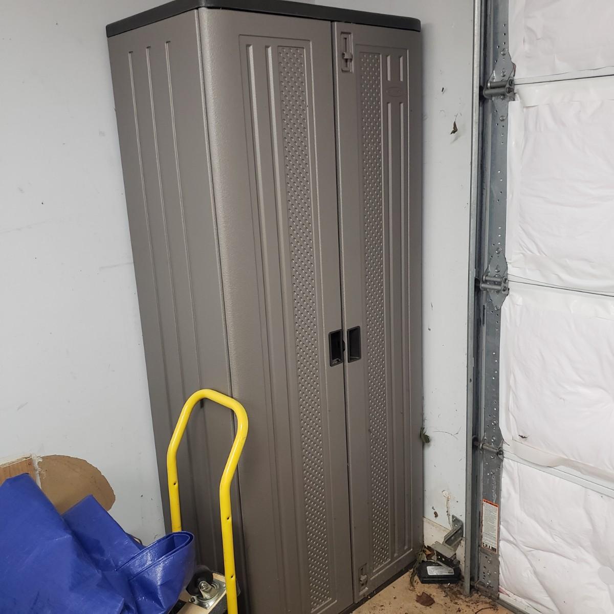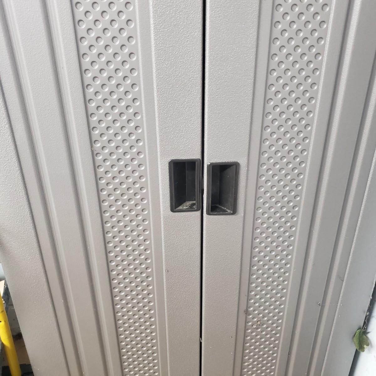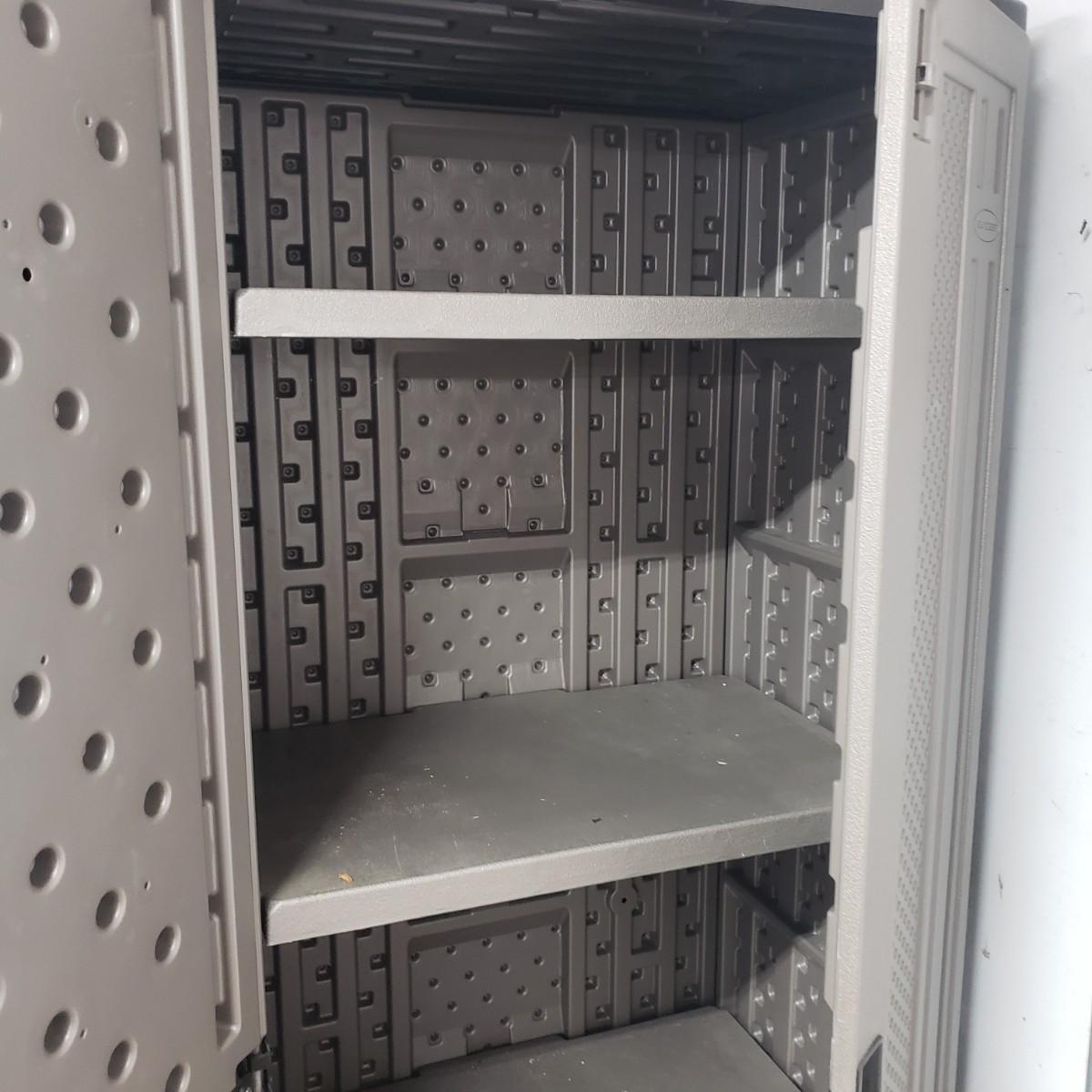 Two-Large two door four shelf plastic storage cabinets by Suncast. Doors open independently, have slide locks on one side. Four movable shelves inside. Cabinet measures 30" x 20" x 72"H. Cabinets are located in two different garages, hence the different photos, but are one lot! See photos for details. Local pickup only.