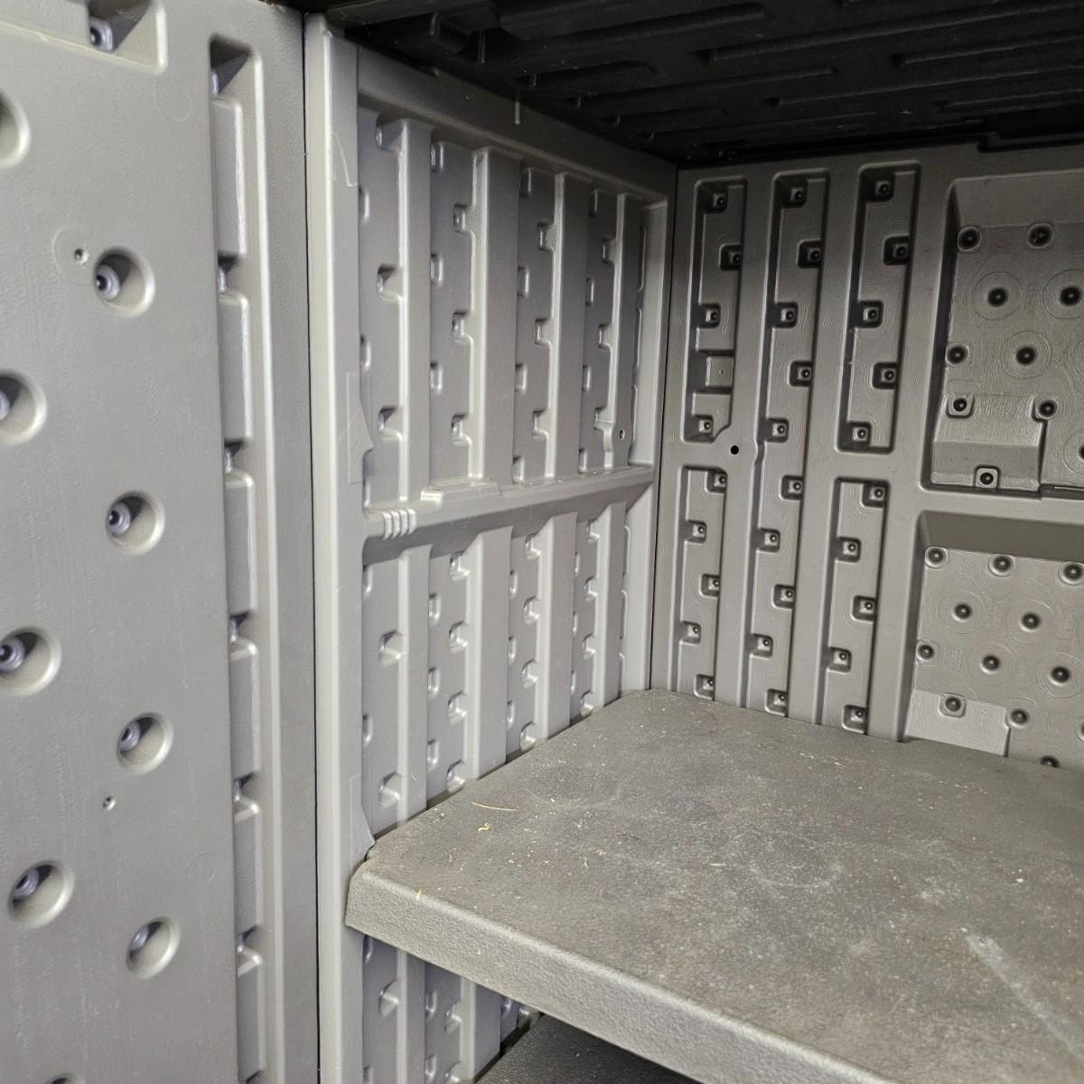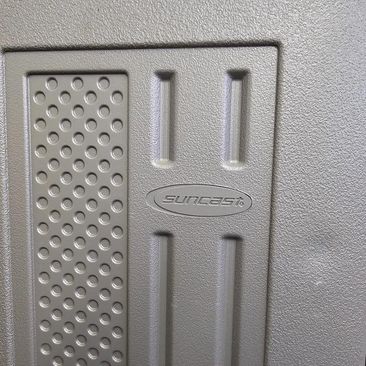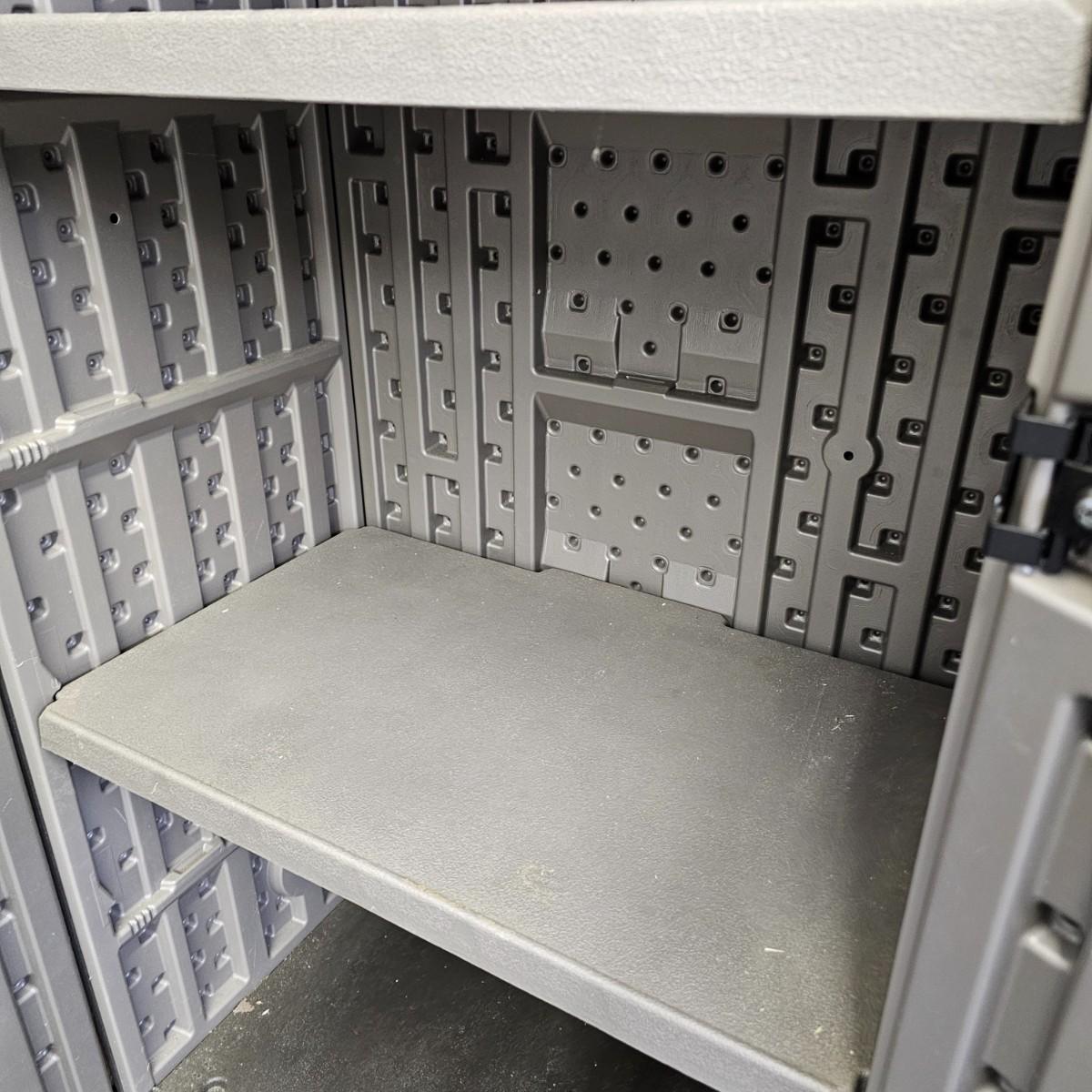 Two-Large two door four shelf plastic storage cabinets by Suncast. Doors open independently, have slide locks on one side. Four movable shelves inside. Cabinet measures 30" x 20" x 72"H. Cabinets are located in two different garages, hence the different photos, but are one lot! See photos for details. Local pickup only.
