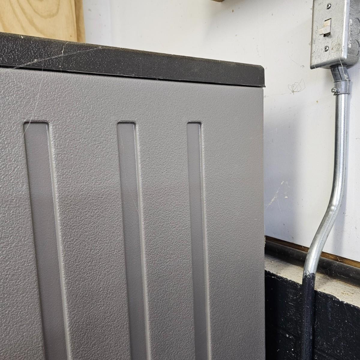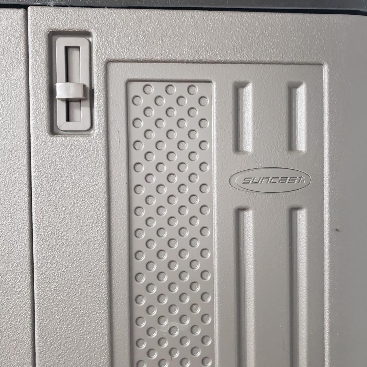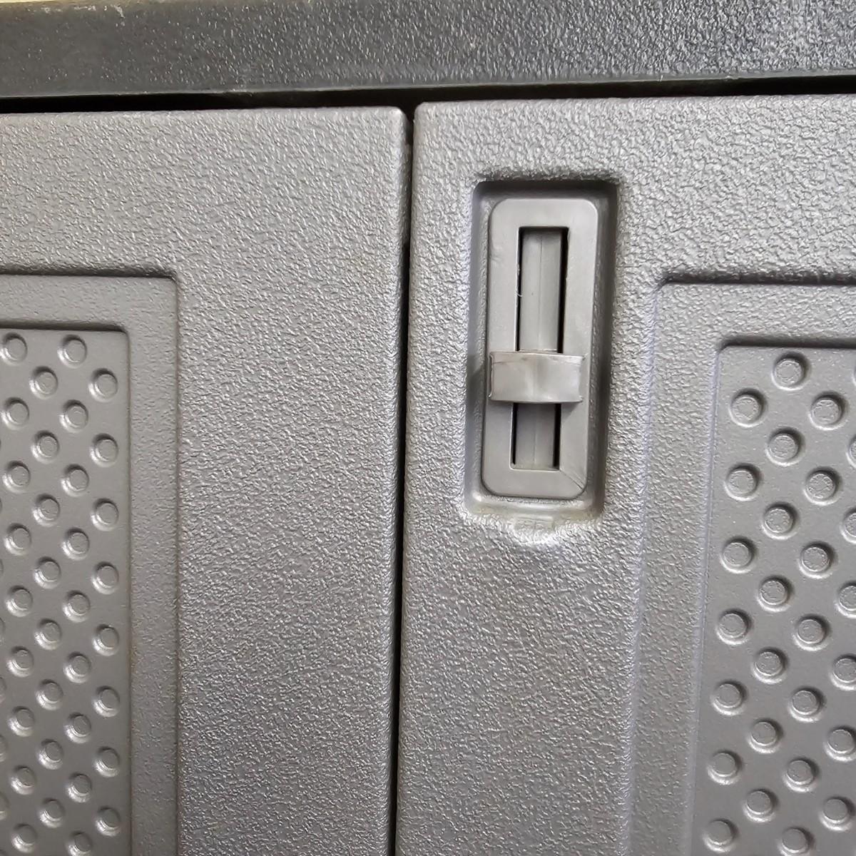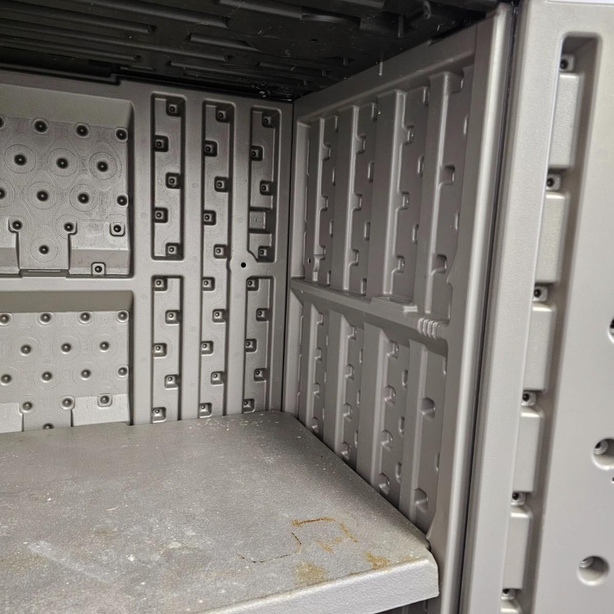Two-Large two door four shelf plastic storage cabinets by Suncast. Doors open independently, have slide locks on one side. Four movable shelves inside. Cabinet measures 30" x 20" x 72"H. Cabinets are located in two different garages, hence the different photos, but are one lot! See photos for details. Local pickup only.