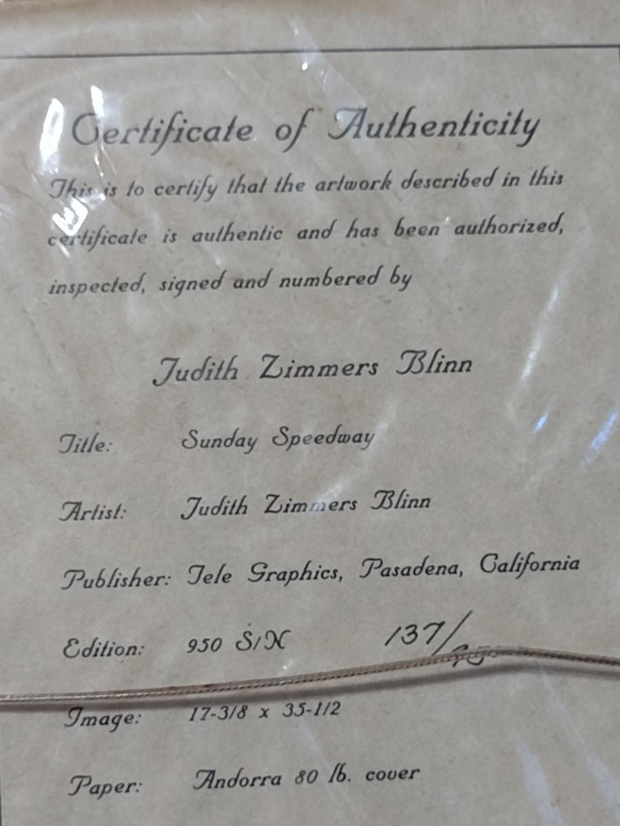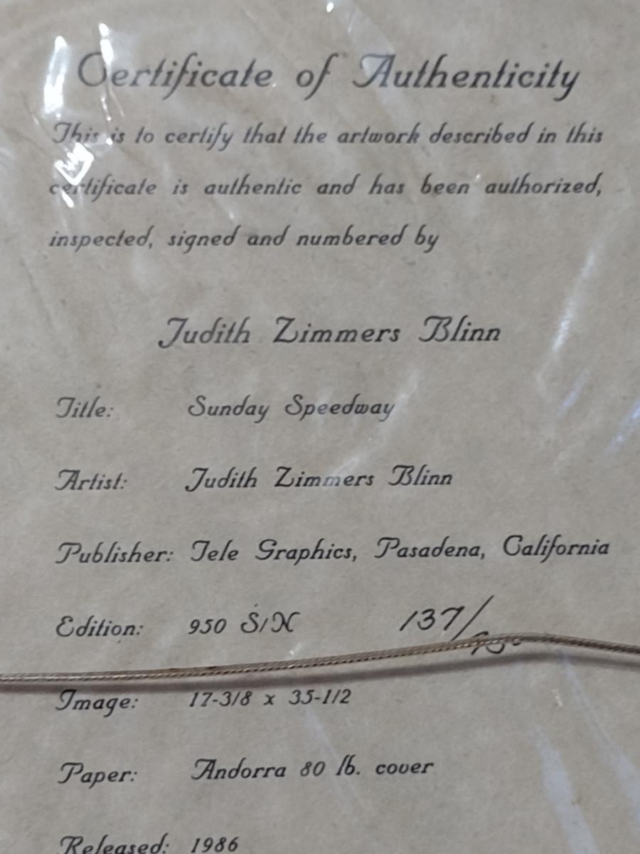 'Sunday Speedway' by Judith Zimmers Blinn- Framed Under Glass- Signed and Numbered Print
