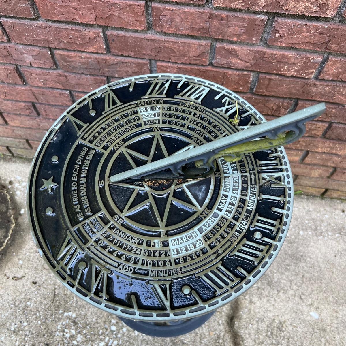 This metal sundial has a cast iron base. The top was partially wet from rain when photos were taken, so it appears darker in color. Also some yellow staining in one area which should come clean.