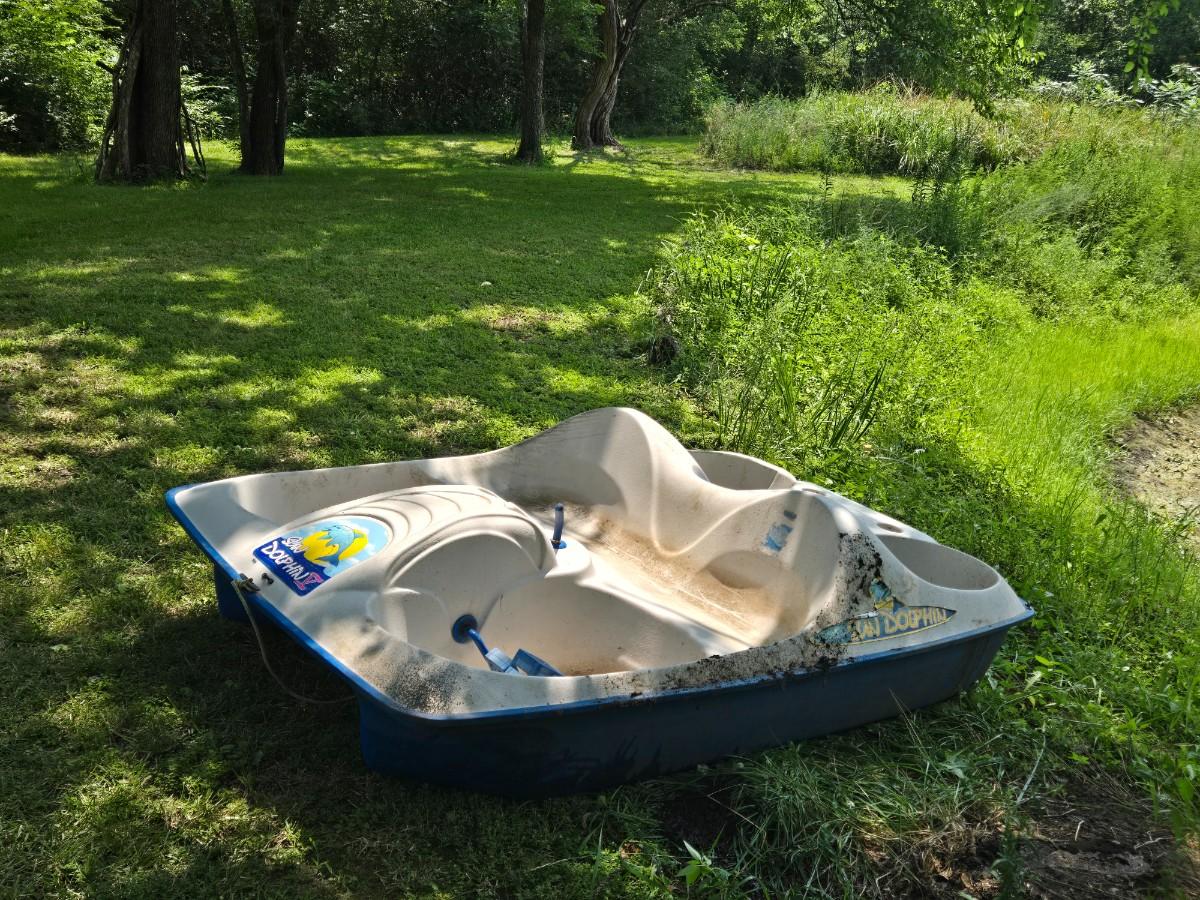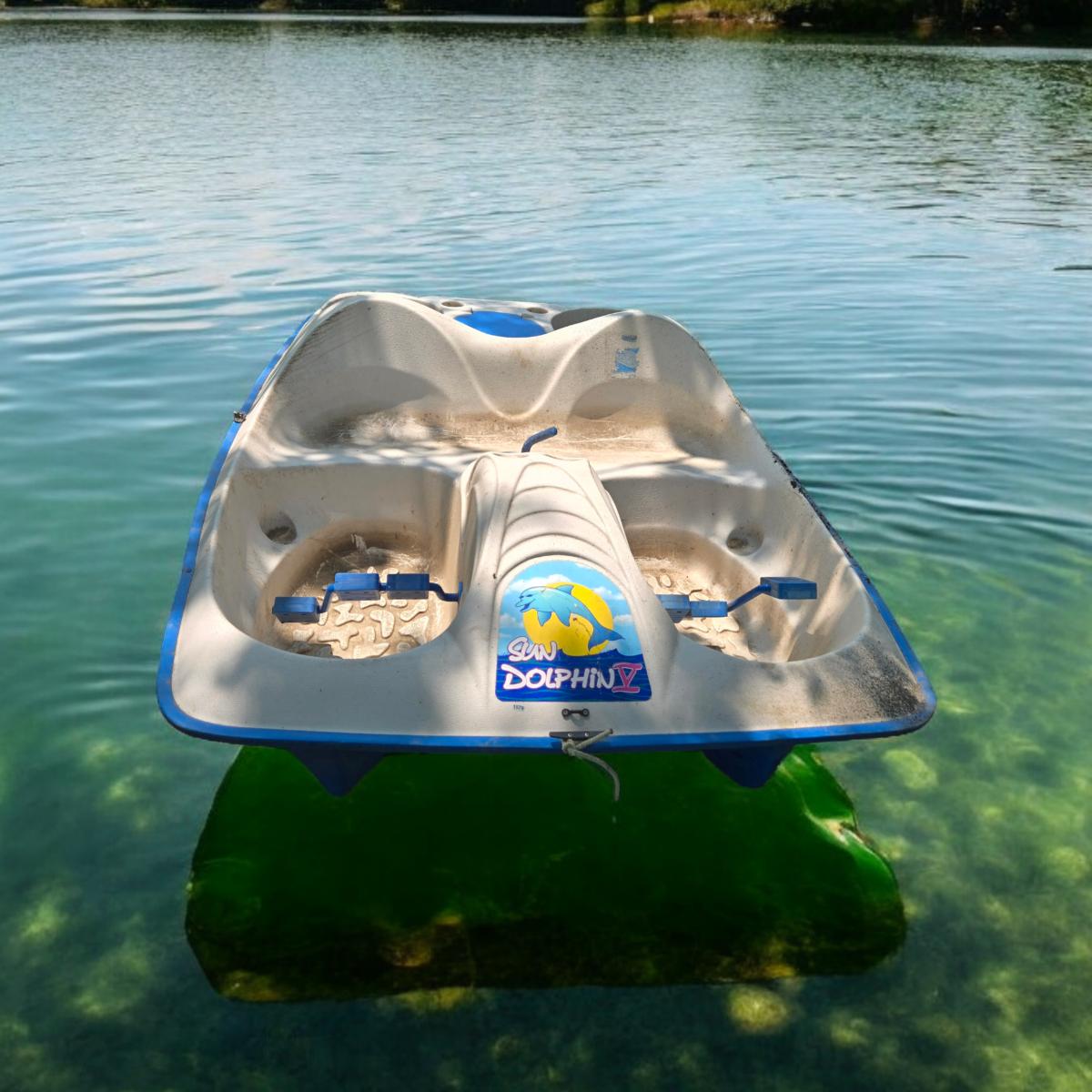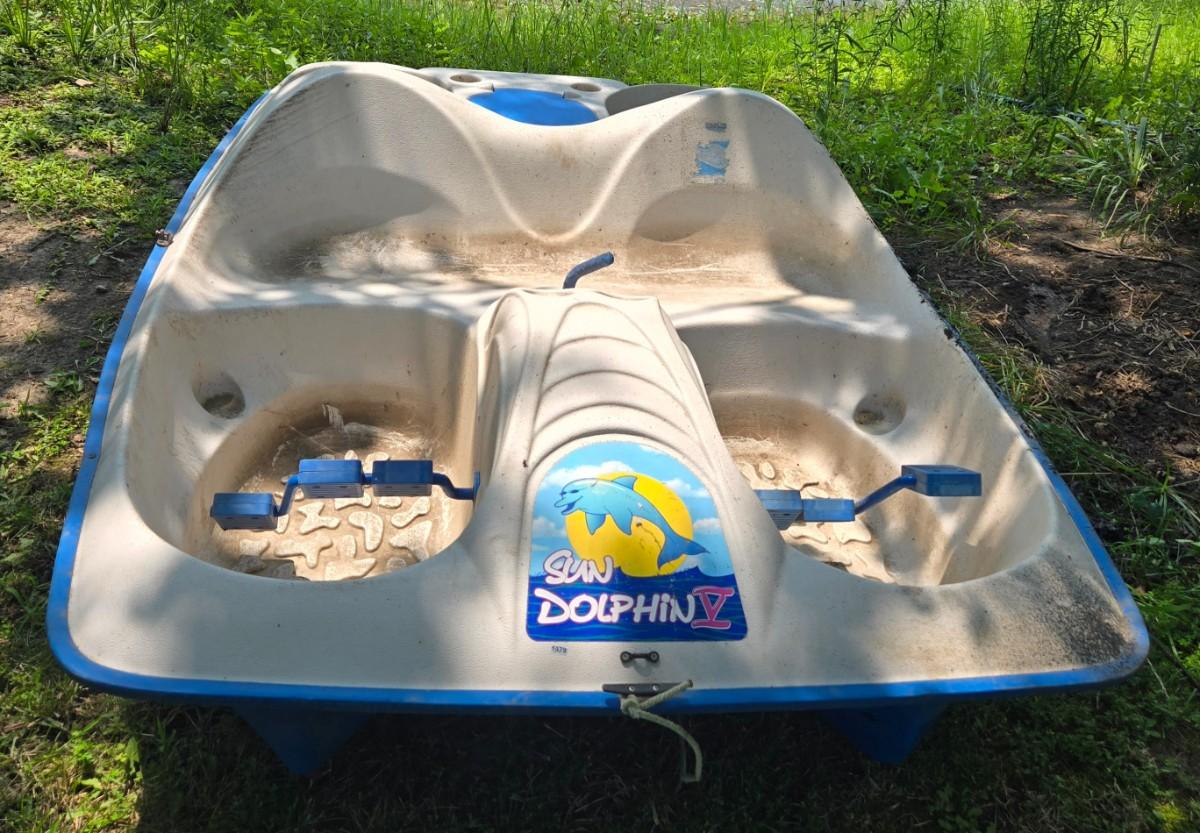 Tail fin and pedals move freely. No cracks, or breaks to body. Stored outdoors. Great for lake recreation.