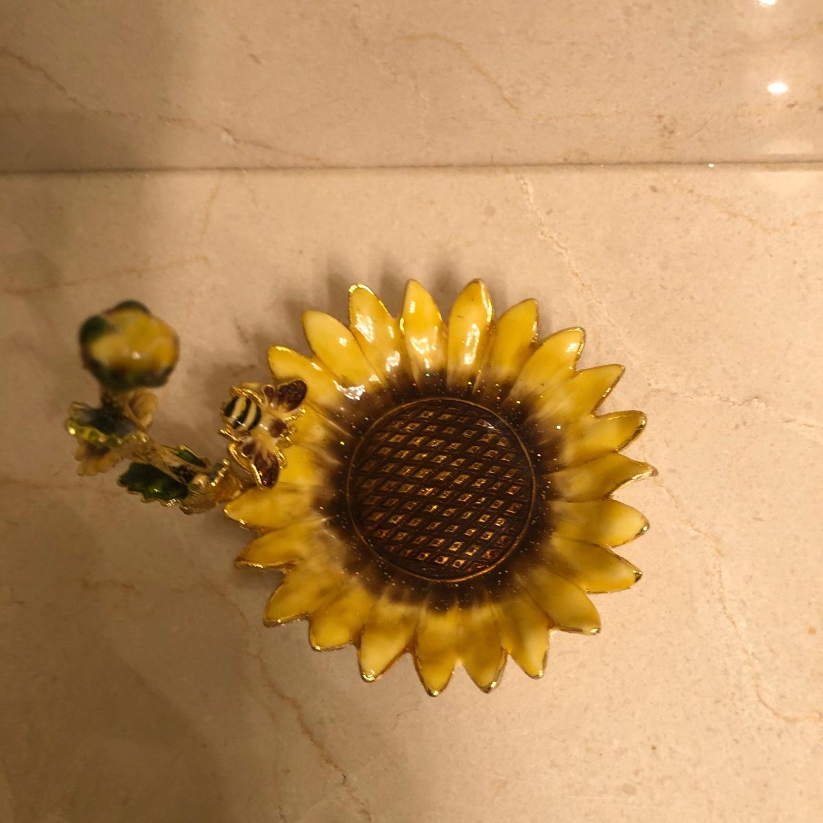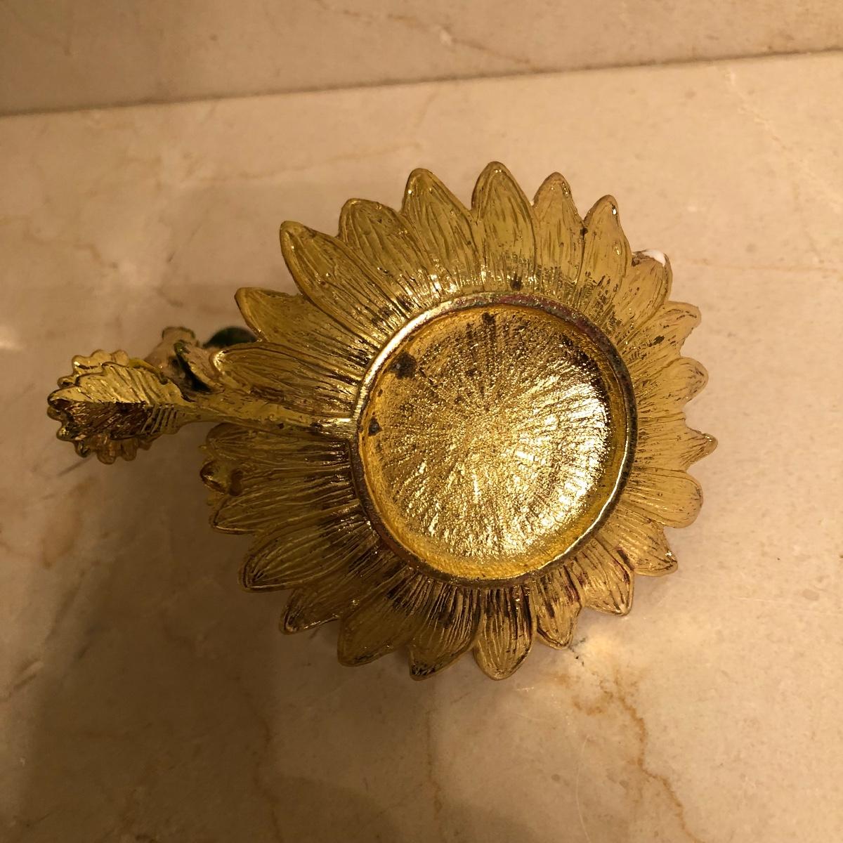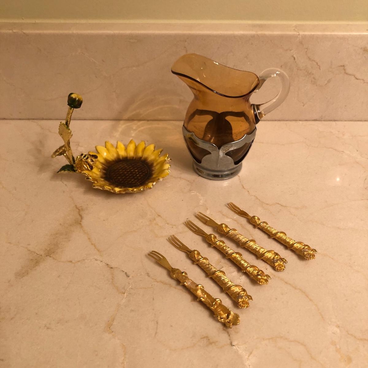 Lot includes metal sunflower with what appears to be a enamel covering, Farberware Bros pitcher and five gold colored mini forks. Sunflower dish measures 3.5”D x 4” tall. Pitcher measures 4” x 2.5” x 4”tall. Shipping available