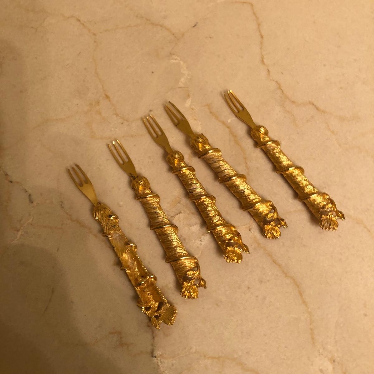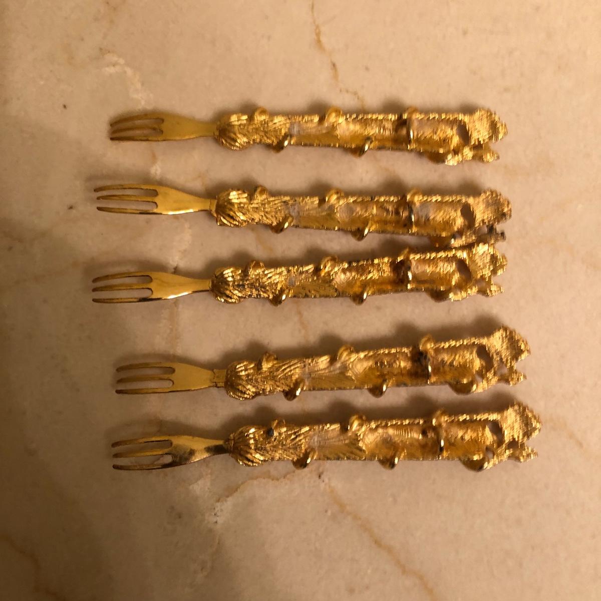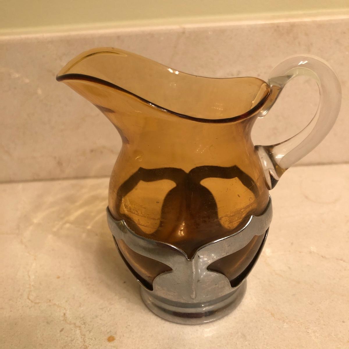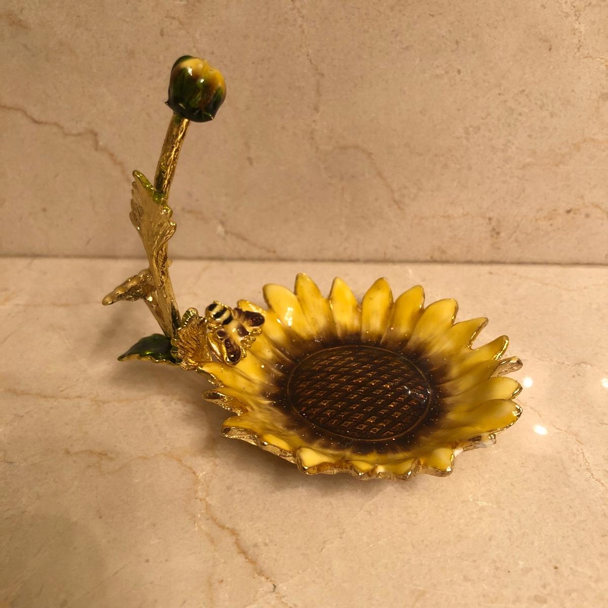 Lot includes metal sunflower with what appears to be a enamel covering, Farberware Bros pitcher and five gold colored mini forks. Sunflower dish measures 3.5”D x 4” tall. Pitcher measures 4” x 2.5” x 4”tall. Shipping available