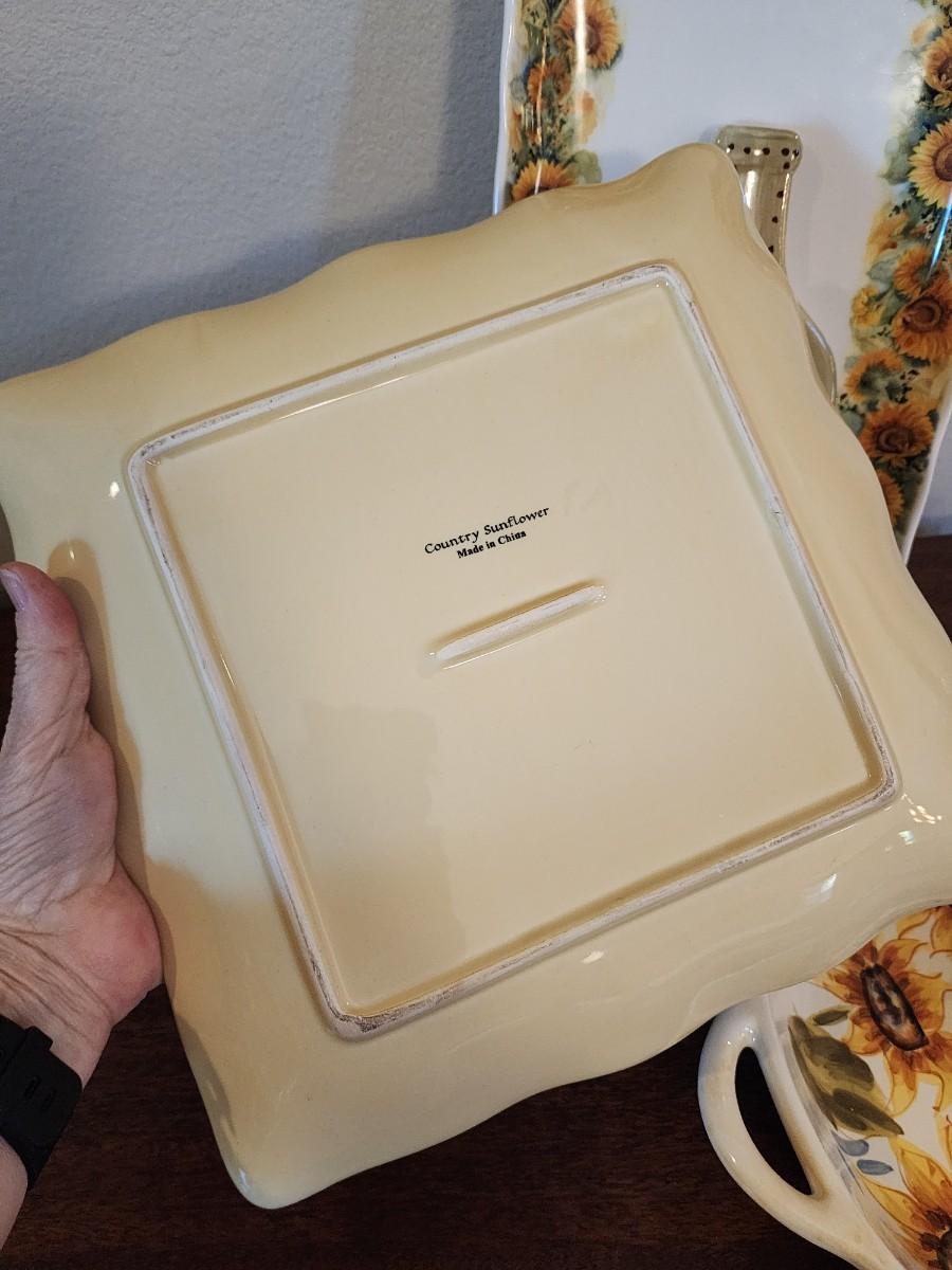 11" square tray with bold sunflowers, signed "Country Sunflower" China.