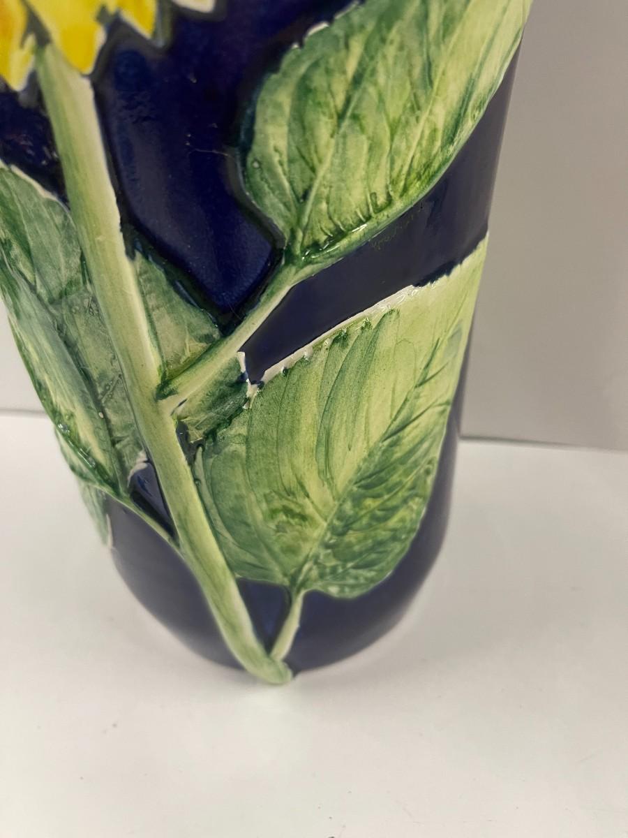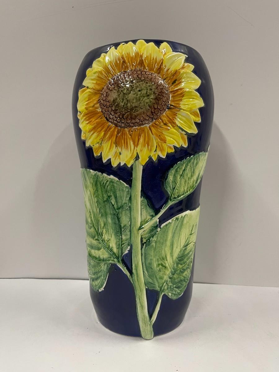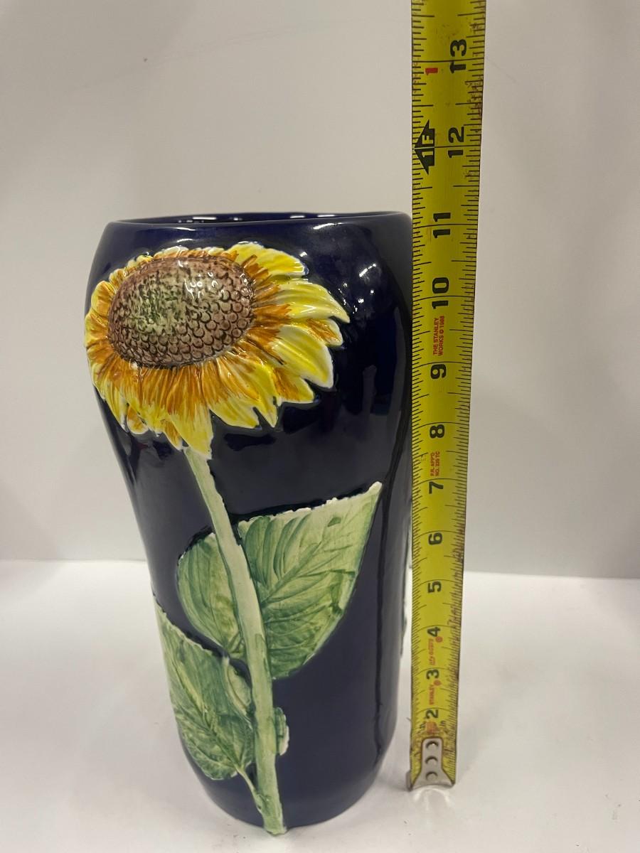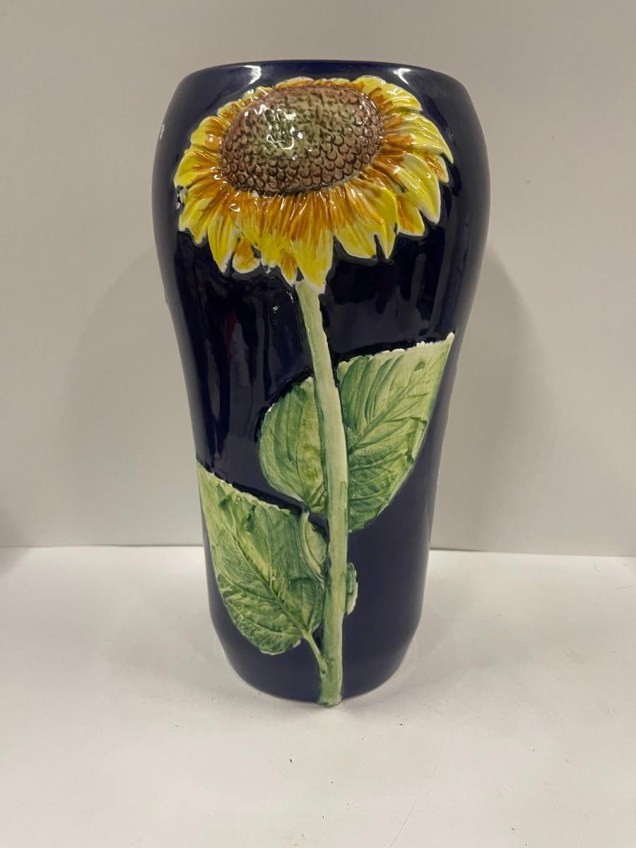 Ceramic sunflower vase on blue background. 11" high. Excellent condition.