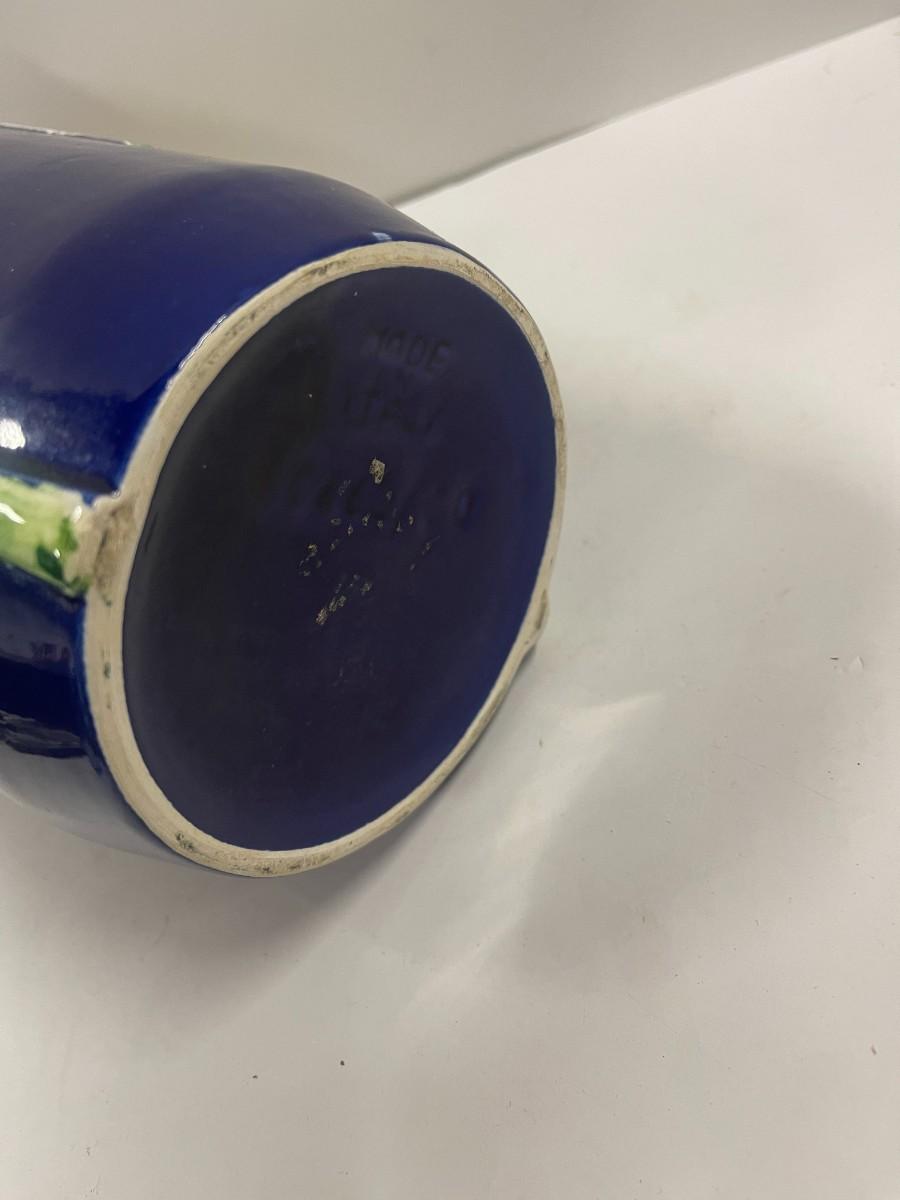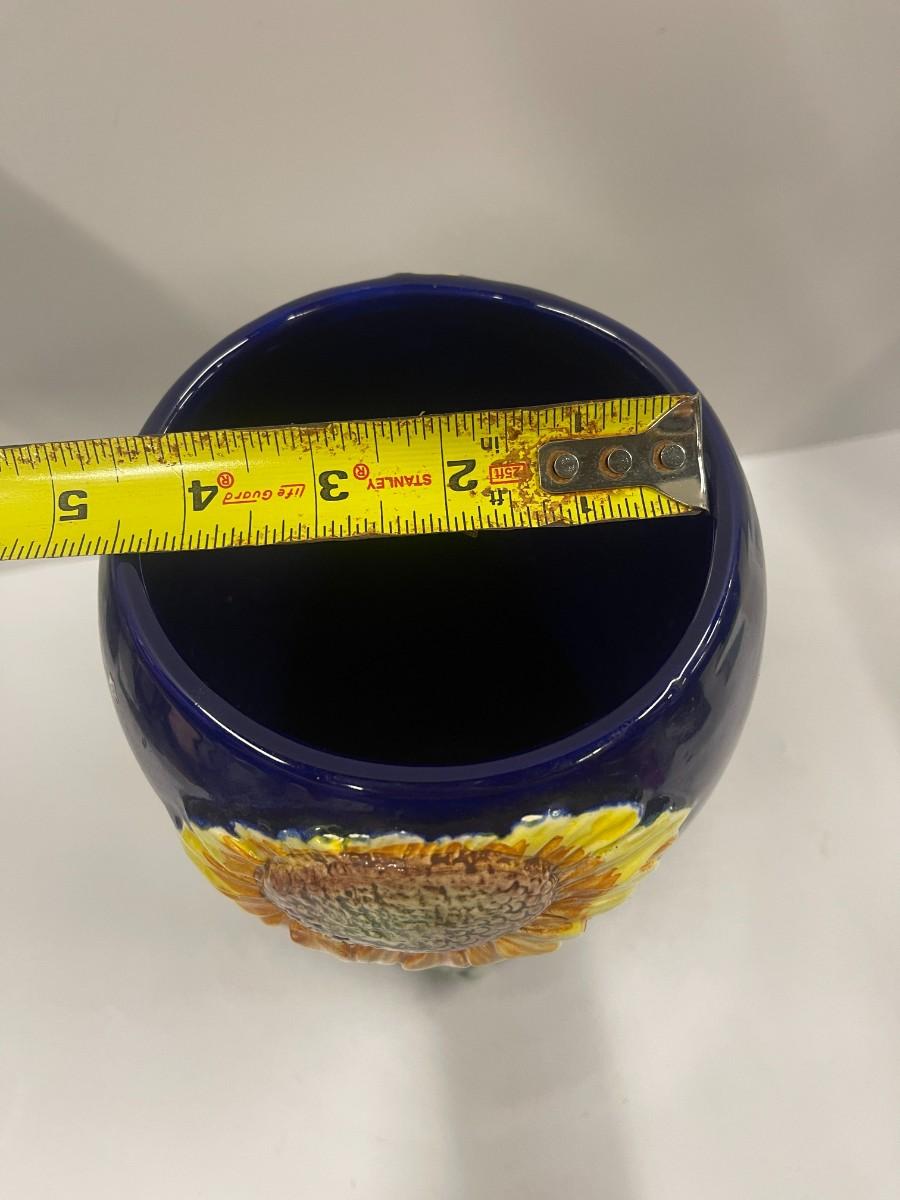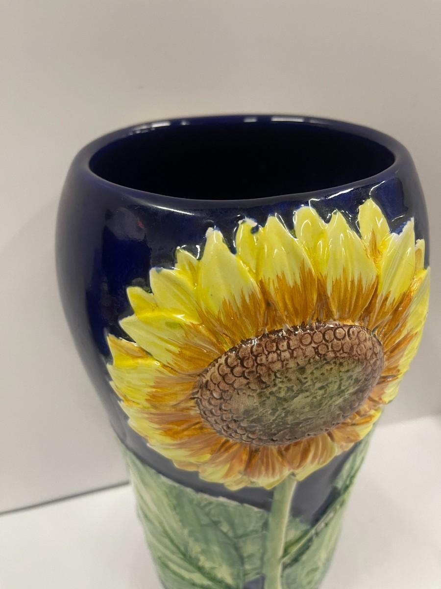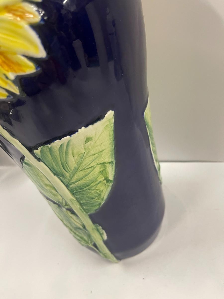 Ceramic sunflower vase on blue background. 11" high. Excellent condition.