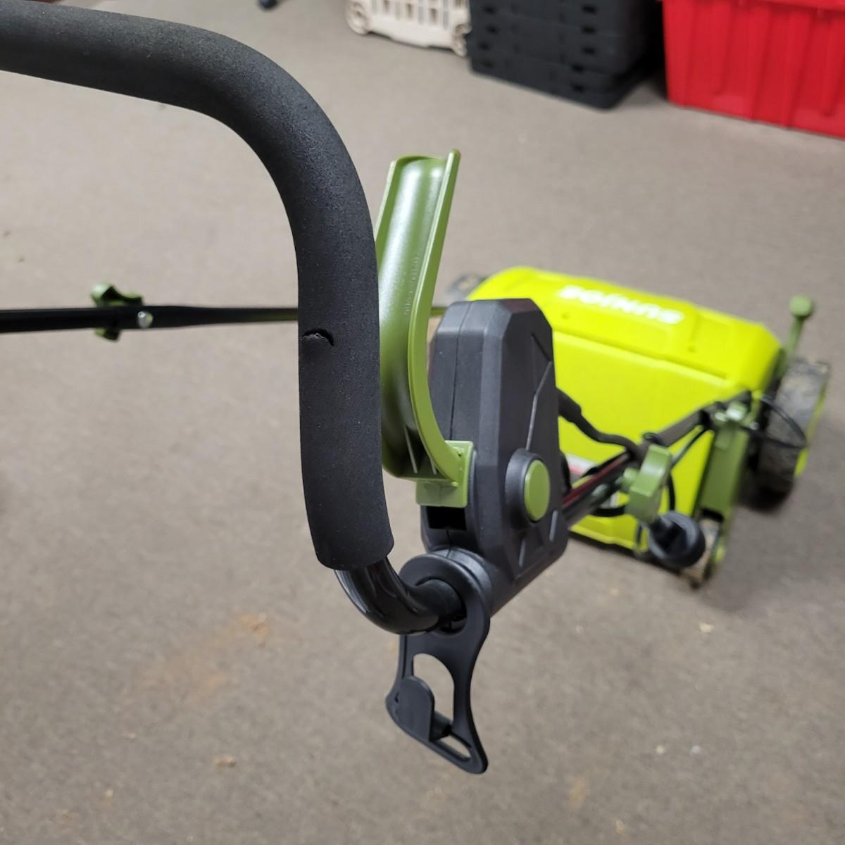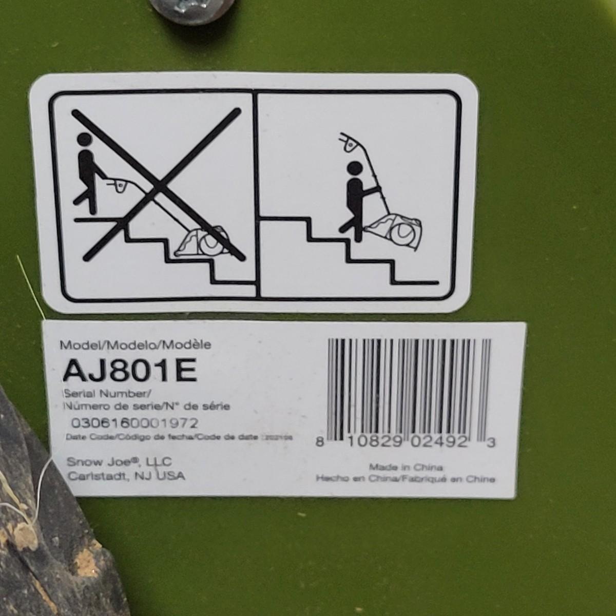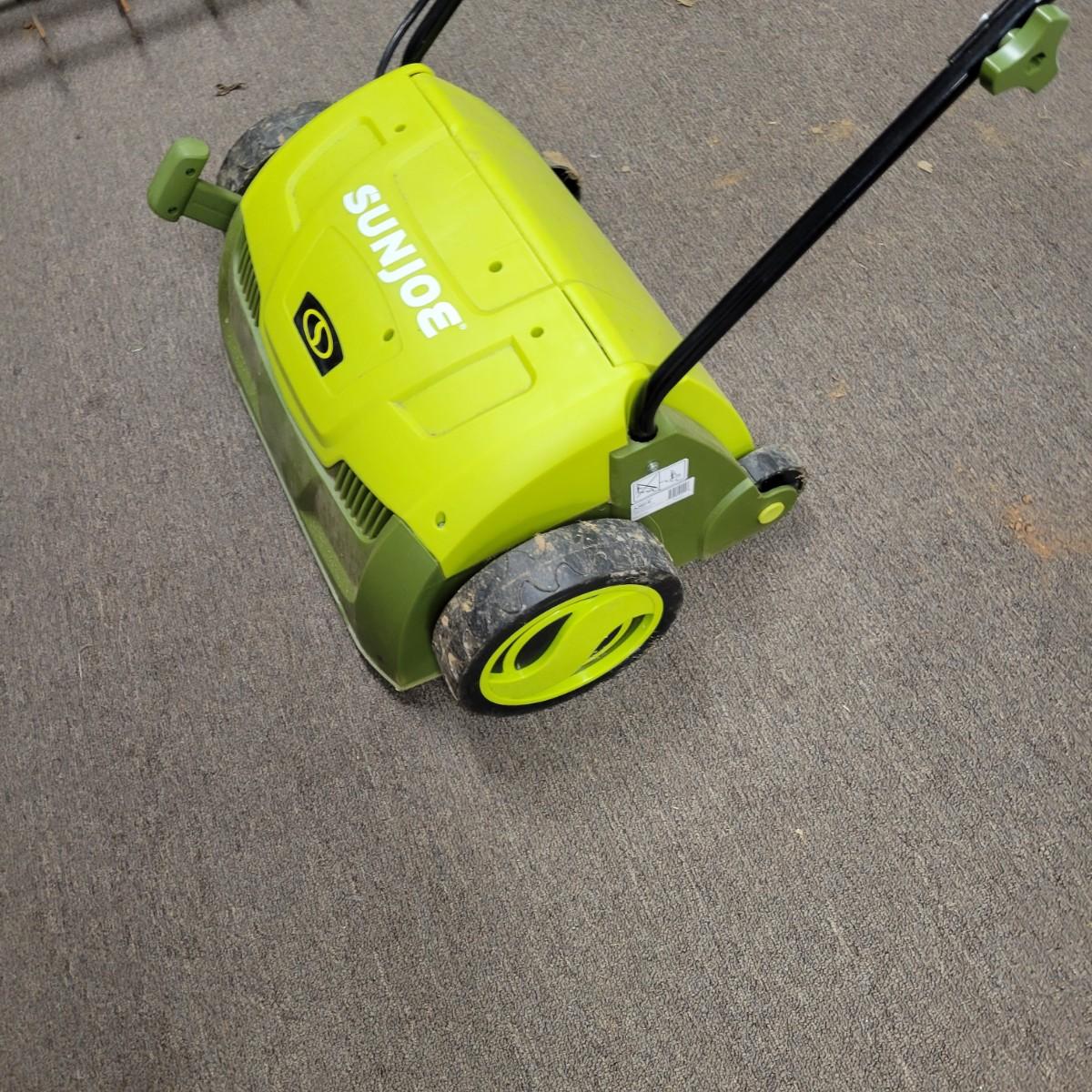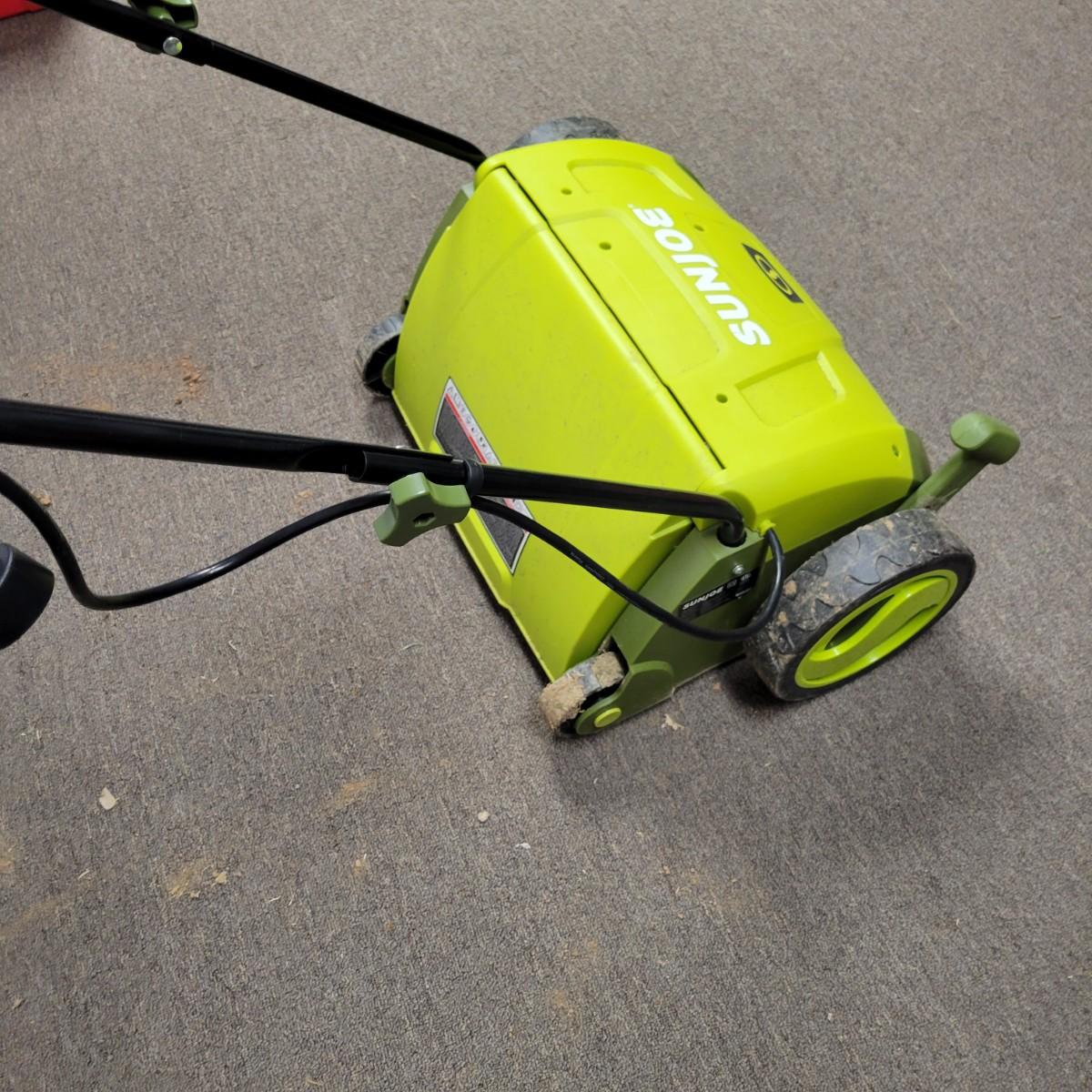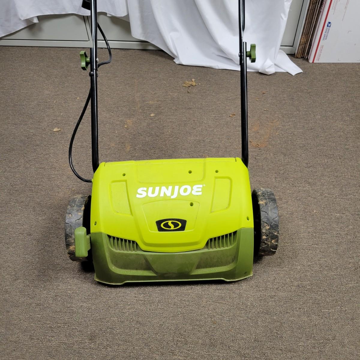 A Sunjoe electric dethatcher that has had some use. Model# AJ801E, it is powered by a 12amp motor and has a 13" dethatcher. Item was plugged in and powered on. Measures approximately 24" x 36" x 42"H. Local pickup only