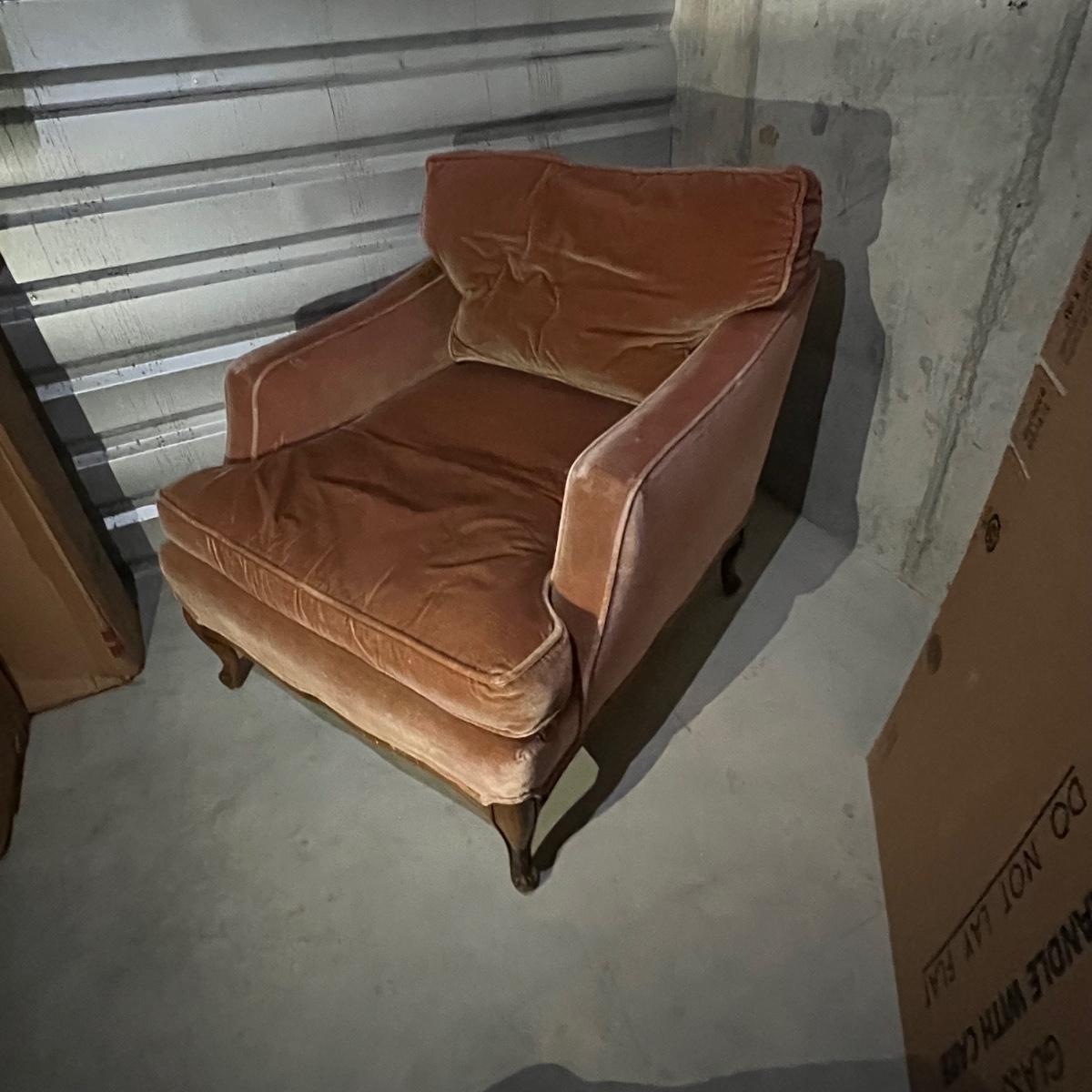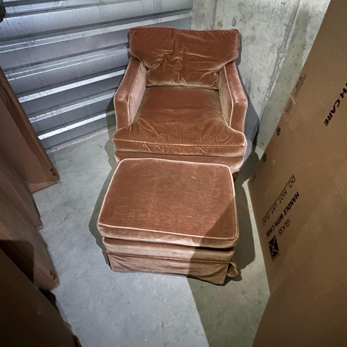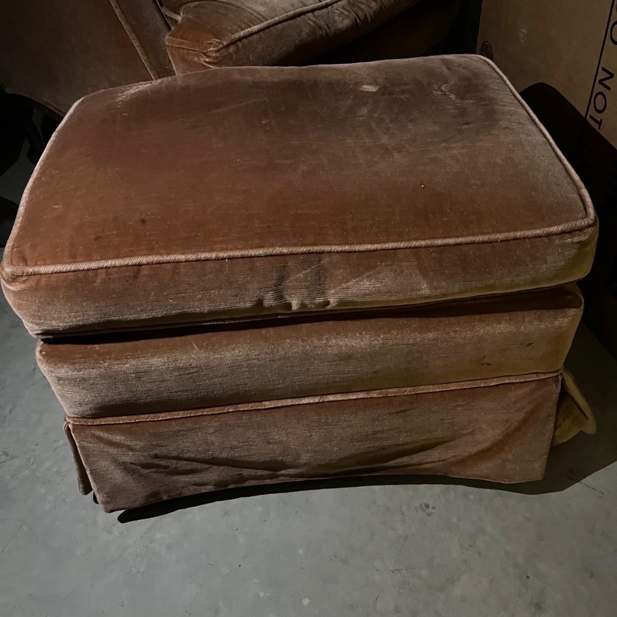 This beautiful chair and ottoman is a light tan color. (Lighting is a little deceptive in photos, the best description is a pale tan color). Super soft velvet like fabric with wooden frame that has curved and carved legs.