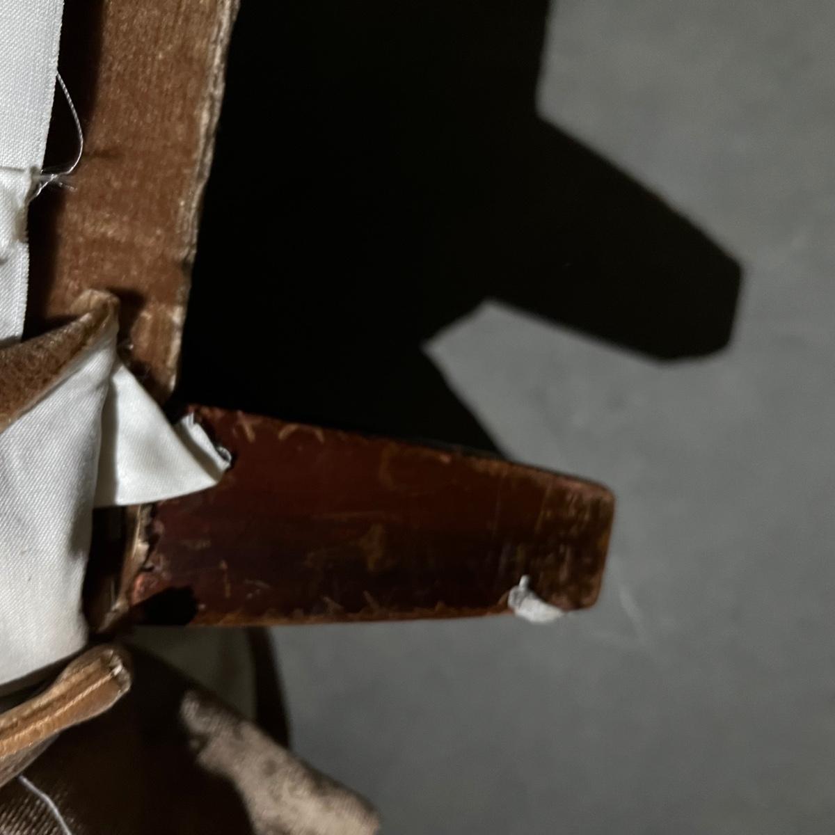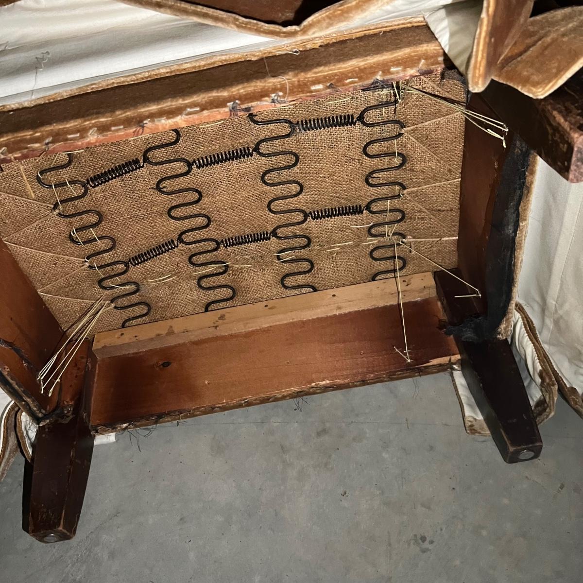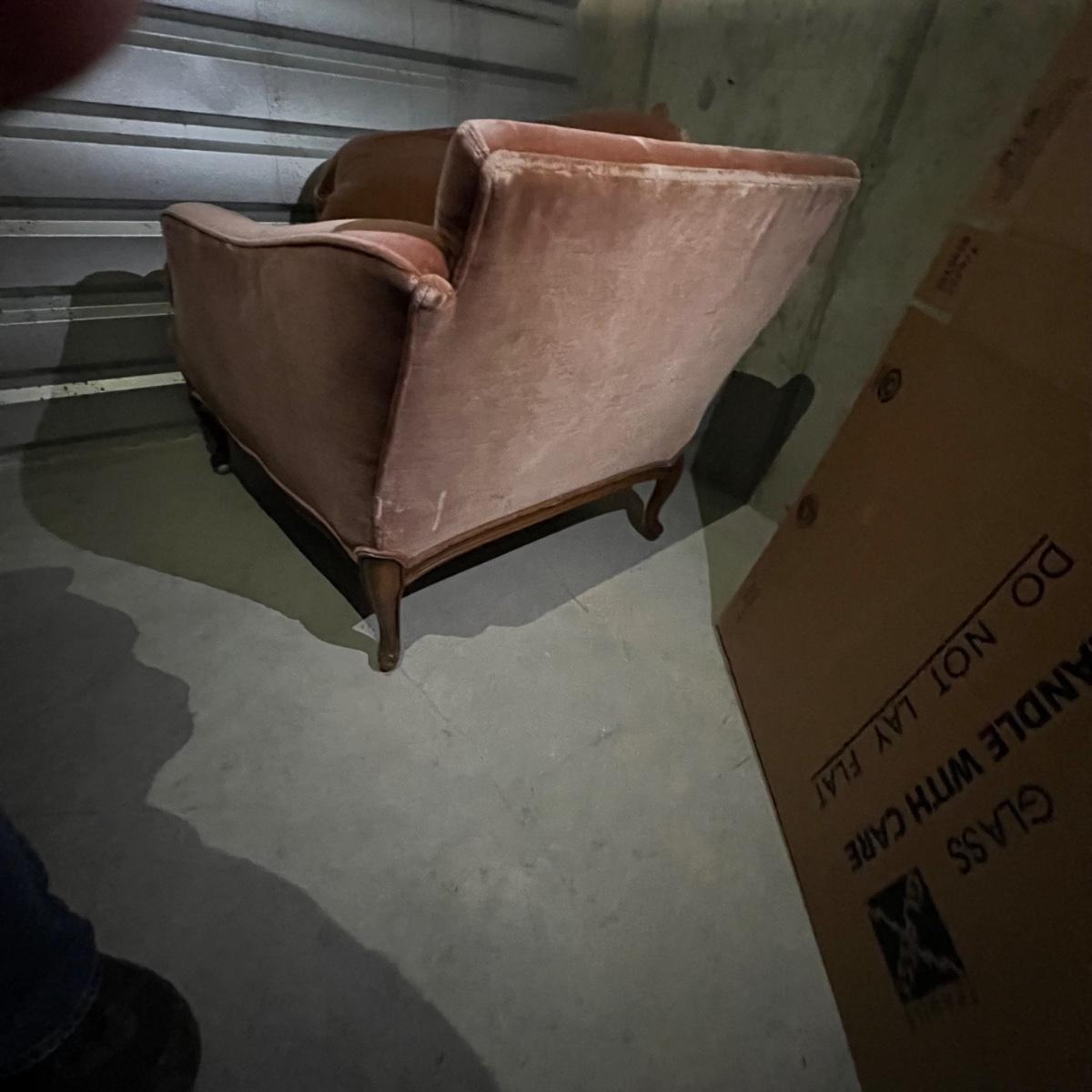 This beautiful chair and ottoman is a light tan color. (Lighting is a little deceptive in photos, the best description is a pale tan color). Super soft velvet like fabric with wooden frame that has curved and carved legs.