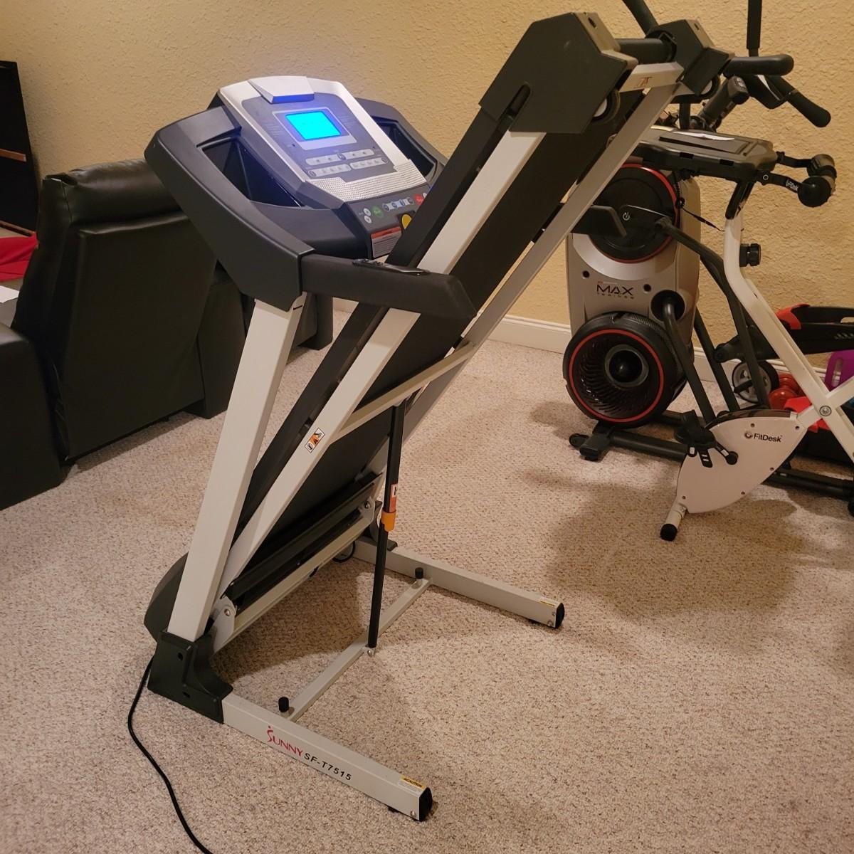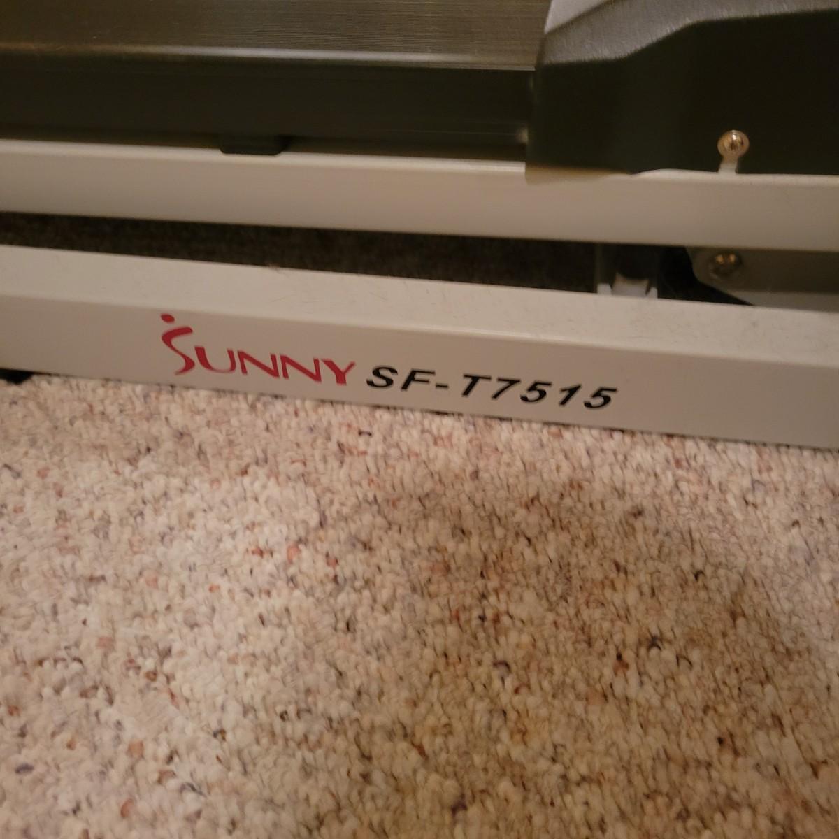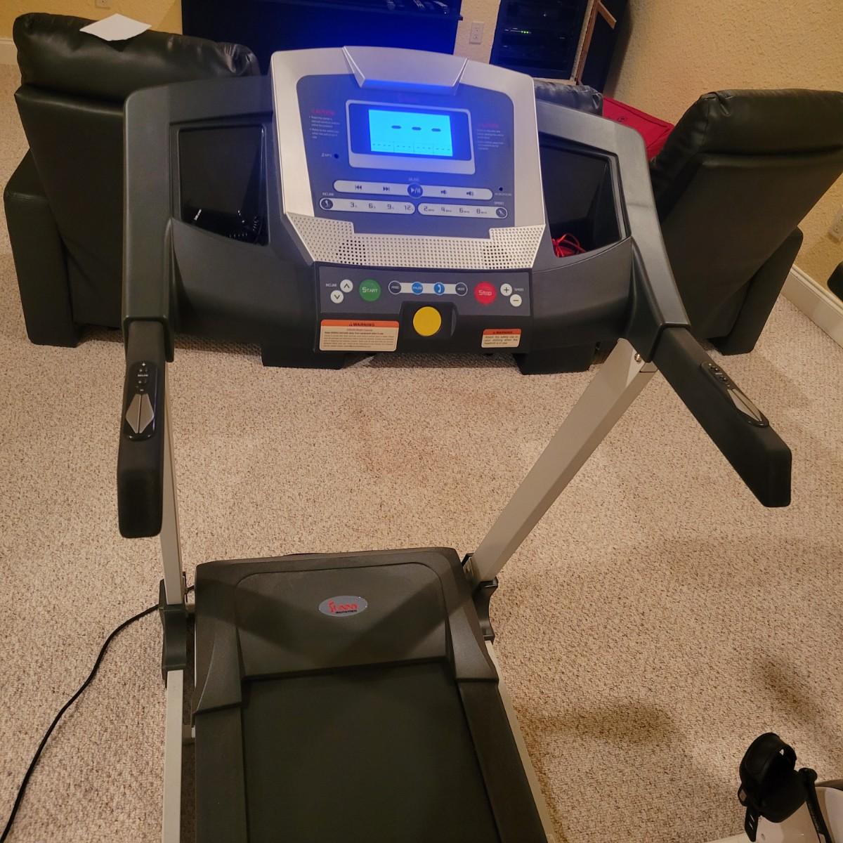 A treadmill made by Sunny Health and Fitness that powered on when plugged in. Orange extension cord not included. This item features incline and variable speeds. It also folds up for convenient storage. It measures approximately 64" x 27.5" x 51". Local pickup only. Winning bidder must bring assistance to help move and load this item due to its weight and/or size.
