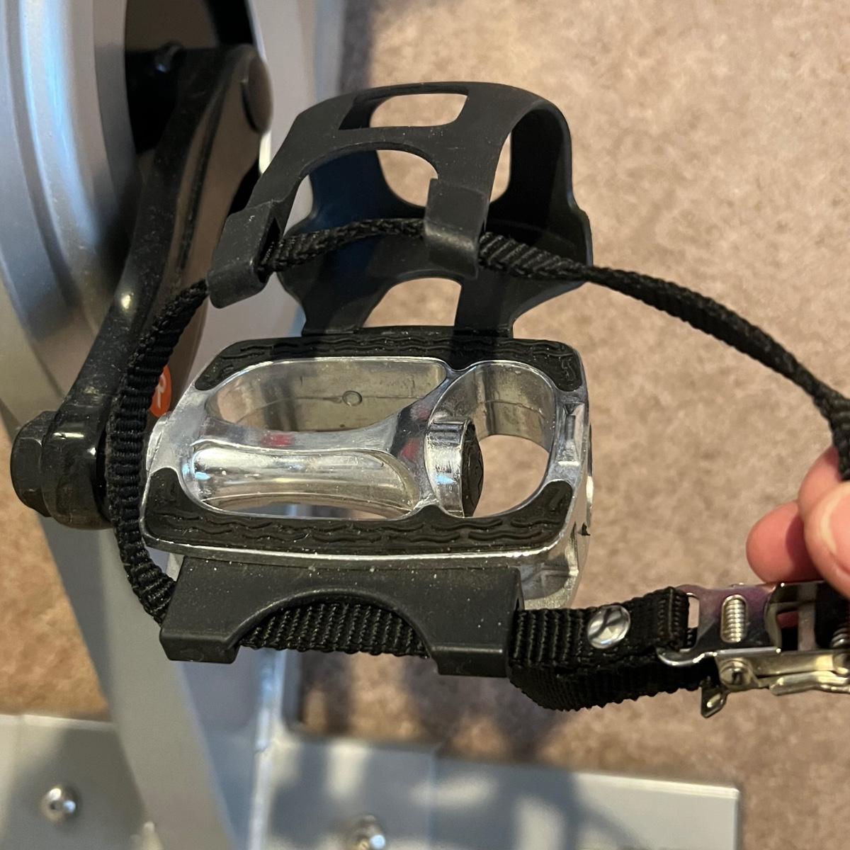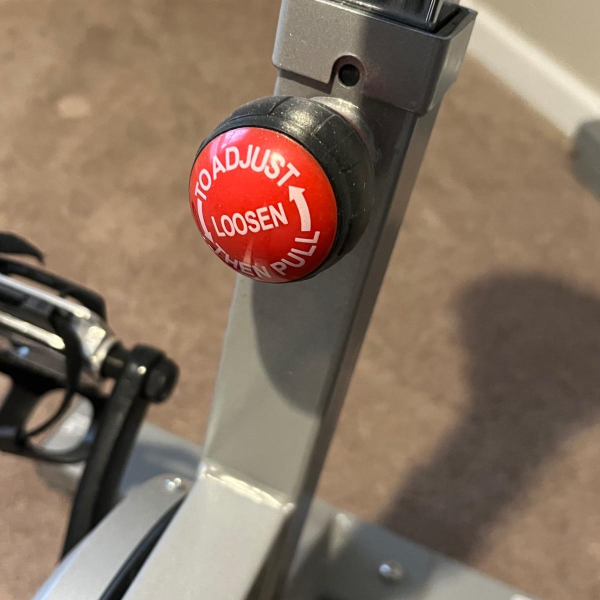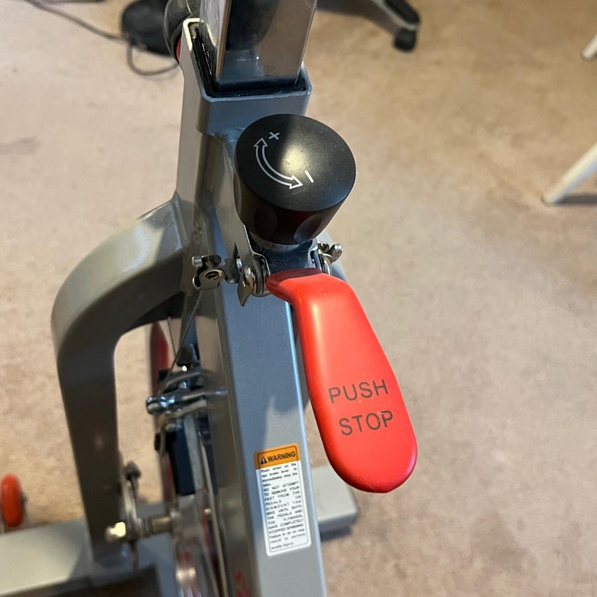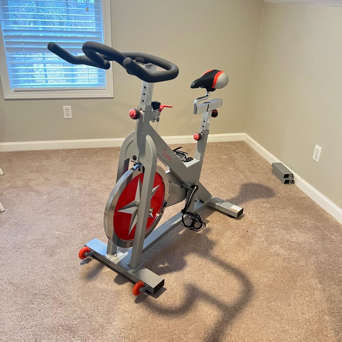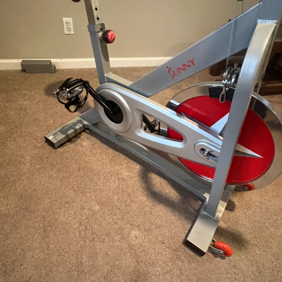 Sunny Health & Fitness SF-B901 Pro Indoor Cycling Bike. Bike appears to be in great working condition. A couple of extra stands are included that appear to be surplus parts.