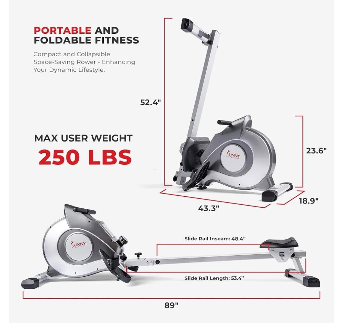 Sunny Health and Fitness Magnetic Rowing Machine with extended slide rail. Provides for a low-impact full-body workout. 89" long when in use, rail can be folded so that it only needs 44" of space. Excellent used condition, always used inside. No damage, very clean.