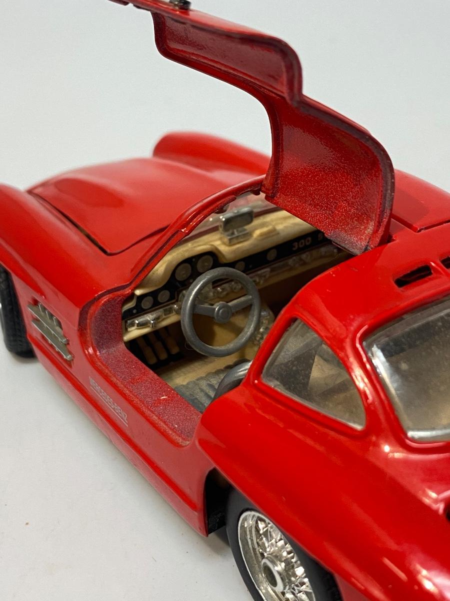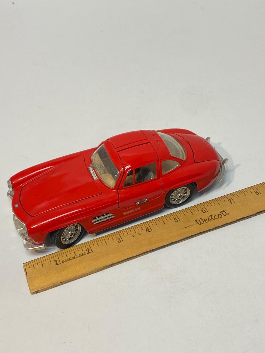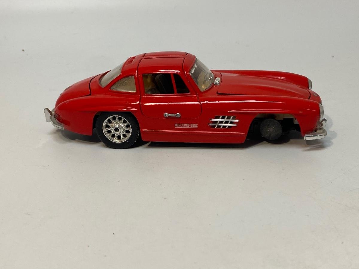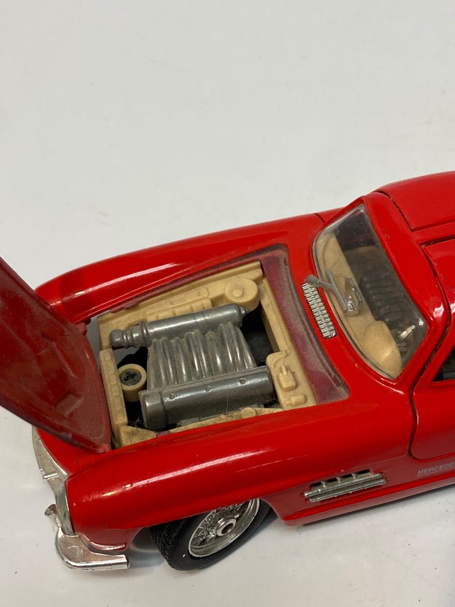 Sunnyside Diecast 1/24 Scale Red 1954 Mercedes Benz 300SL Model Toy Car. Gullwing doors, hood, and trunk open. It is missing a front tire but can be displayed nicely with the other side facing out.