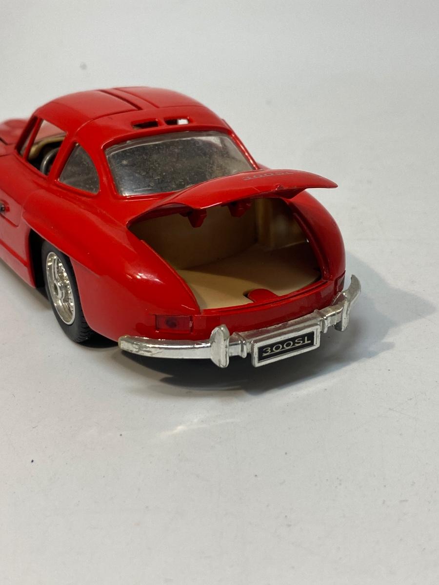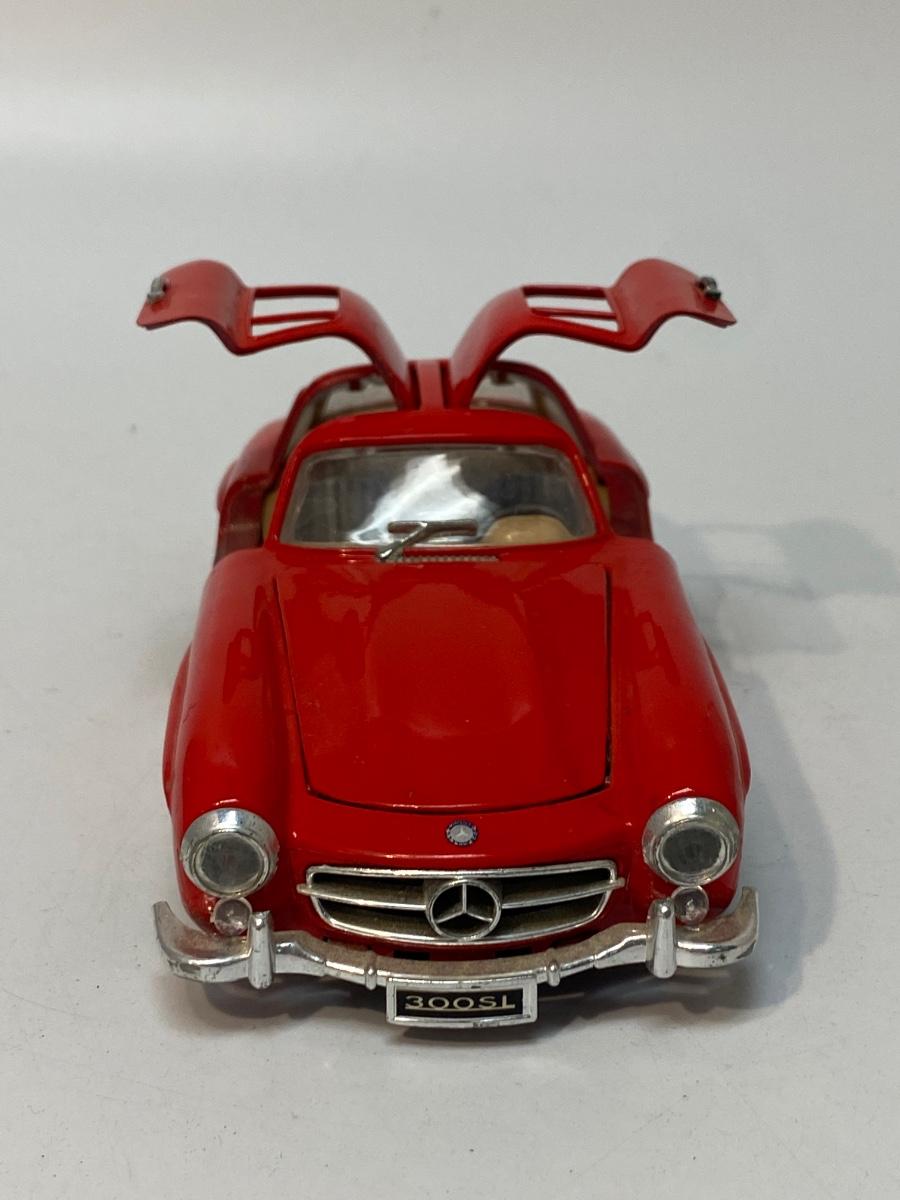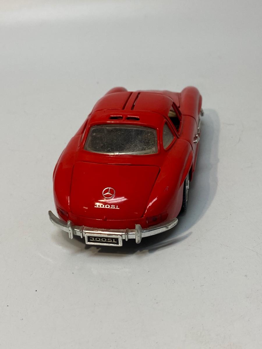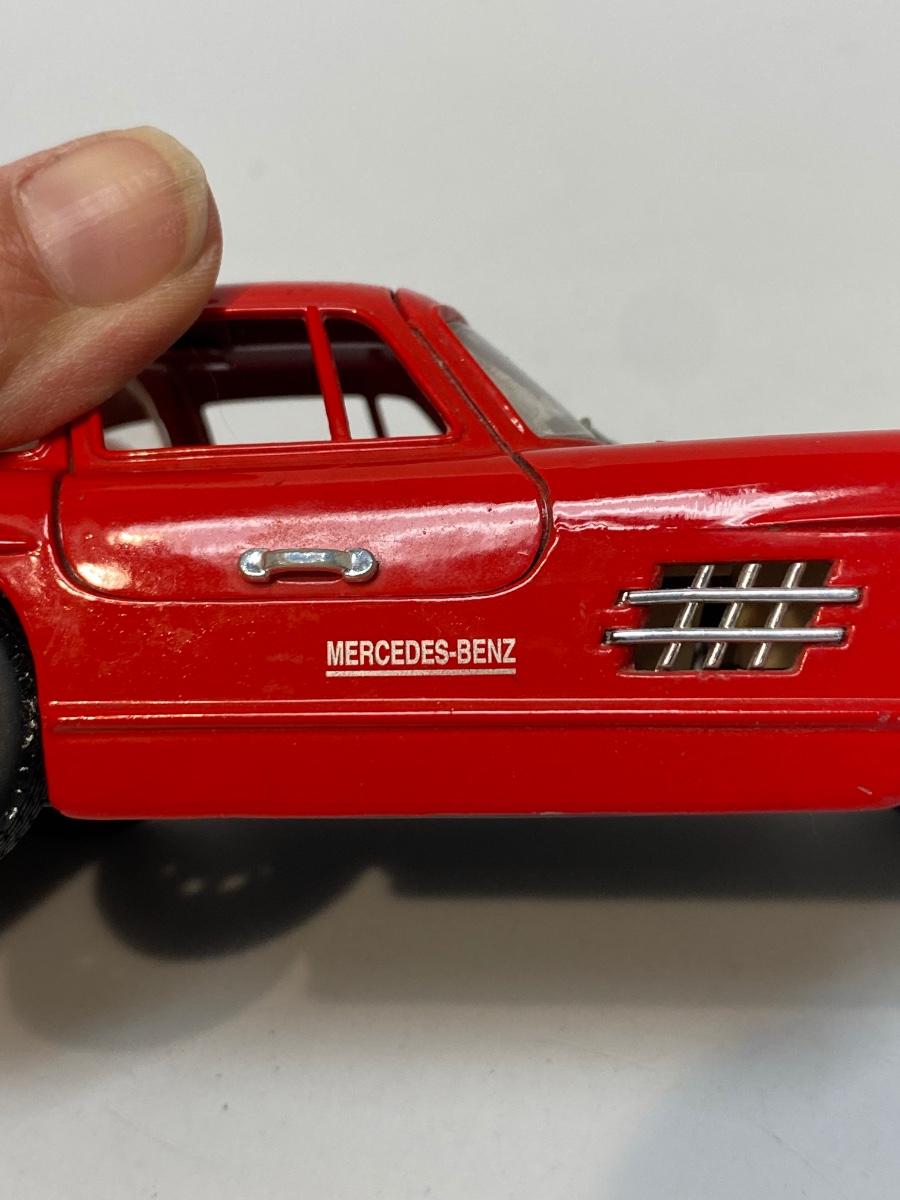 Sunnyside Diecast 1/24 Scale Red 1954 Mercedes Benz 300SL Model Toy Car. Gullwing doors, hood, and trunk open. It is missing a front tire but can be displayed nicely with the other side facing out.
