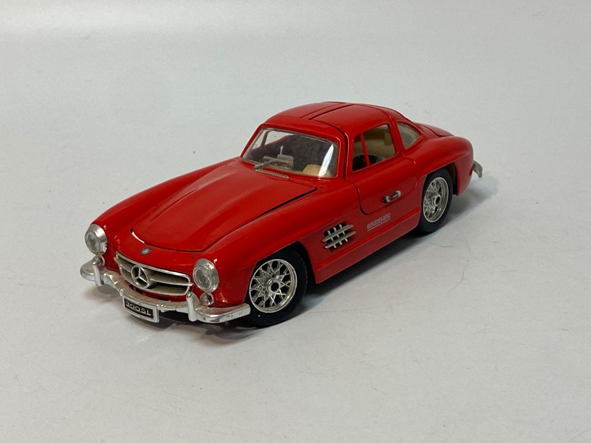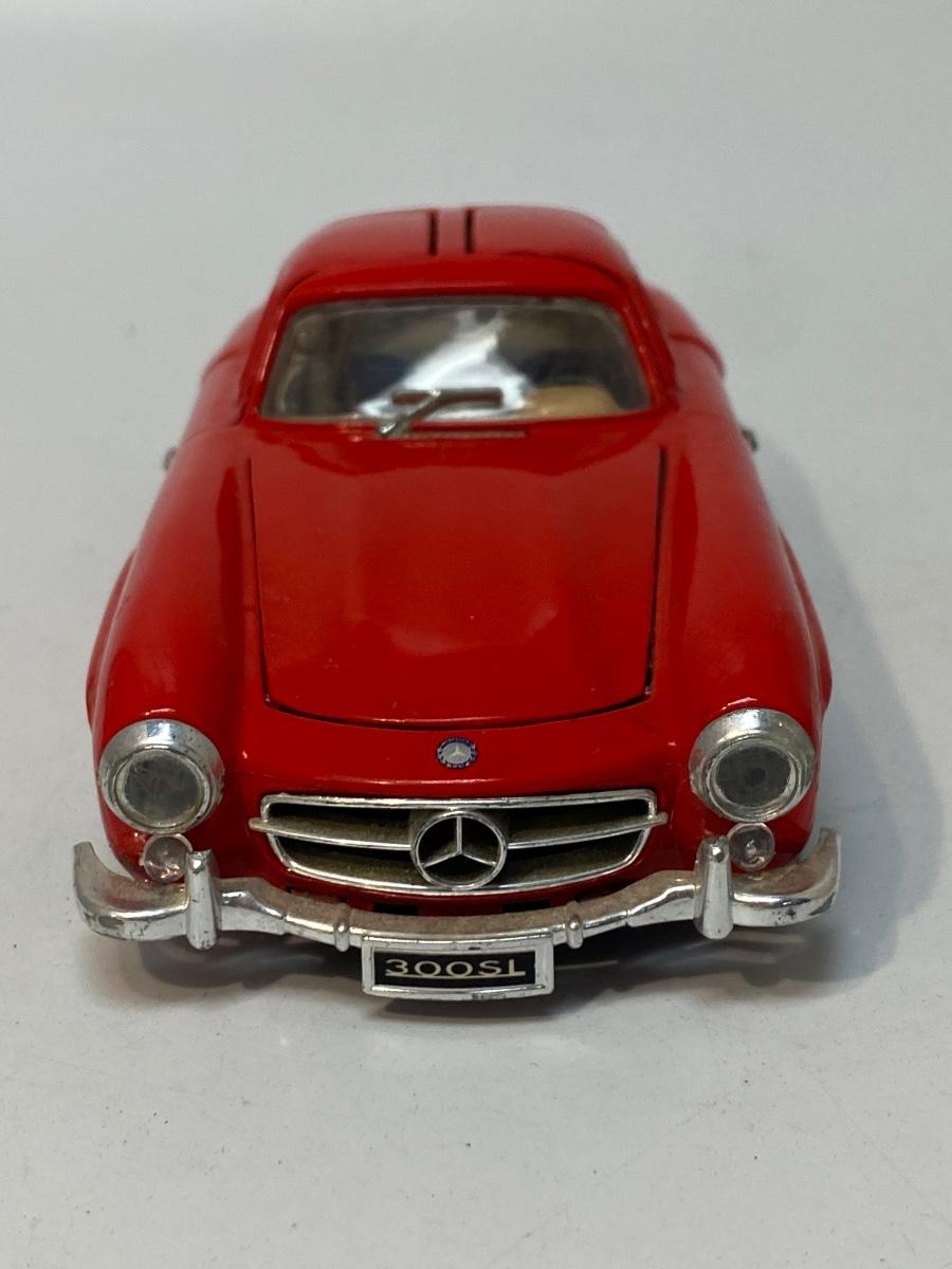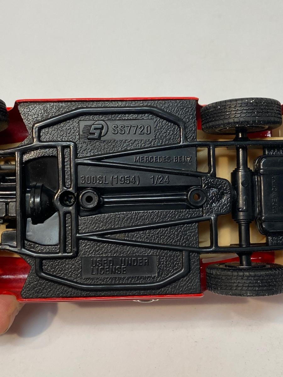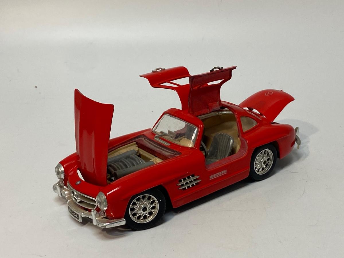 Sunnyside Diecast 1/24 Scale Red 1954 Mercedes Benz 300SL Model Toy Car. Gullwing doors, hood, and trunk open. It is missing a front tire but can be displayed nicely with the other side facing out.