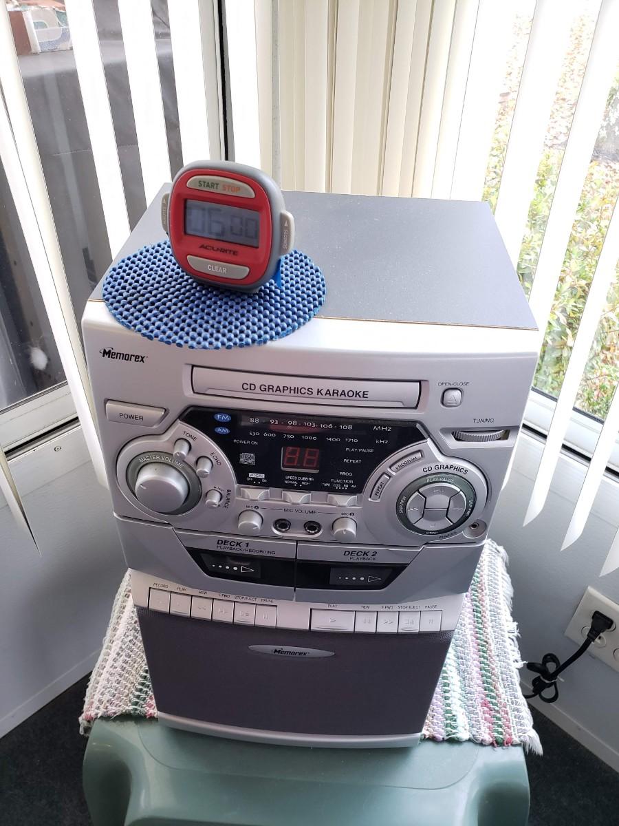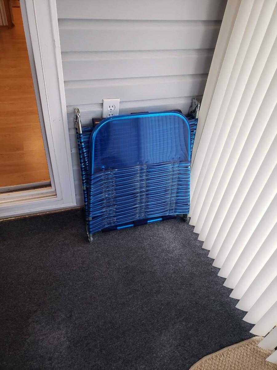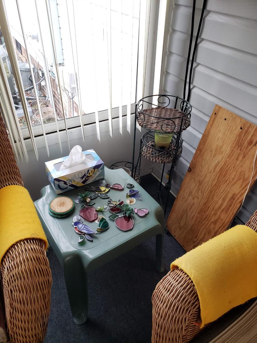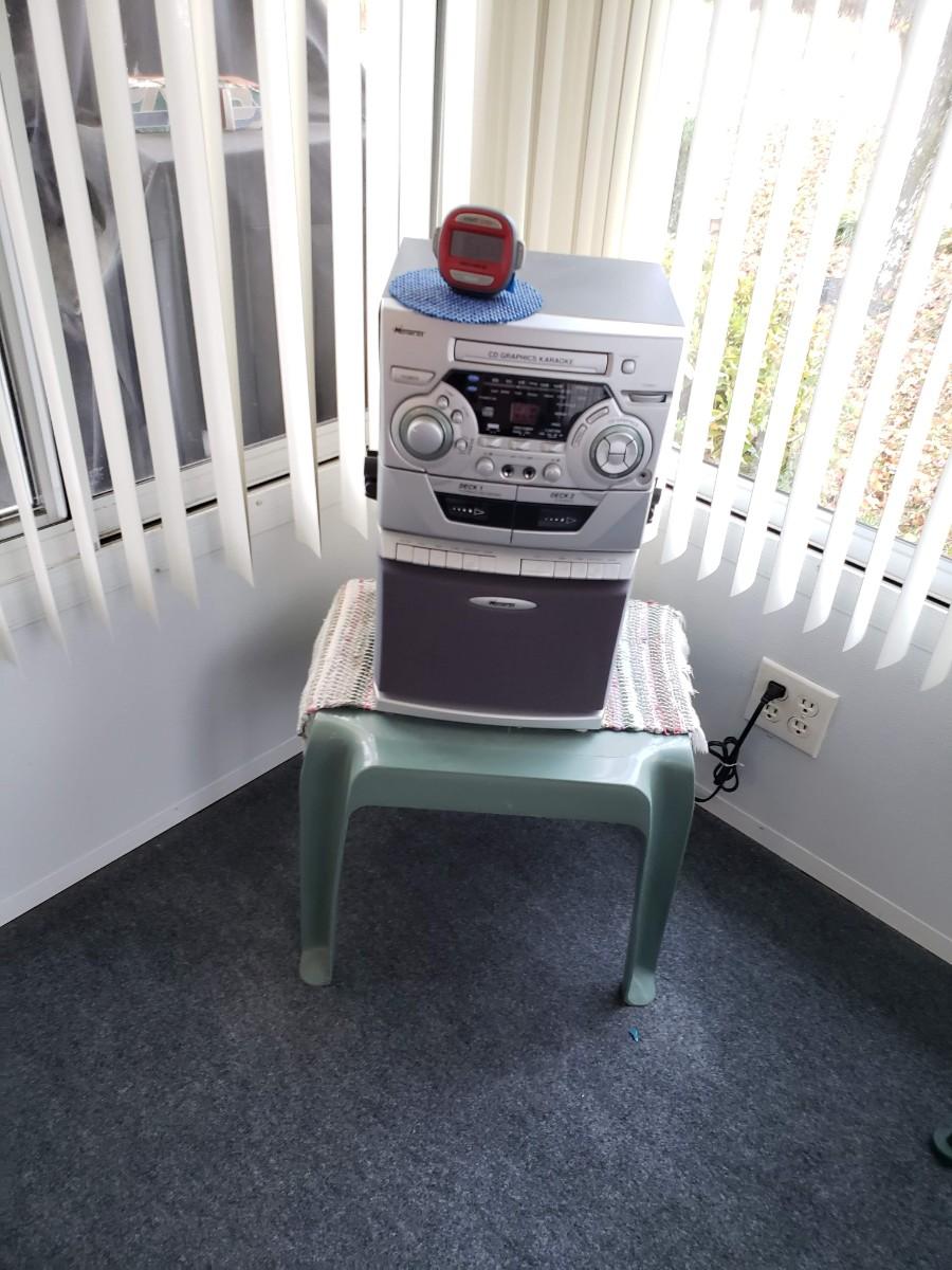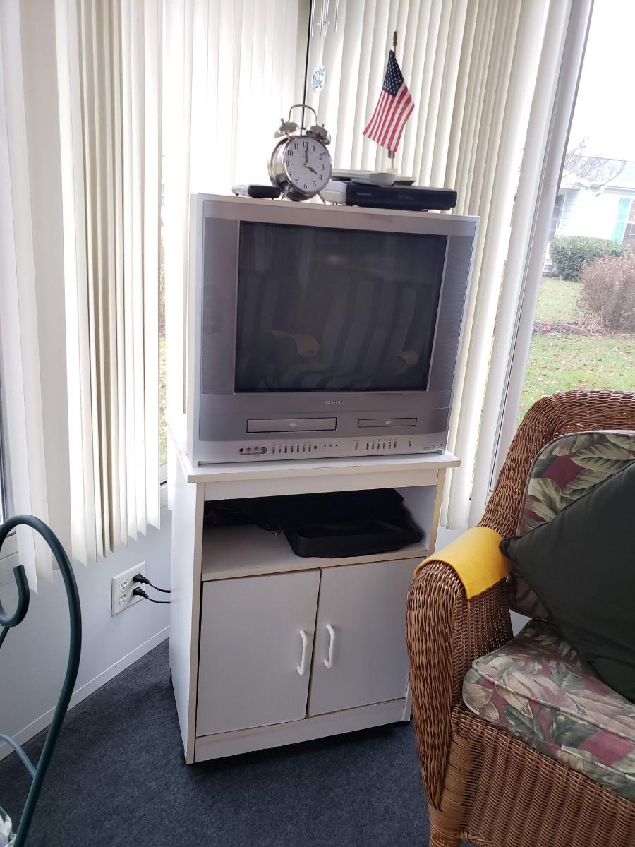Remaining contents of sunroom, lawn chair, TV, karaoke machine, and foot stool