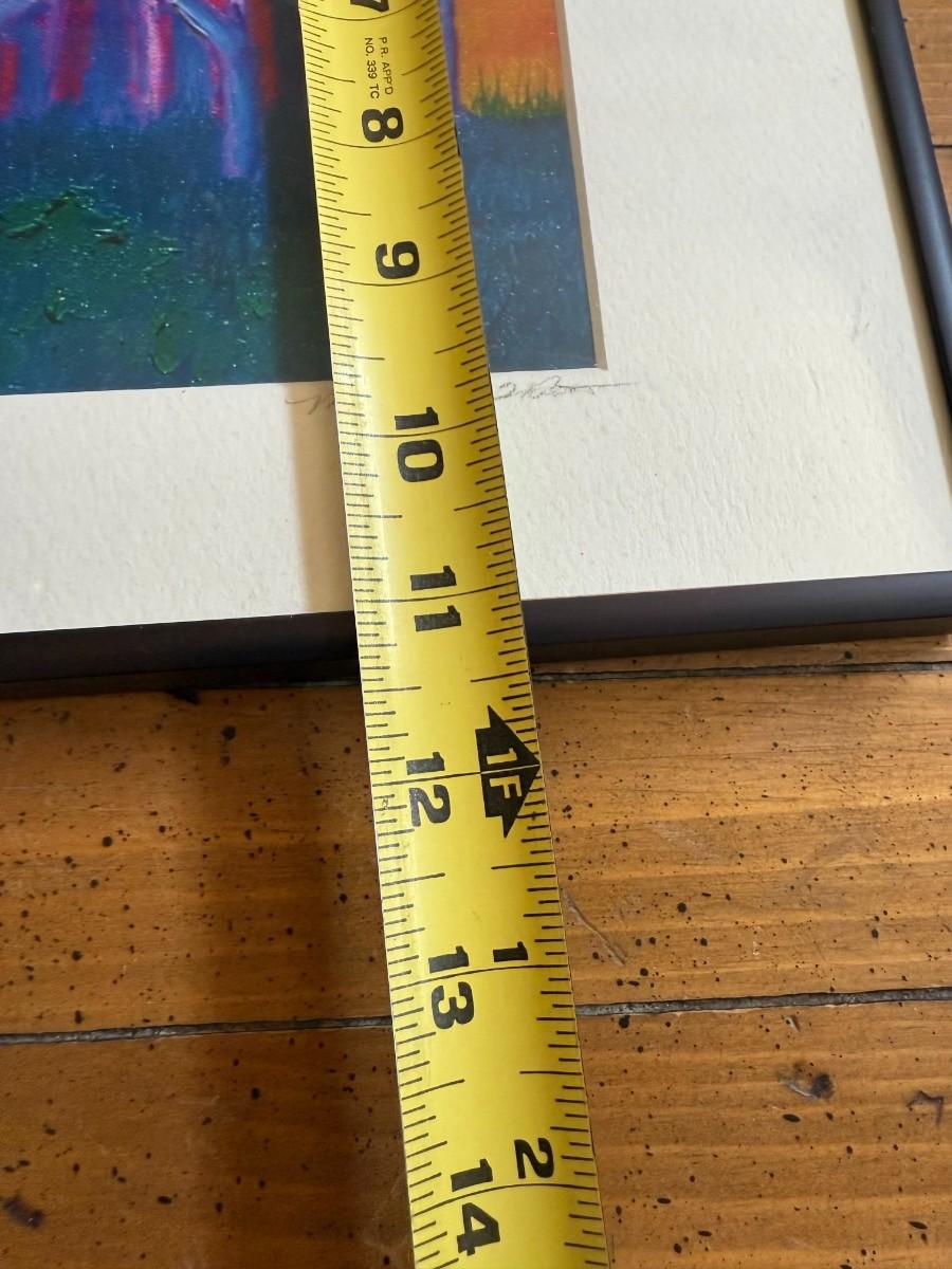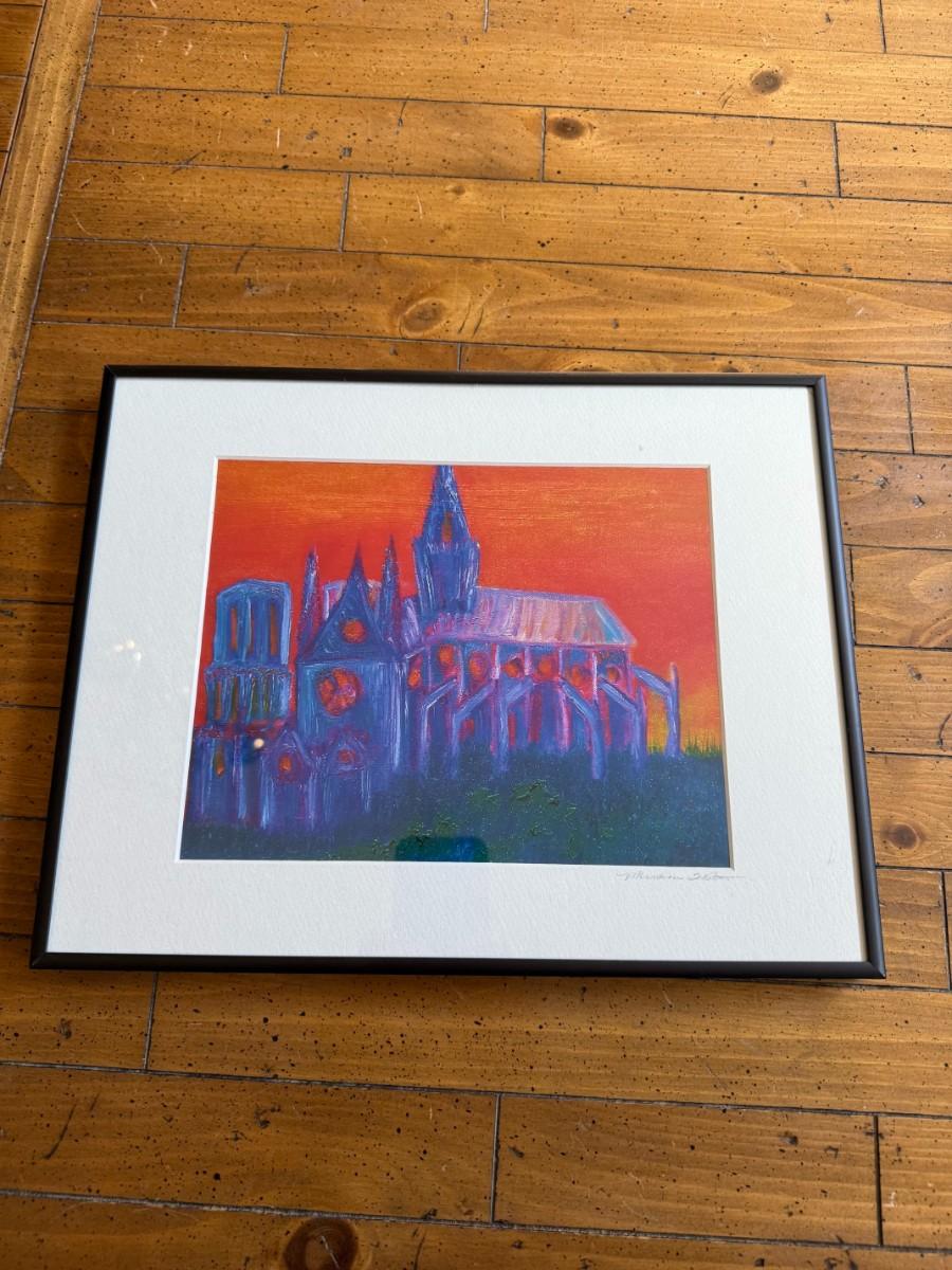 Vivid and bold colors depicting a cathedral against a red sky. Signed by artist.