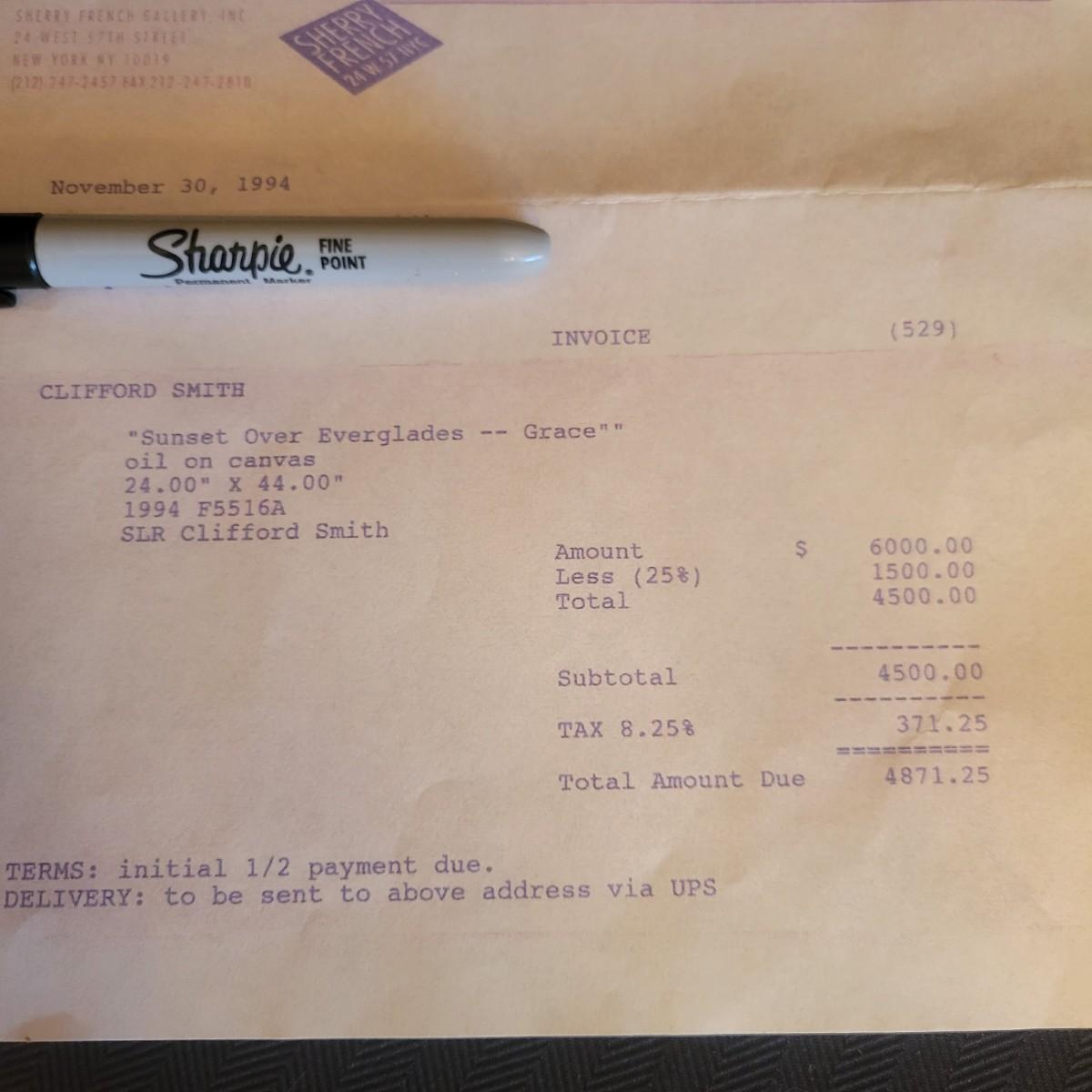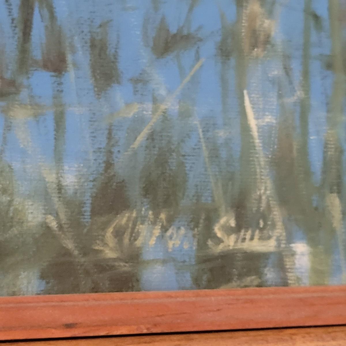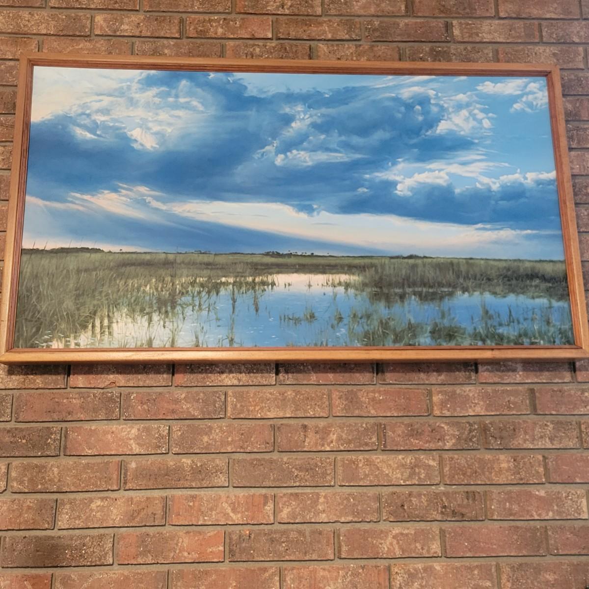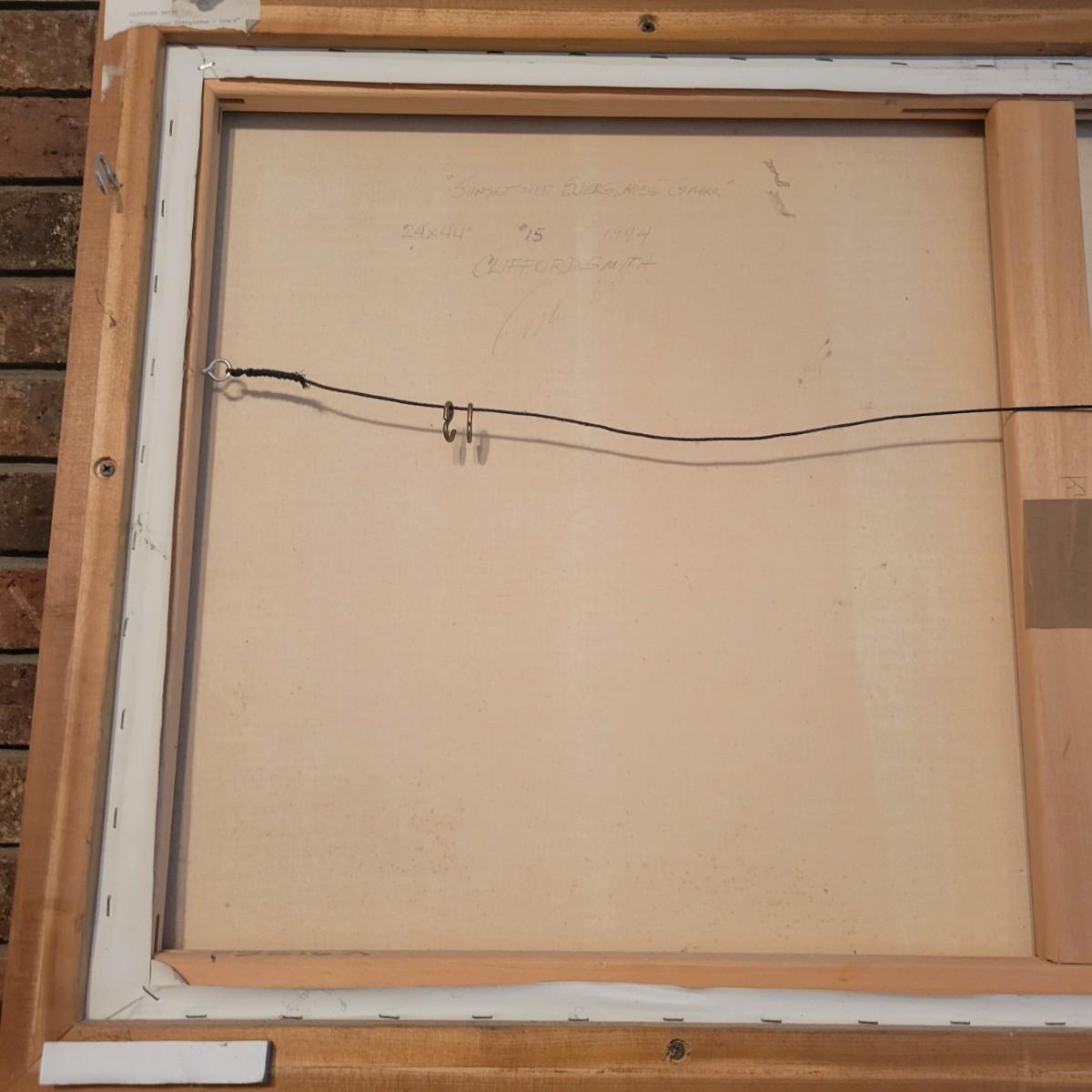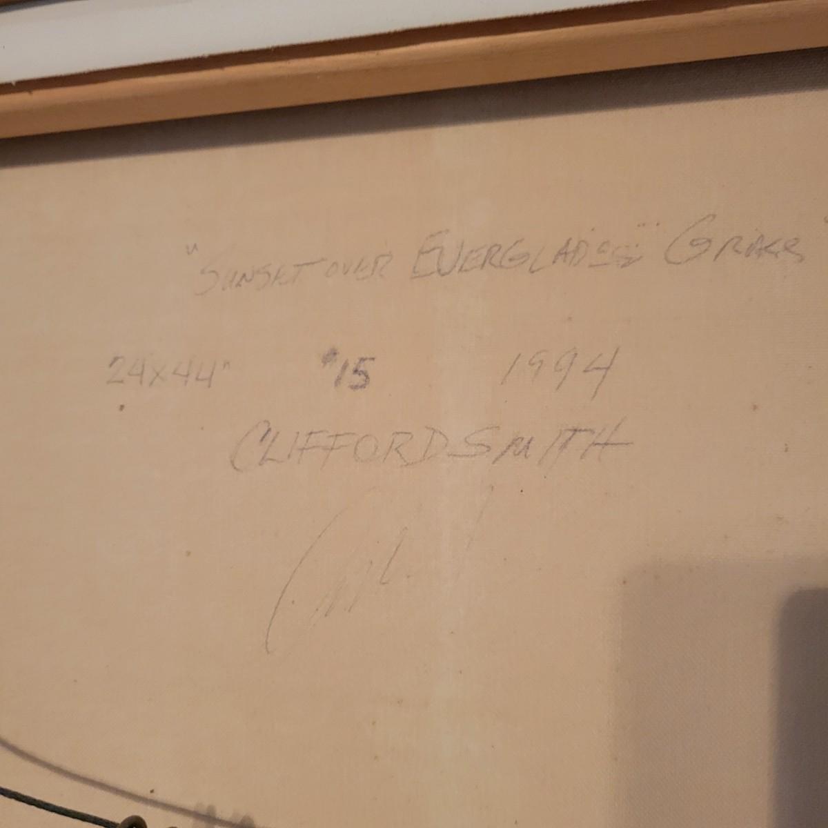 An original oil painted by Clifford Smith titled "Sunset Over Everglades" that measures approximately 45.5" x 2.5" x 25.5"H. It is framed in a wooden frame with a natural finish. Shipping available. Shipping can be costly. We suggest contacting our preferred local shipping provider, Postage Express, with dimensions and getting an estimate before bidding: (828) 670-5501 or postageexpress@yahoo.com.