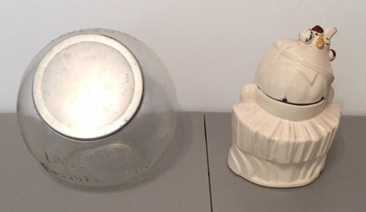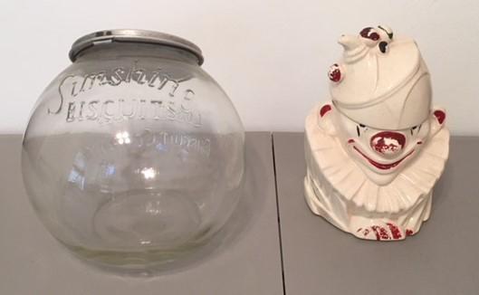 The Sunshine biscuit jar is in excellent condition. The McCoy cookie jar does have missing paint and crazing however, there are no cracks or chips