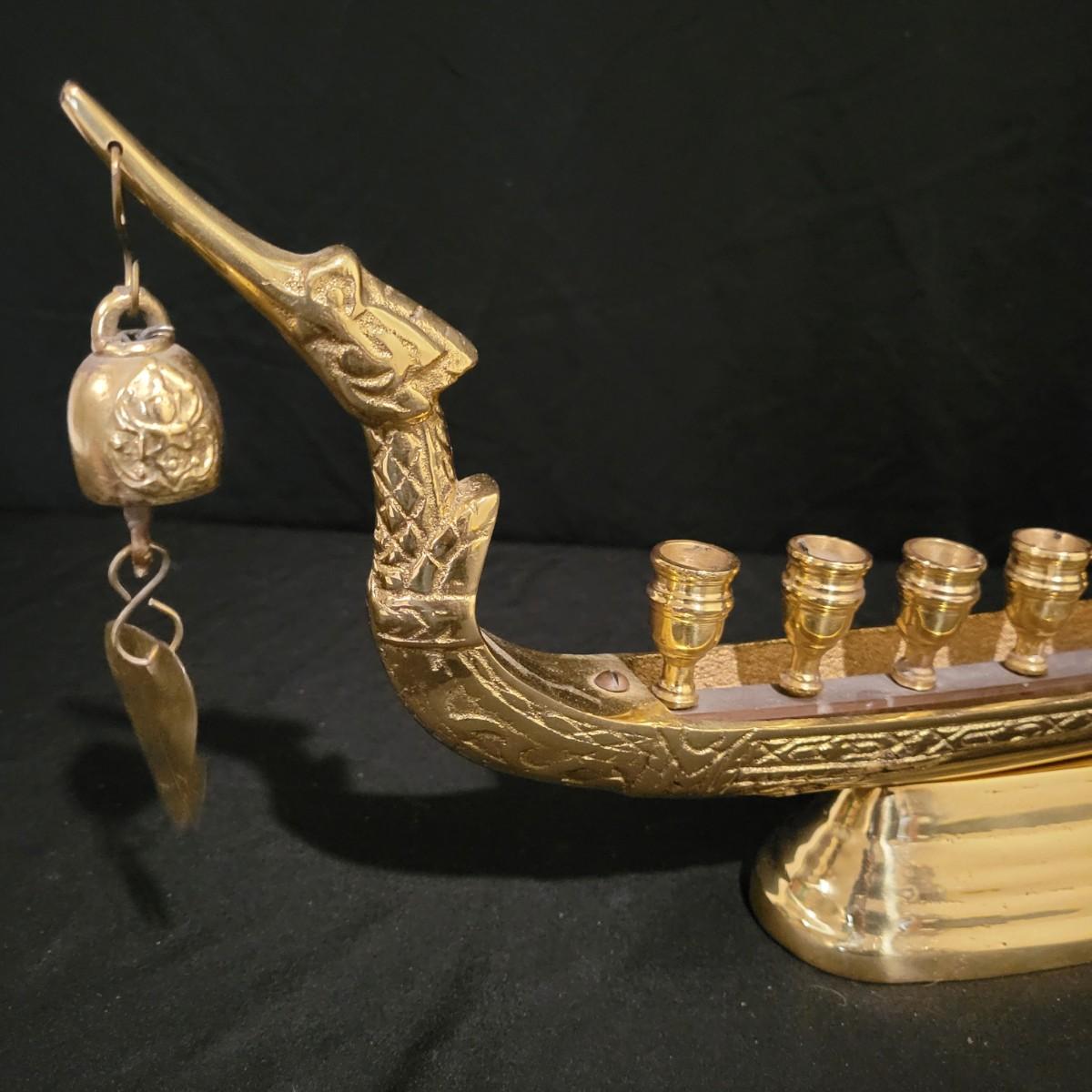A brass Suphannahong-style dragon boat menorah. It features a bell hanging on the front and has detailed engravings on the boat. It measures approximately 22" x 3" x 8.5"H. Shipping available