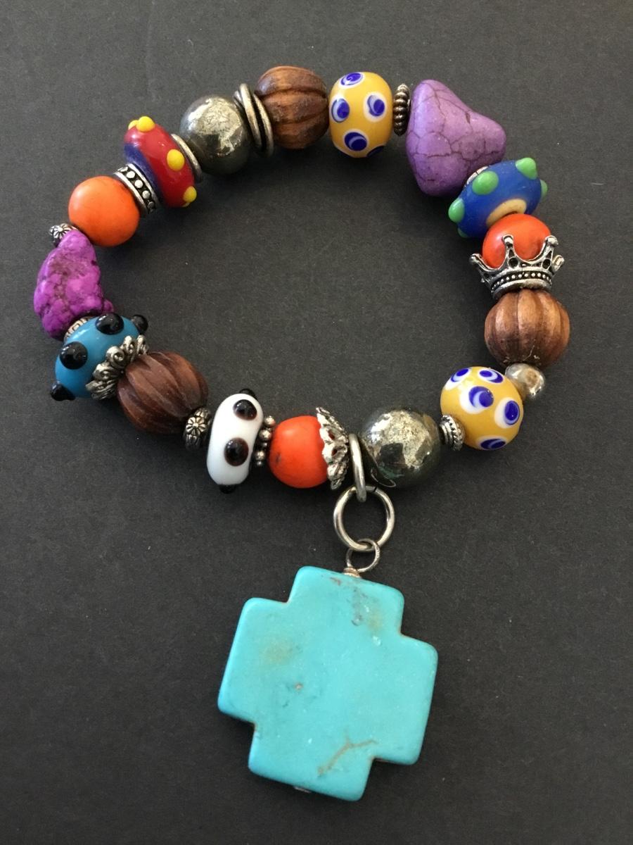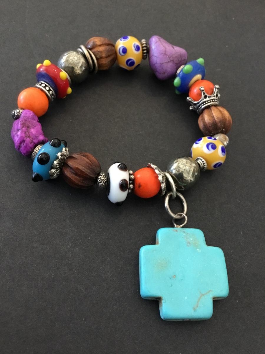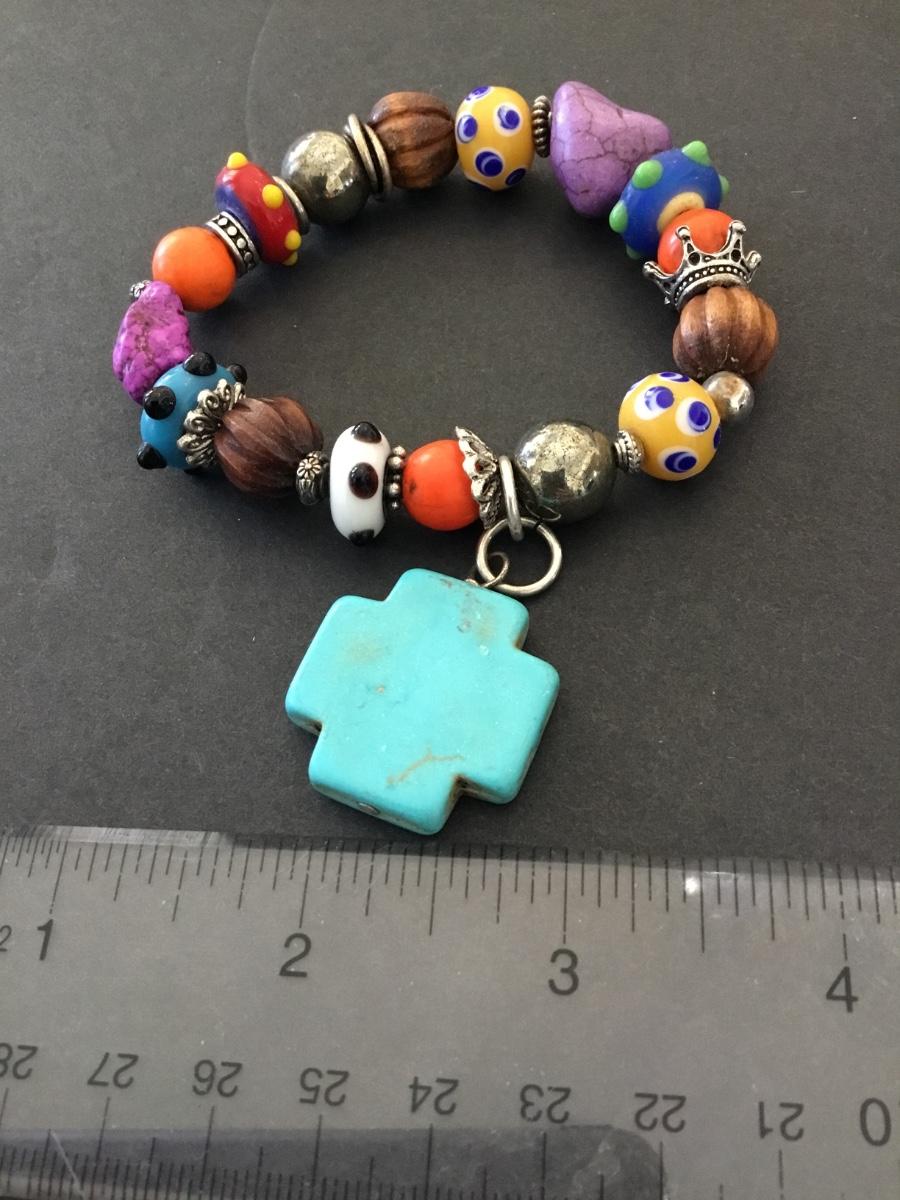 Super cute colorful, art, glass bead stretch, bracelet, faux, turquoise, cross charm