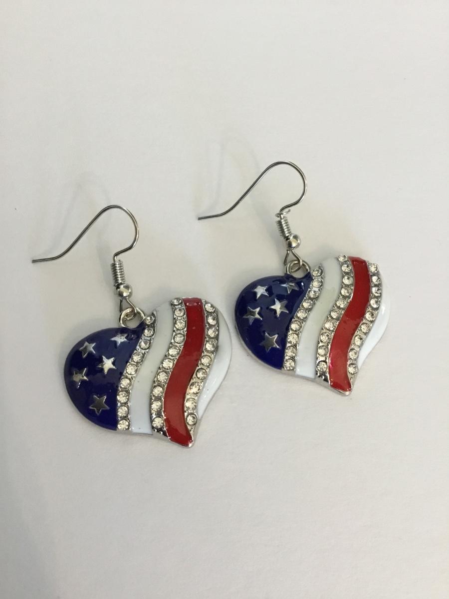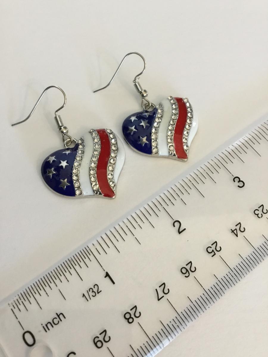 Super cute, enamel, red, white and blue rhinestone heart dangle earrings