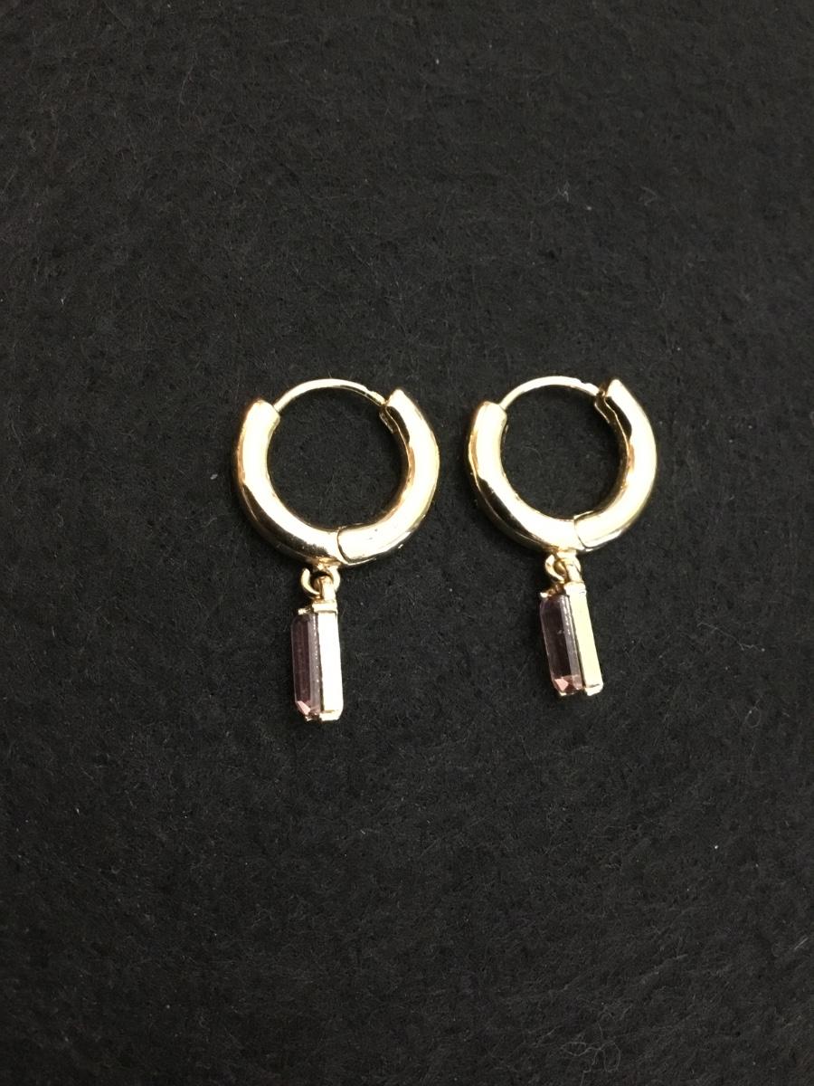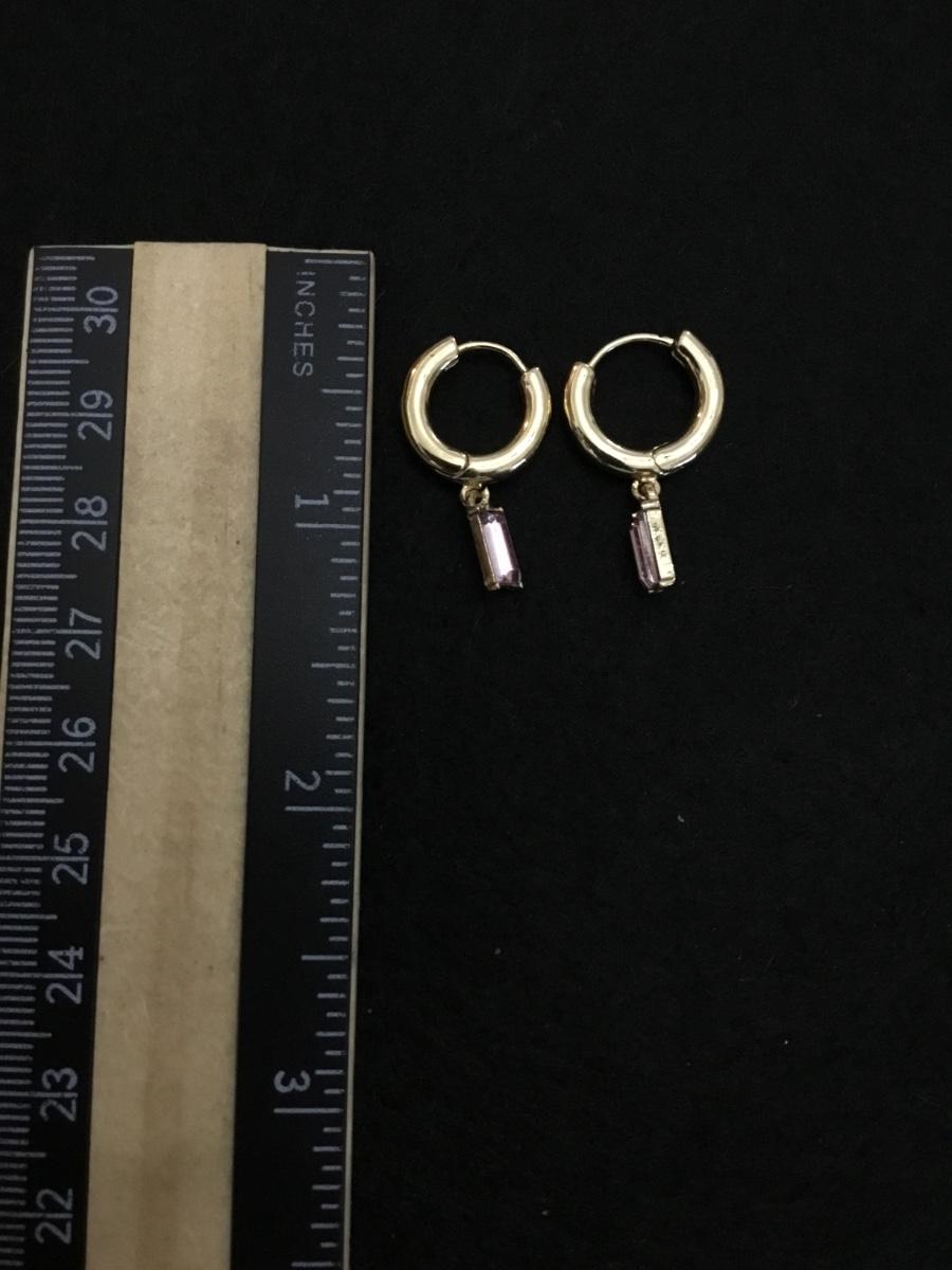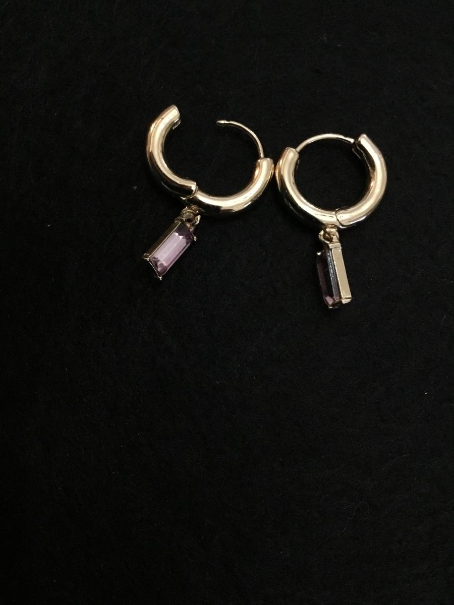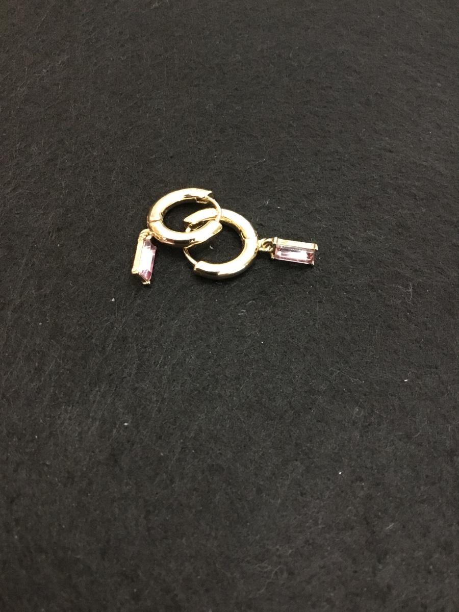 Super cute gold tone hoop earrings with pink rhinestone charm