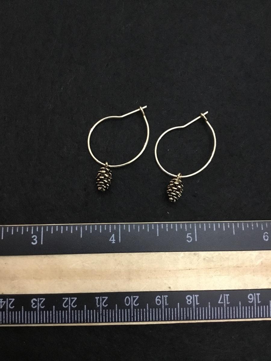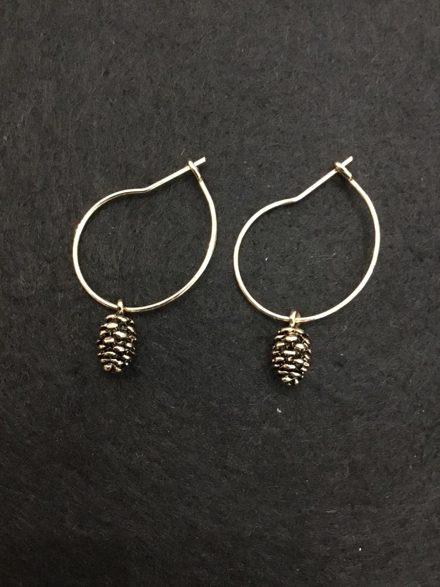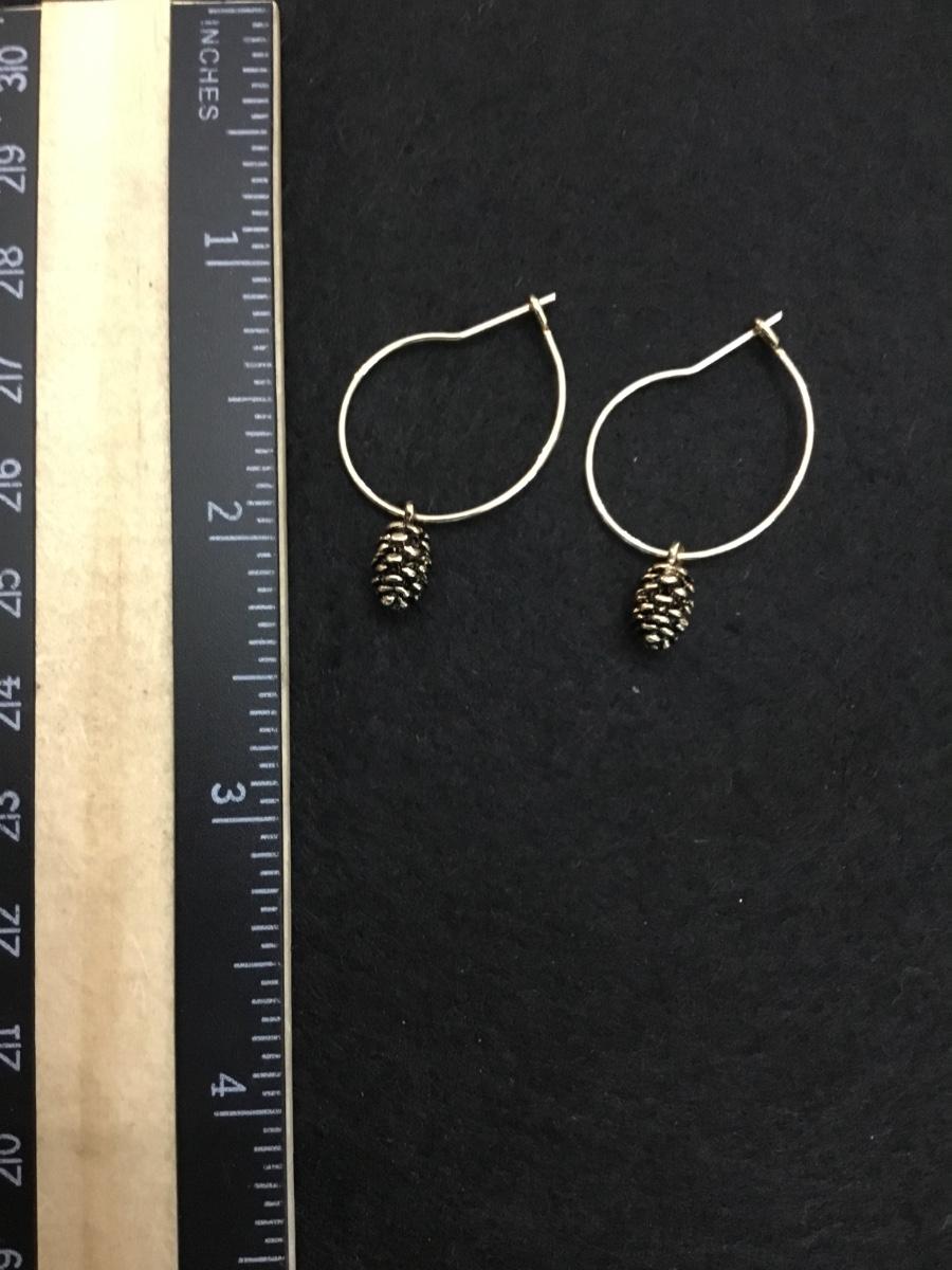 Super cute gold tone hoop earrings with pine cone charm