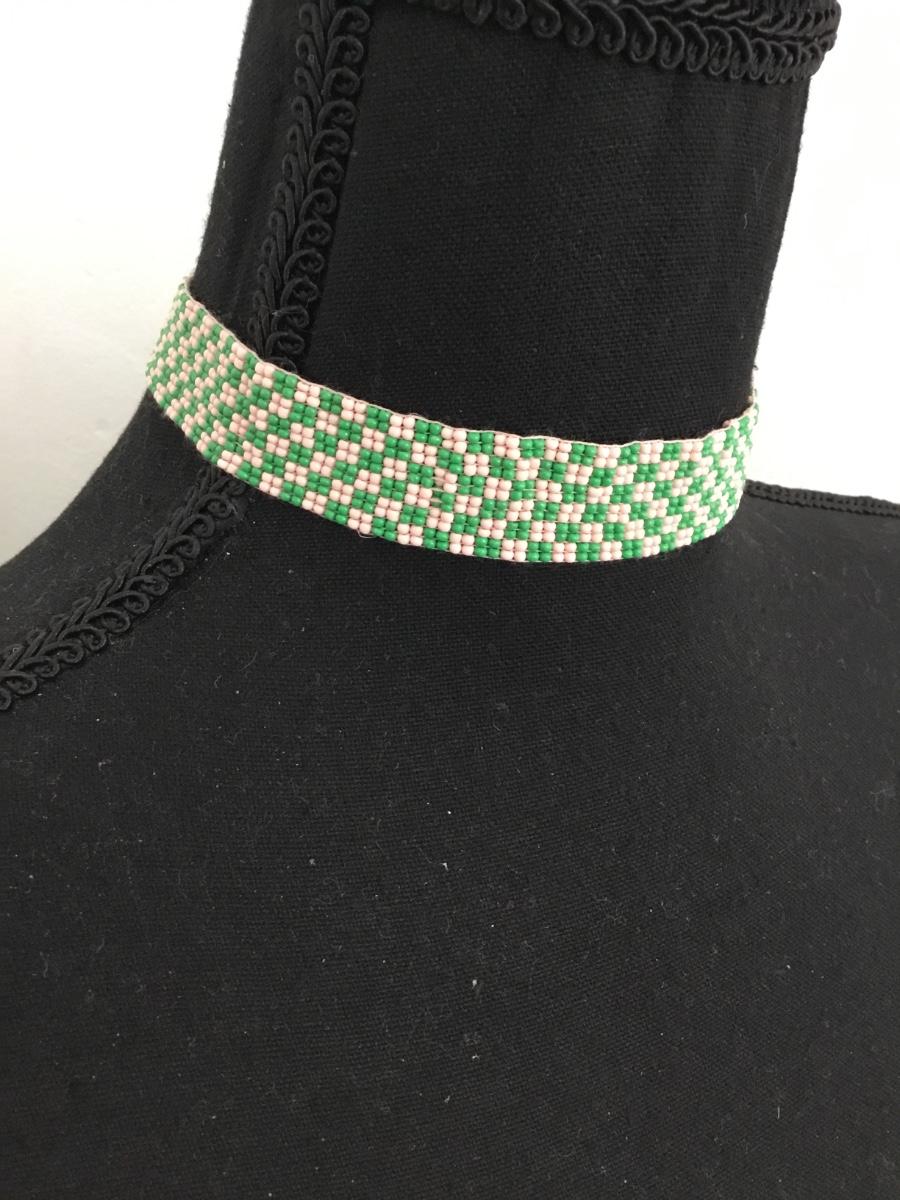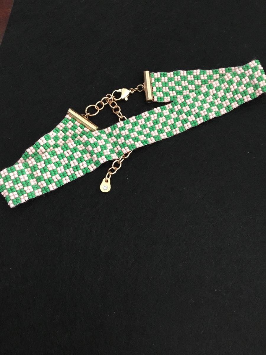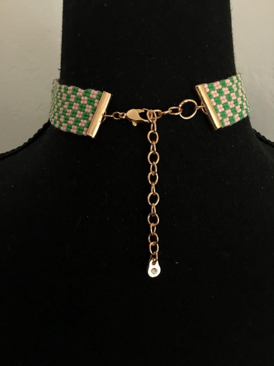 Super cute green and white pale pink seed bead thick choker with gold tone class necklace