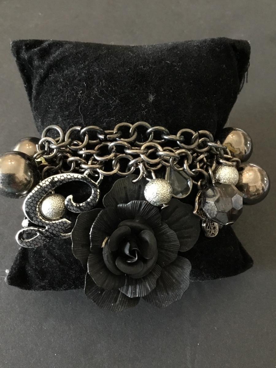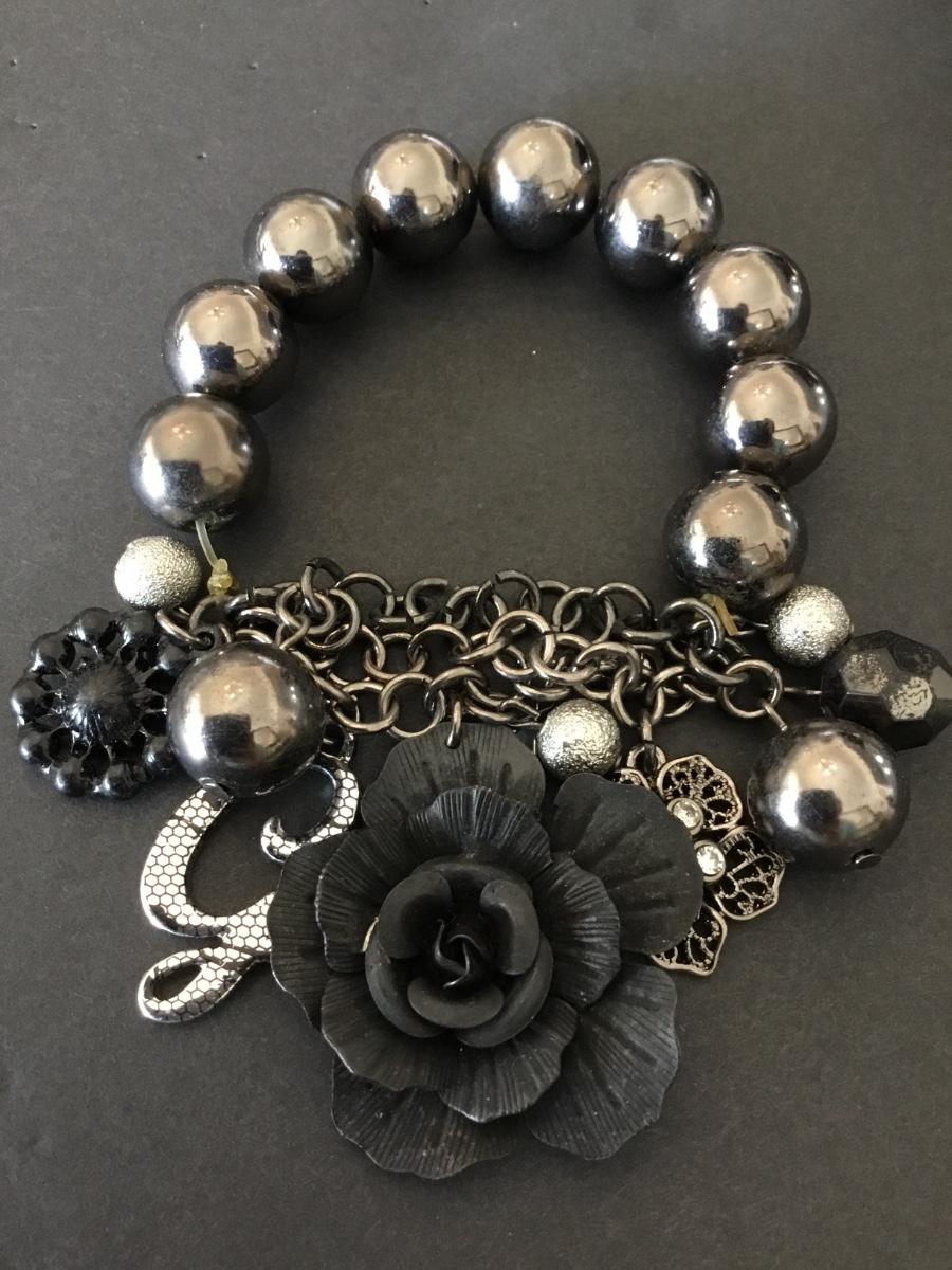Super cute, gunmetal, gray guess flower charm stretch bracelet