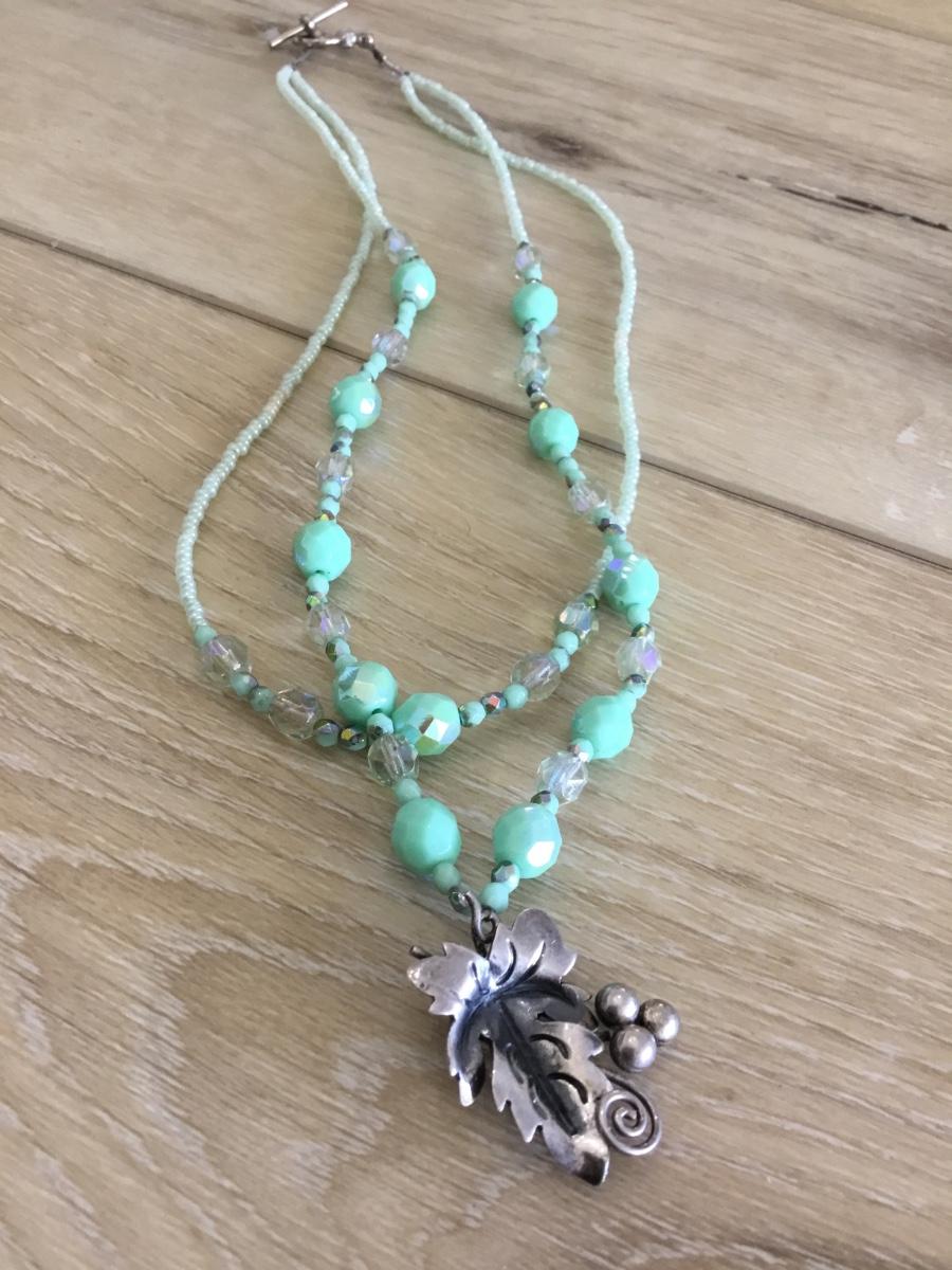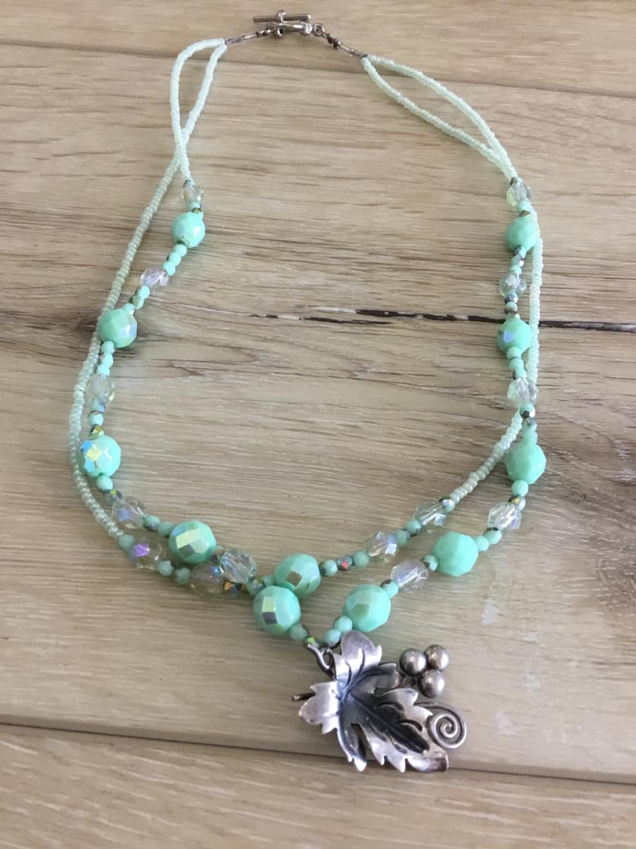 Super cute, mint color bead necklace with silver toned leaf pendant