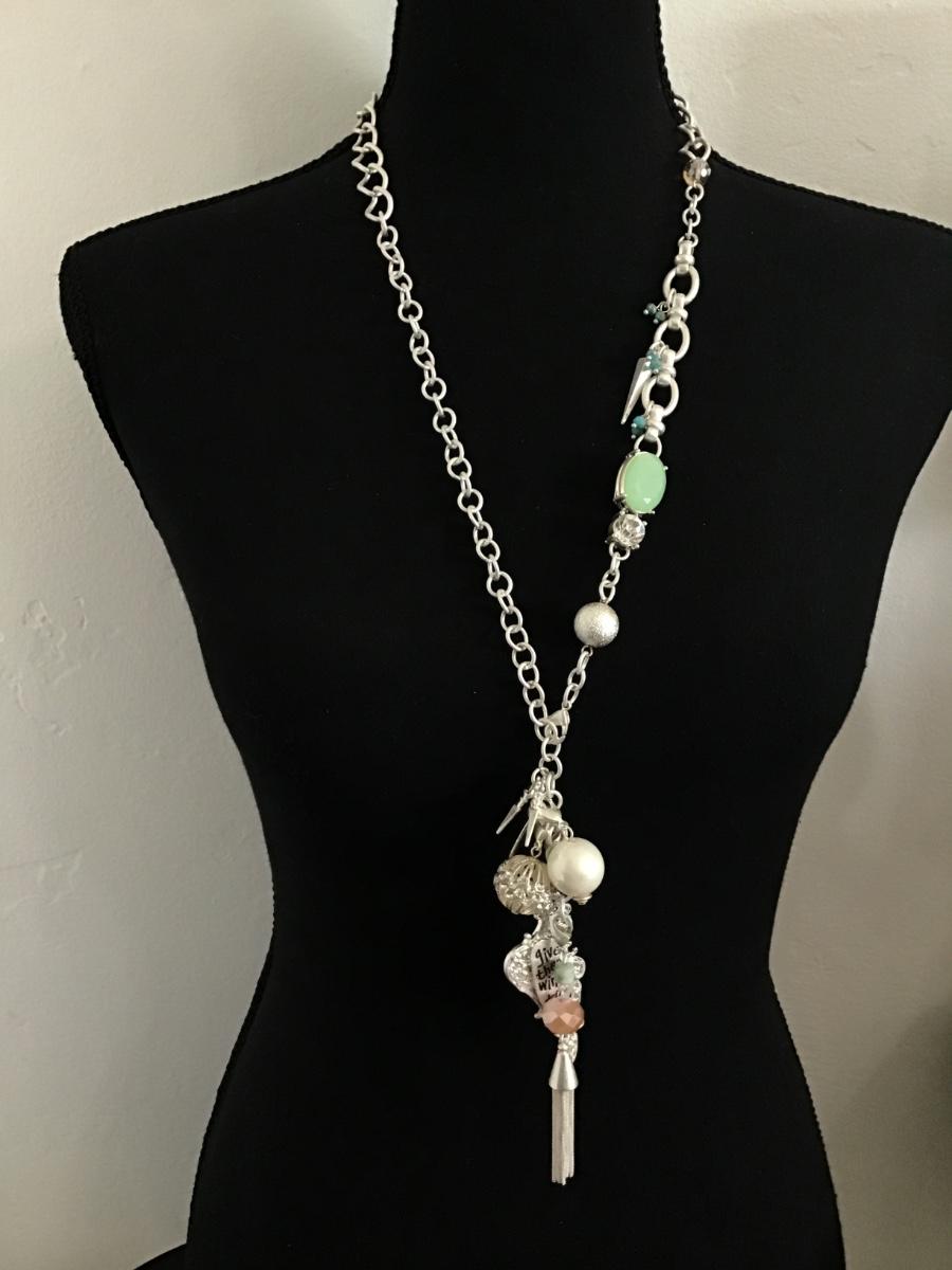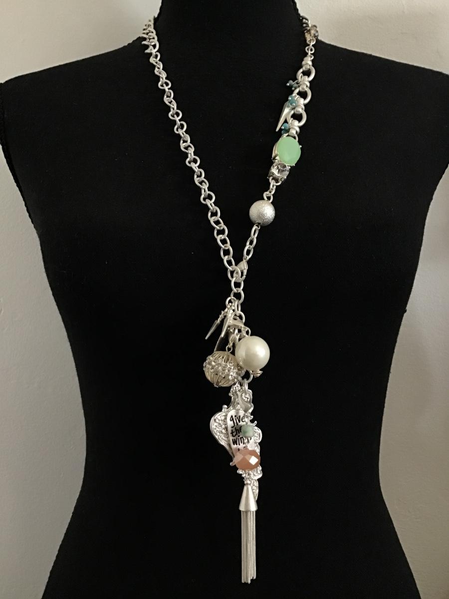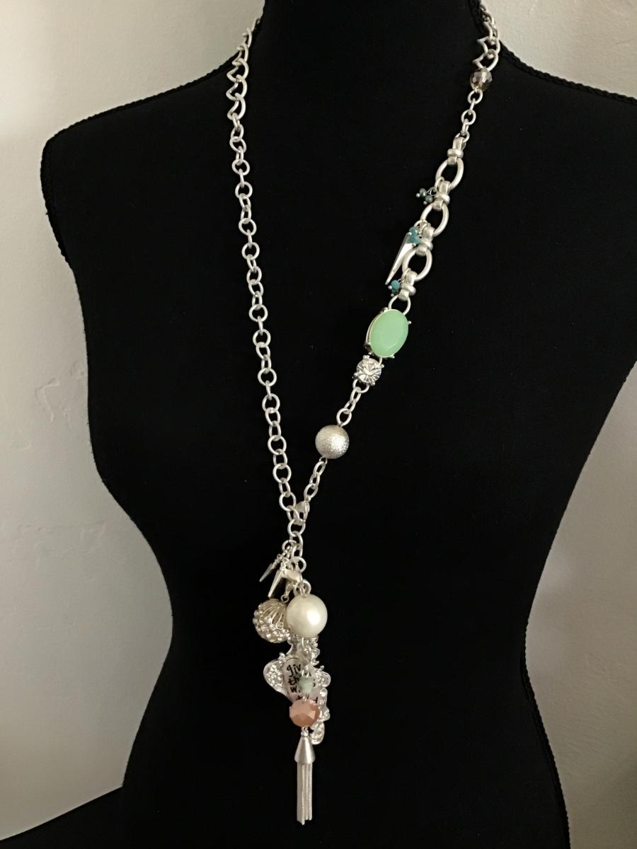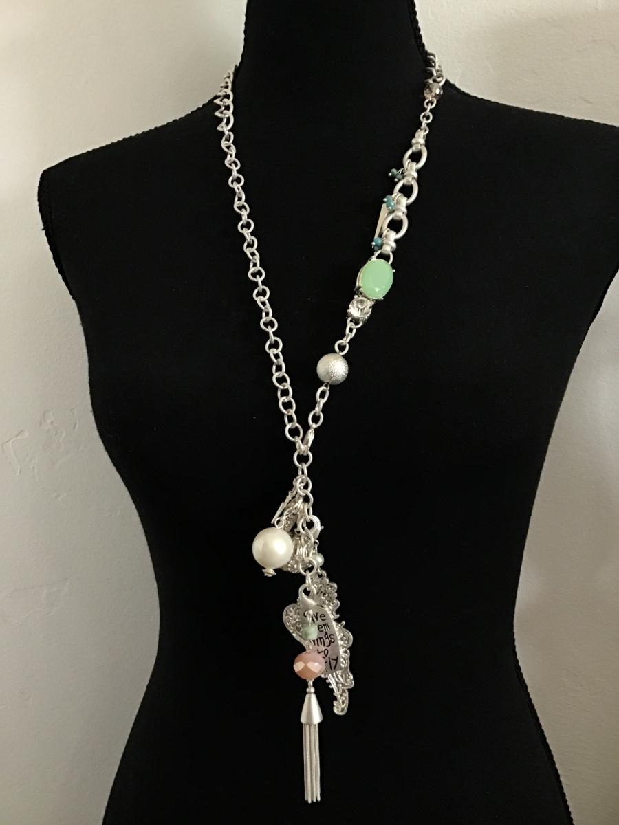 Super cute Silver chrome, toned, sea green rhinestone, tassel, charm statement, necklace, by plunder