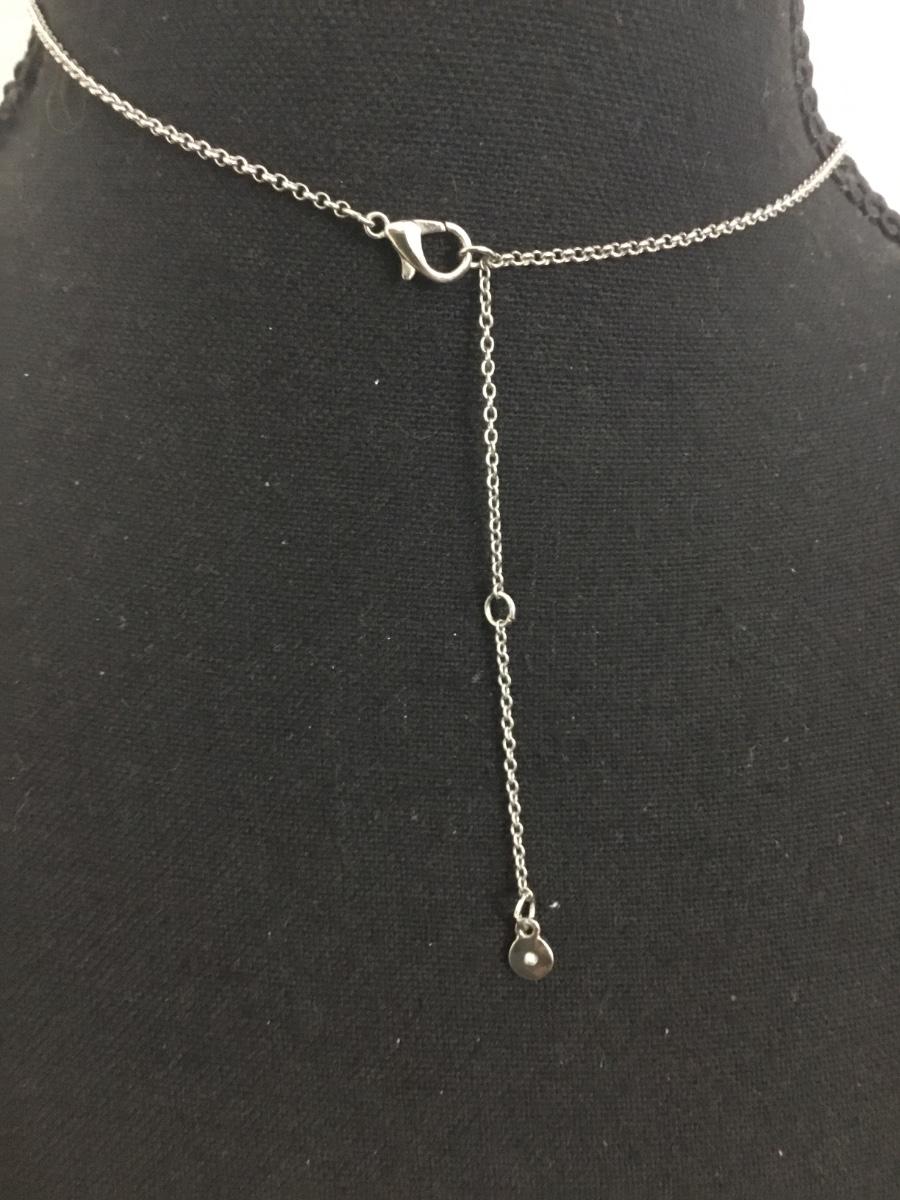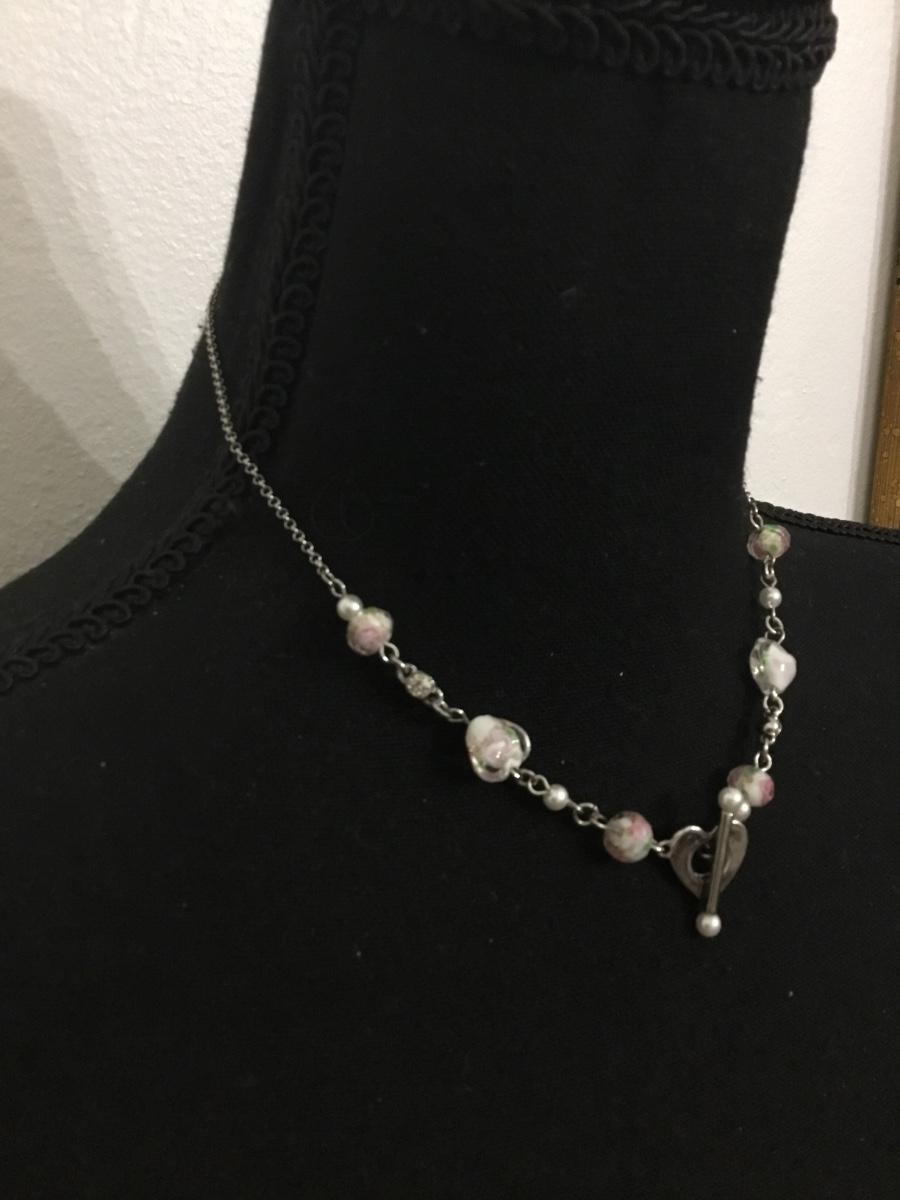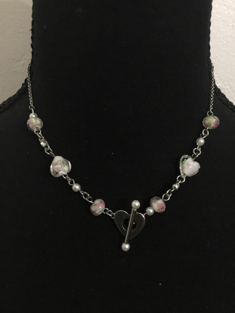 Super cute, silver tone, chain necklace, heart glass rose bead & toggle clasp