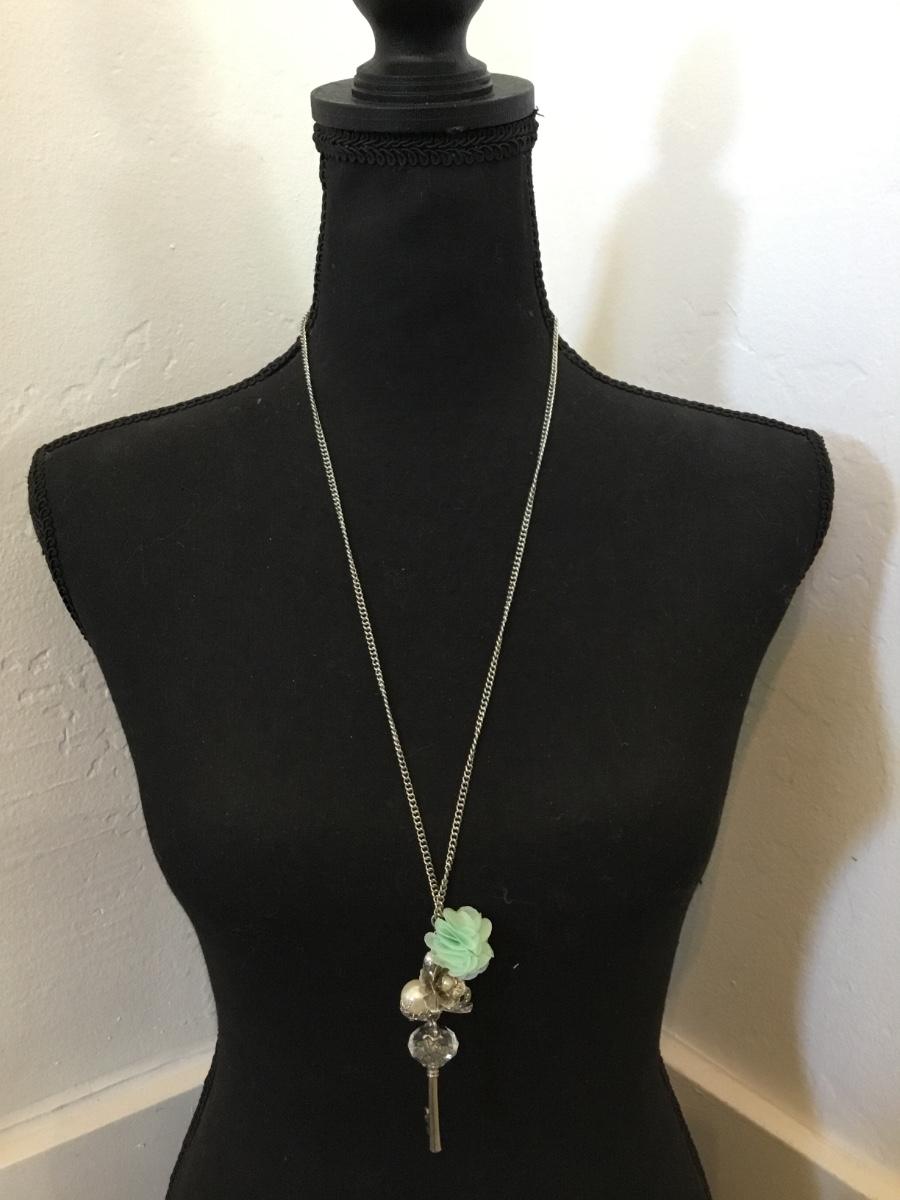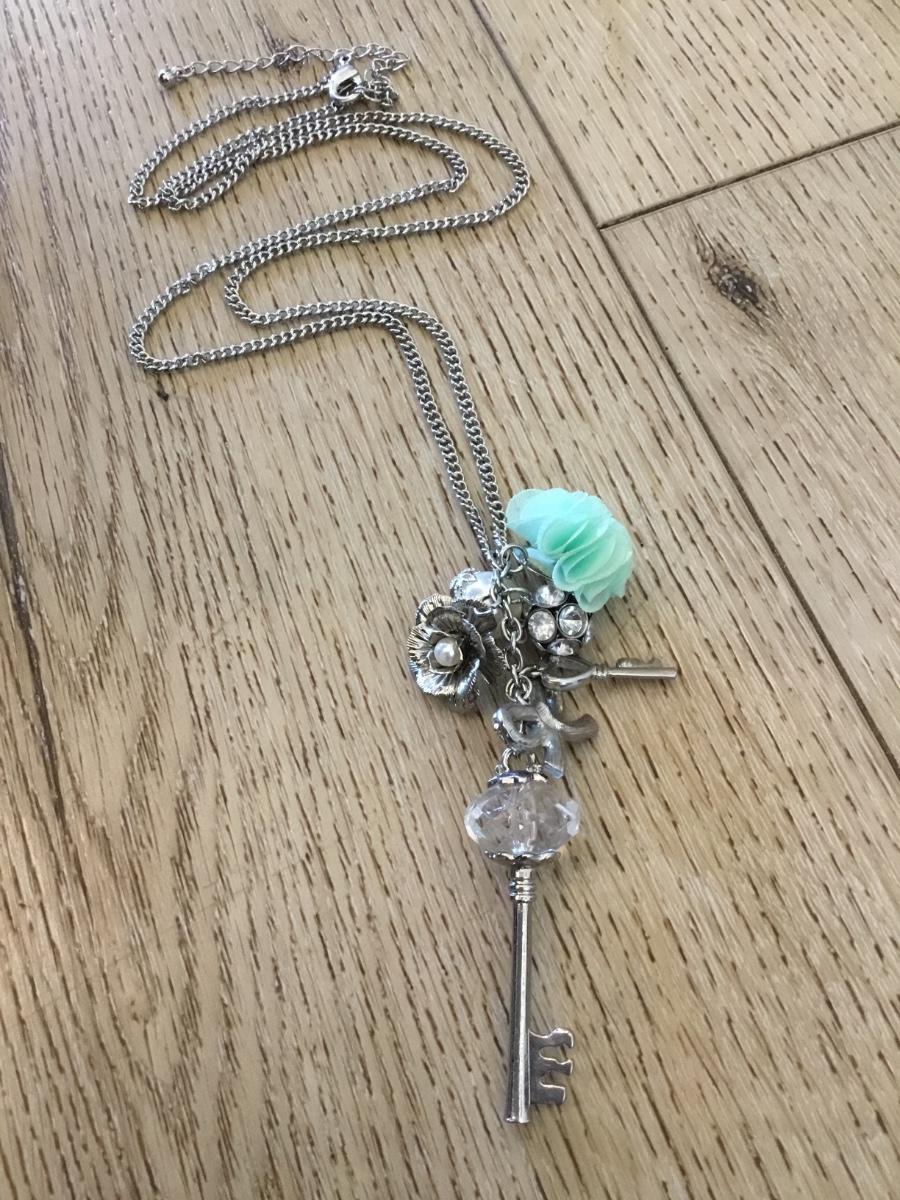 Super cute Silver tone rhinestone key charm, flower, charm necklace