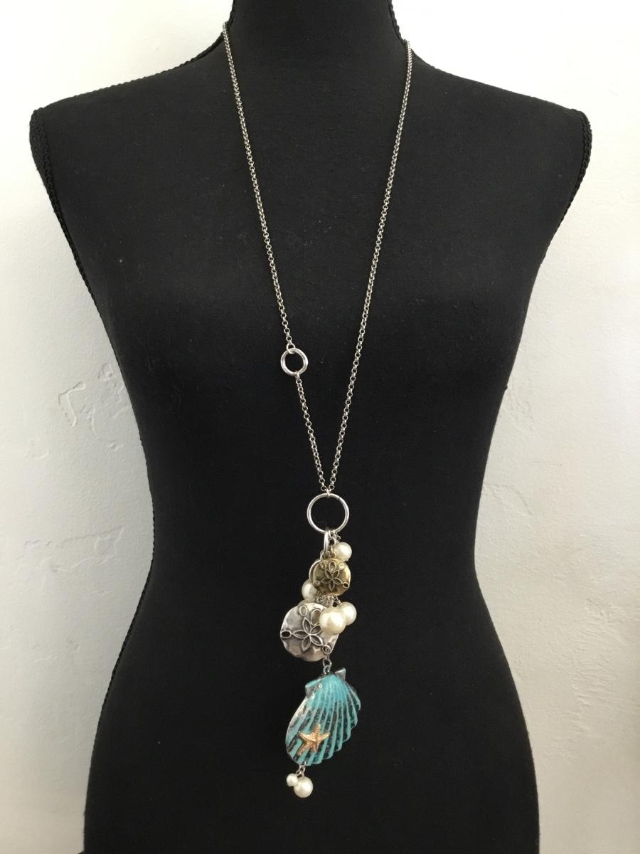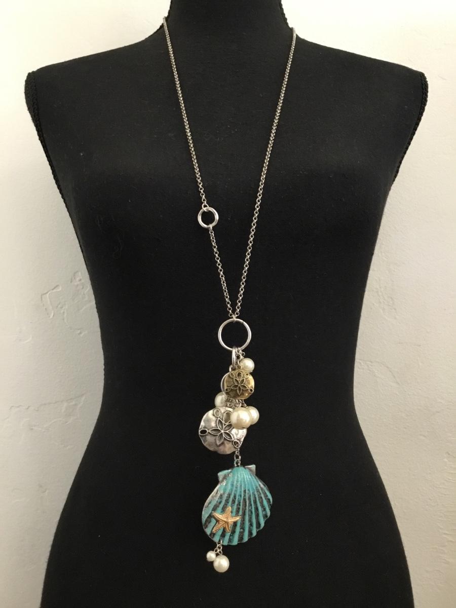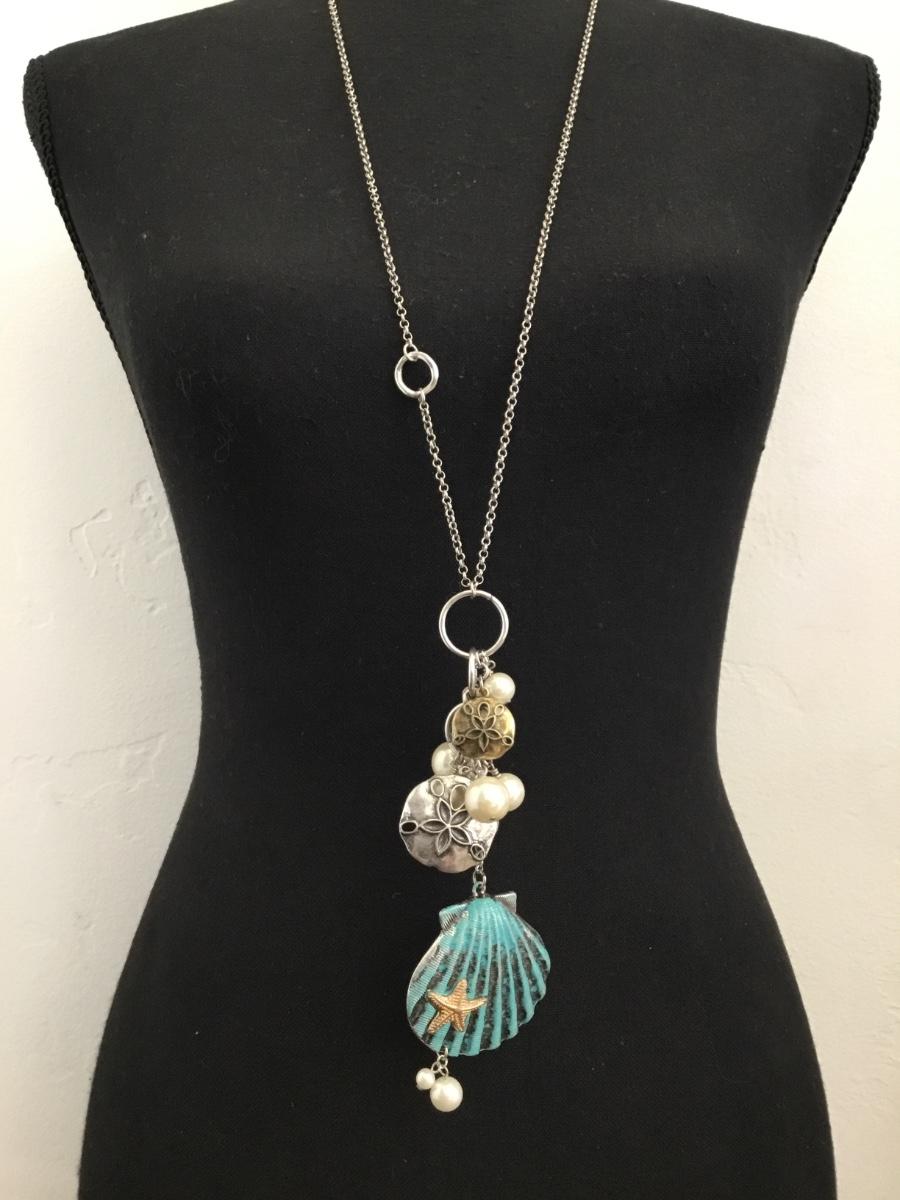 Super cute, silver toned, faux, pearl, clam, pendant statement, necklace